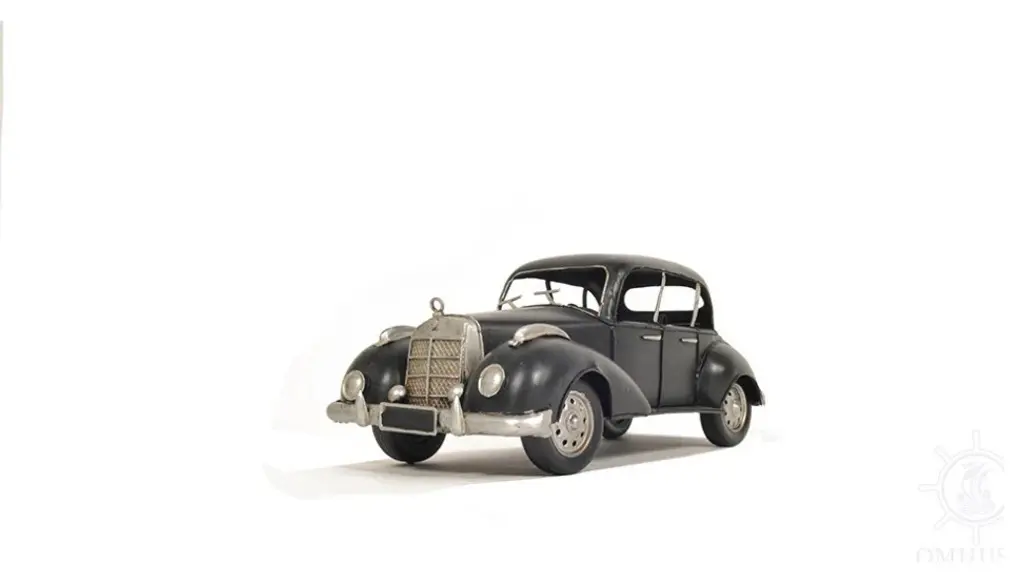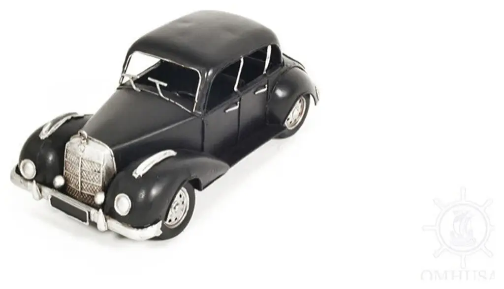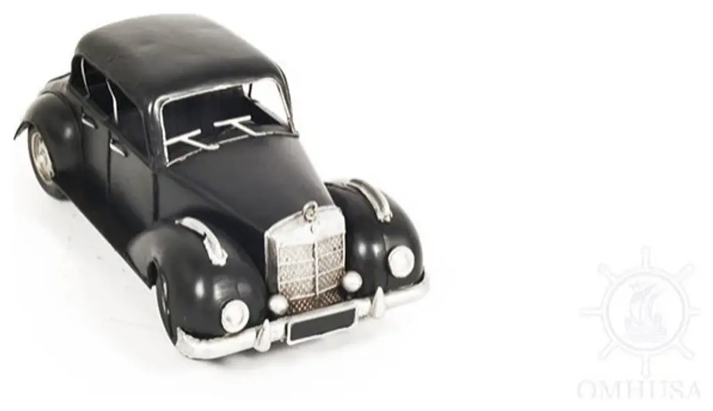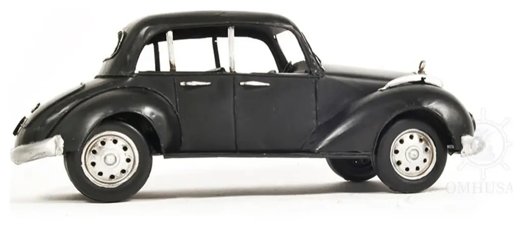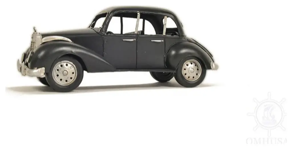 An authentic replica of one of the most iconic cars of the 1930s, the c1937 Plymouth P4 Deluxe Black Sculpture is a sought-after model for all collectors and automobile enthusiasts. Handcrafted from metal, painted in the classic black, and meticulously detailed, this model features rolling wheels, headlights, turn signals, a steering wheel, and the distinctive big fenders of the era. It is a great conversation starter and an excellent piece for any vintage car collection. 4.5" x 12" x 6"