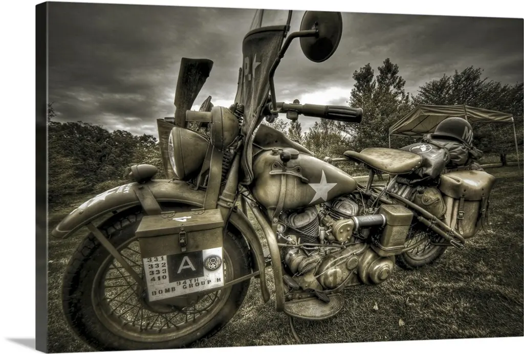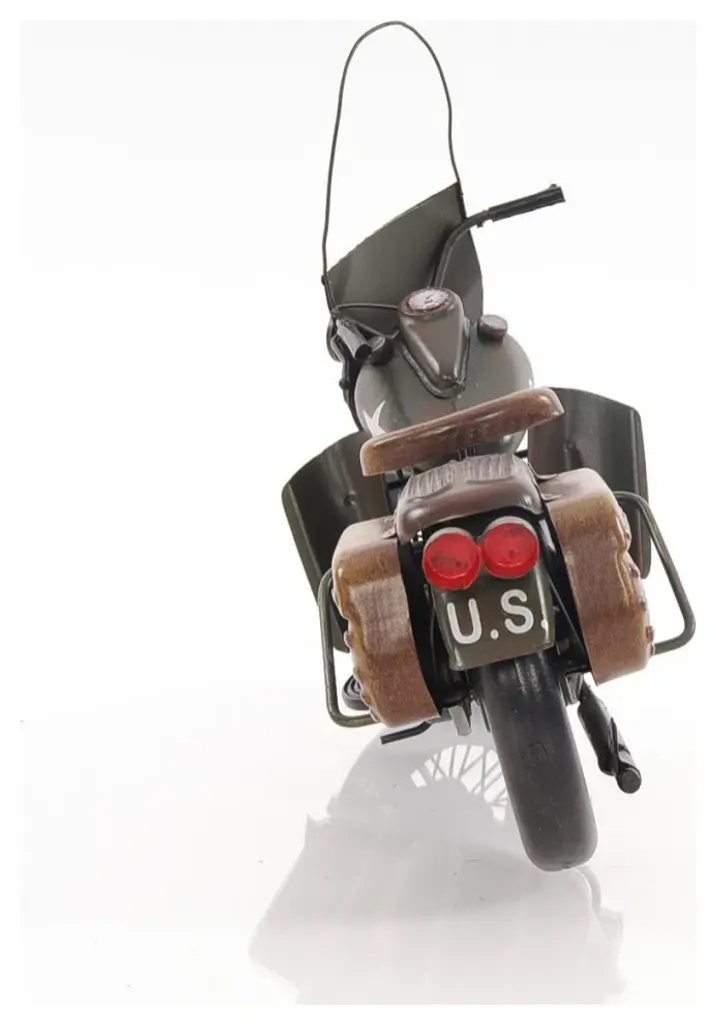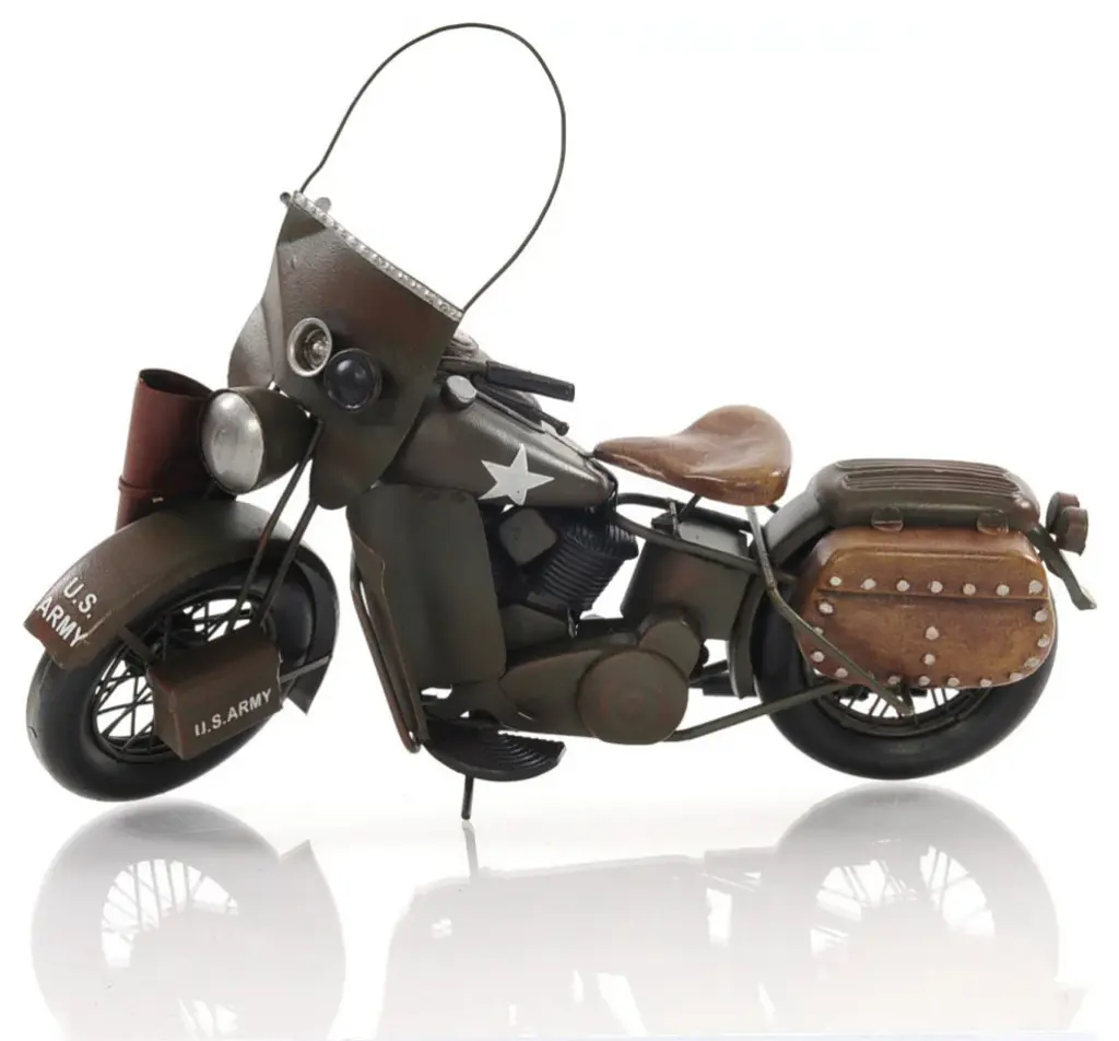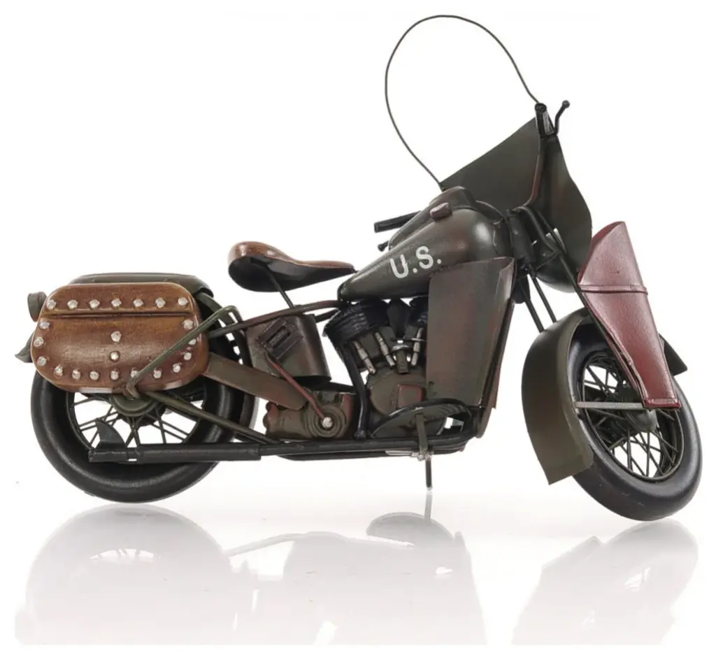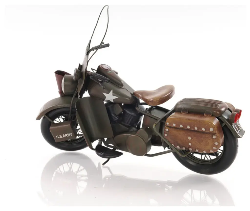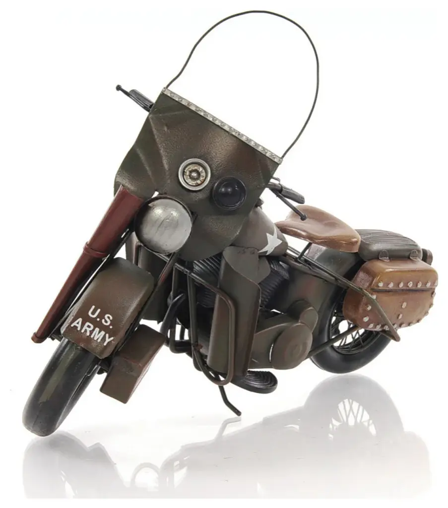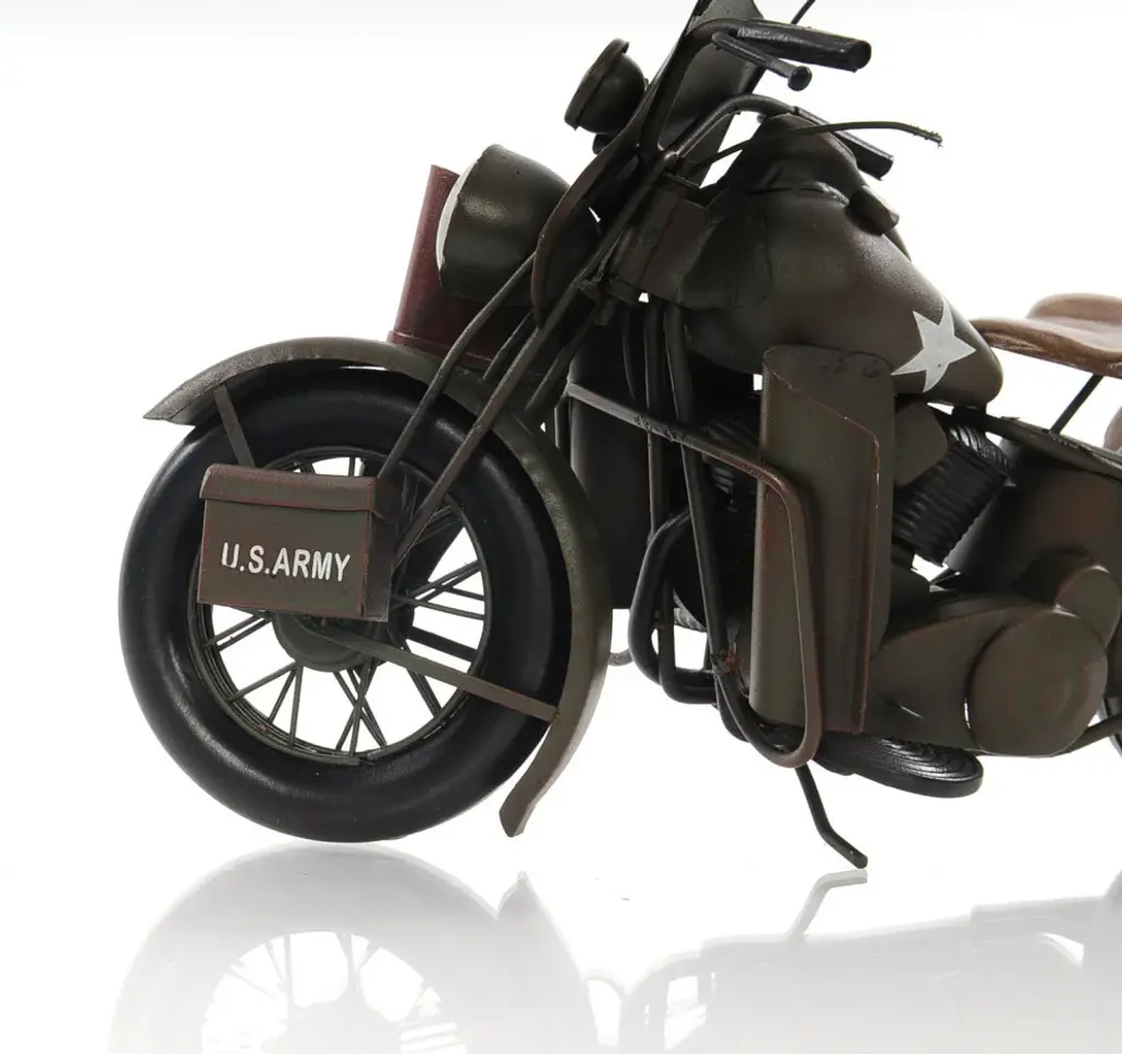 Authentic and realistic, the c1942 WLA Harley Davidson Sculpture is a 1:7 scale replica of the iconic bike built for military use in WWII. It features Harley''s original V-twin engine design and super cool U.S. Army markings. Handcrafted out of metal, it features all the original details of the bike. The spoke rolling wheels, pedals, and exterior details such as ammo and gun pouches only emphasize the bike''s character. A great gift for bike lovers and enthusiasts. 10" x 12.5" x 4"