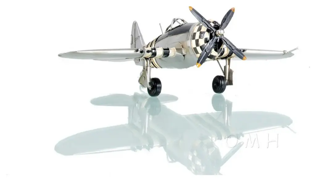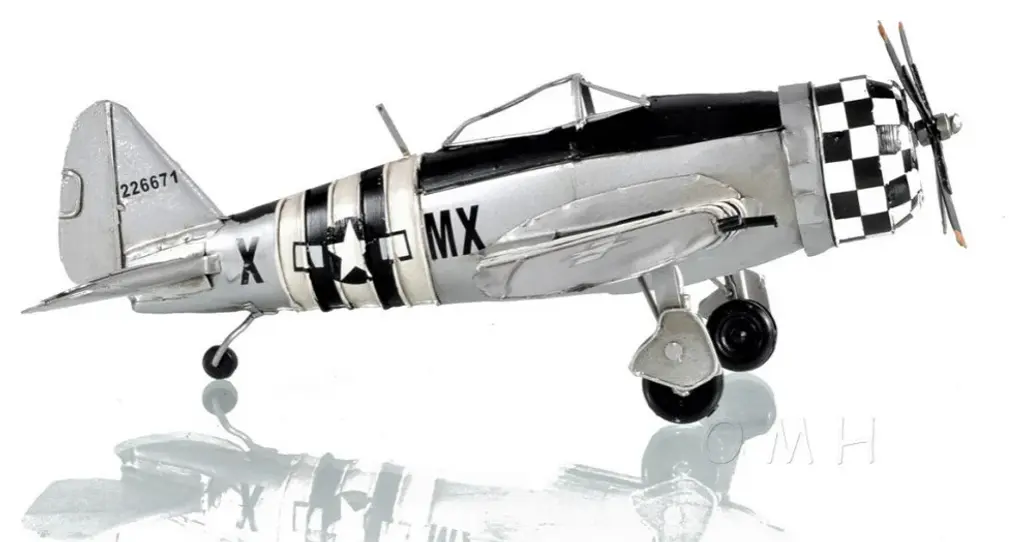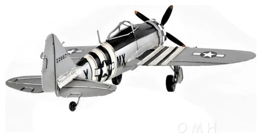 A beautiful replica of the iconic WWII American Army bomber-fighter, the c1943 Republic P-47 Thunderbolt Sculpture is handmade out of metal and accurately detailed. It comes with remarkable details such as landing wheels, a cockpit, a rotating propeller and is painted with authentic WWII paint and symbols. It is a sought-after piece for aviation and WWII enthusiasts. 4.37" x 12" x 14"