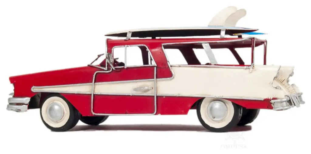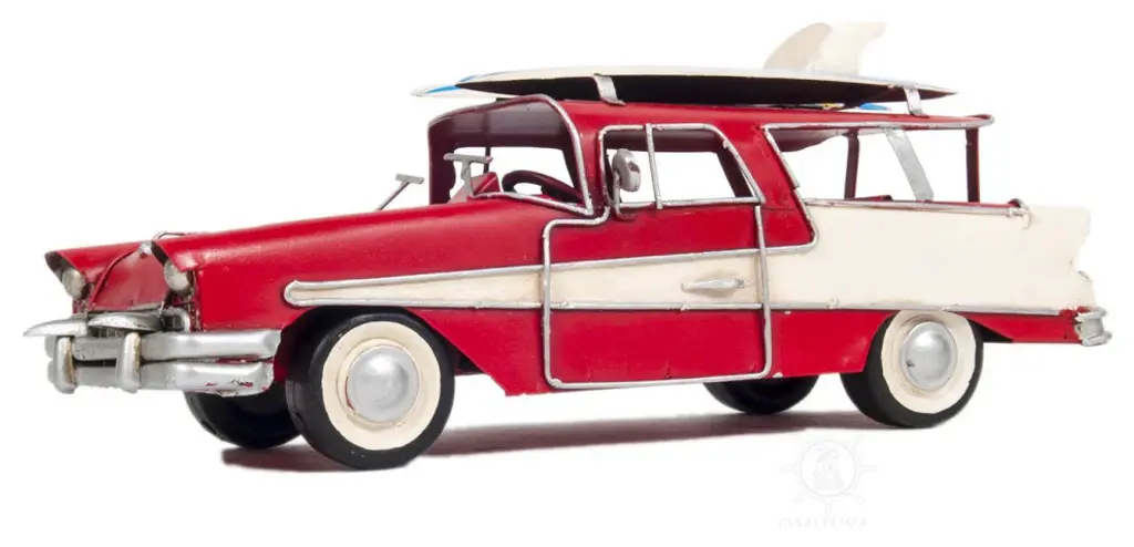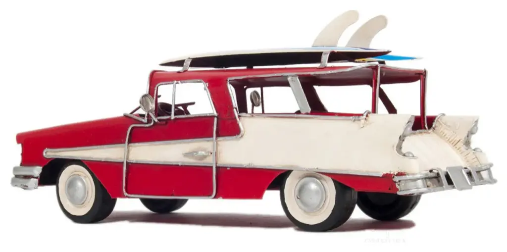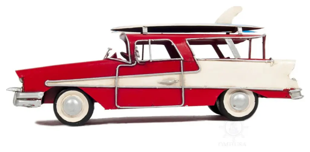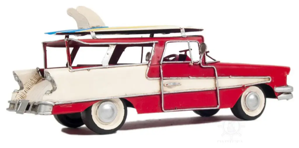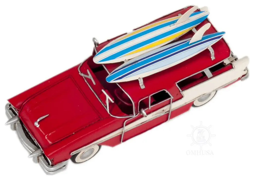 Authentic and super realistic, the c1957 Red Ford Country Squire Station Wagon Sculpture is sure to take you on a trip back in the time of America''s favorite station wagon. Handcrafted entirely out of metal and handpainted in red by the most skilled artisans, this model is built on a scale of 1:17. It features many details of the original vehicle like big fenders, rolling wheels, seats, steering wheel, and even a roof rack with two surfboards on top. A true gem of the time of the classic cars, this model is a perfect display piece. 5" x 5" x 12"
