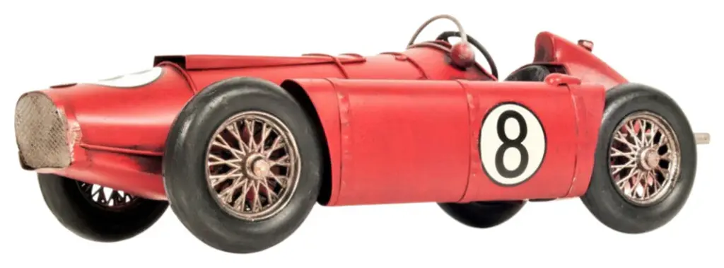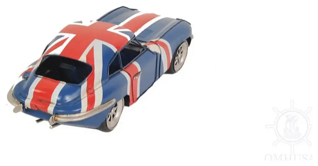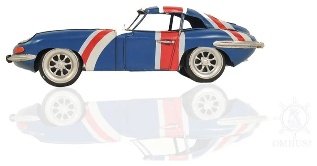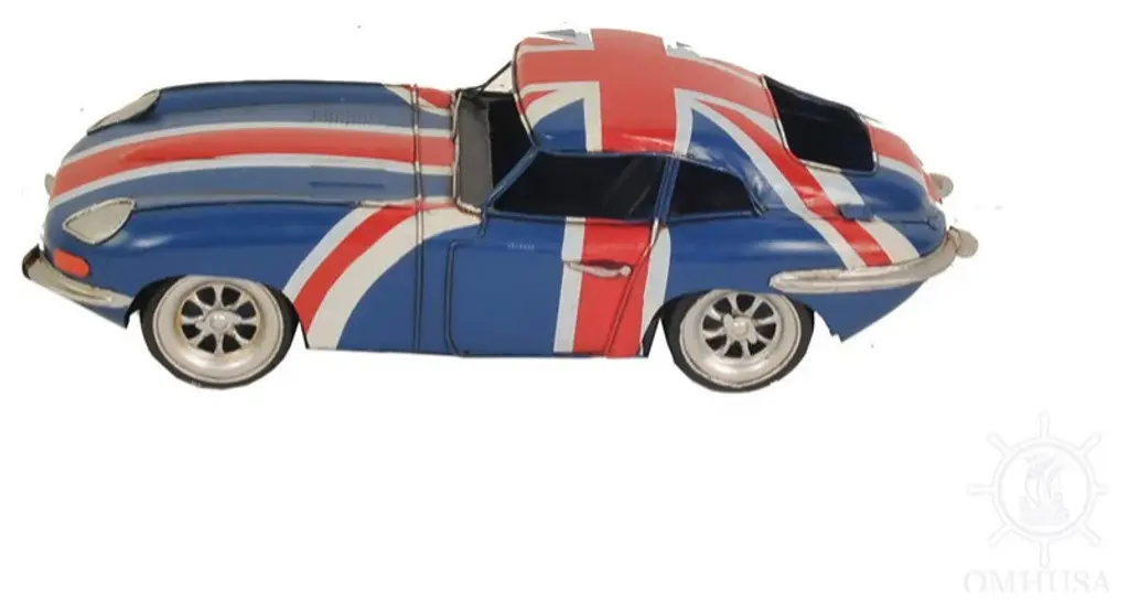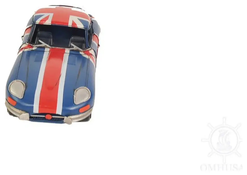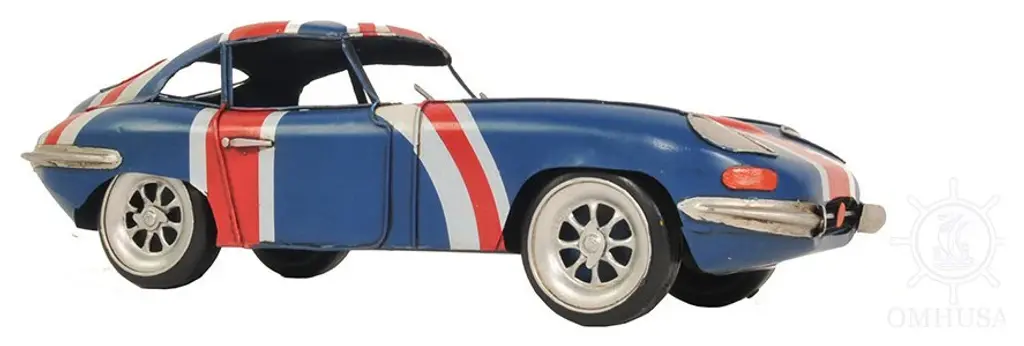 Homage to one the most popular British classic cars, the c1961 Jaguar E-Type Sculpture is an authentic replica of this automotive icon with unprecedented beauty and superb performance. This handmade model, made 100% out of metal features many original details like steering wheel, seats, and bumpers. This sculpture with a British flag paint is an exact replica of the model that featured in the Austin Powers films. Perfect gift for movie fans and automobile enthusiasts. 4" x 13" x 5"