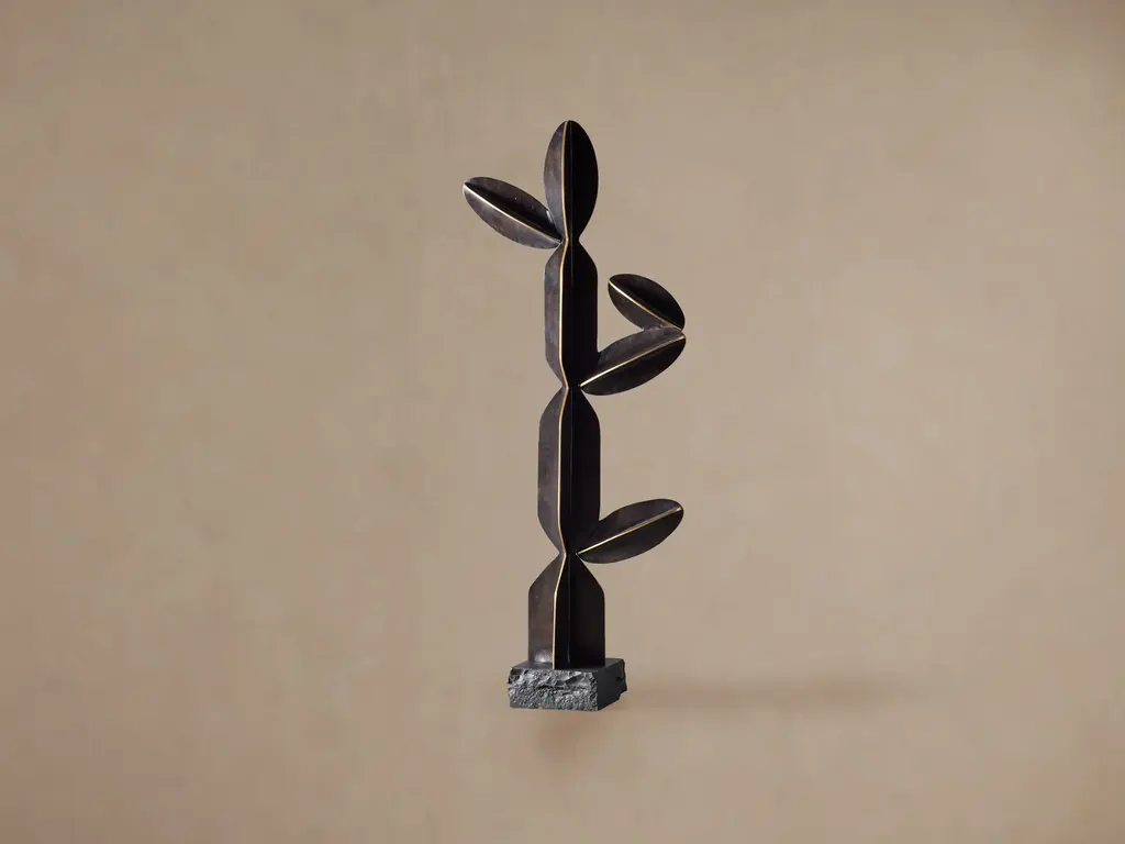 Our modern interpretation of a natural cactus plant, each outdoor Cactus Sculpture features clean lines and antiqued brass details complementing the ivy green or black finish. Crafted in India from aluminum with a natural rock base finished with antiqued brass and ivy green detailing. Sculpture is outdoor safe.