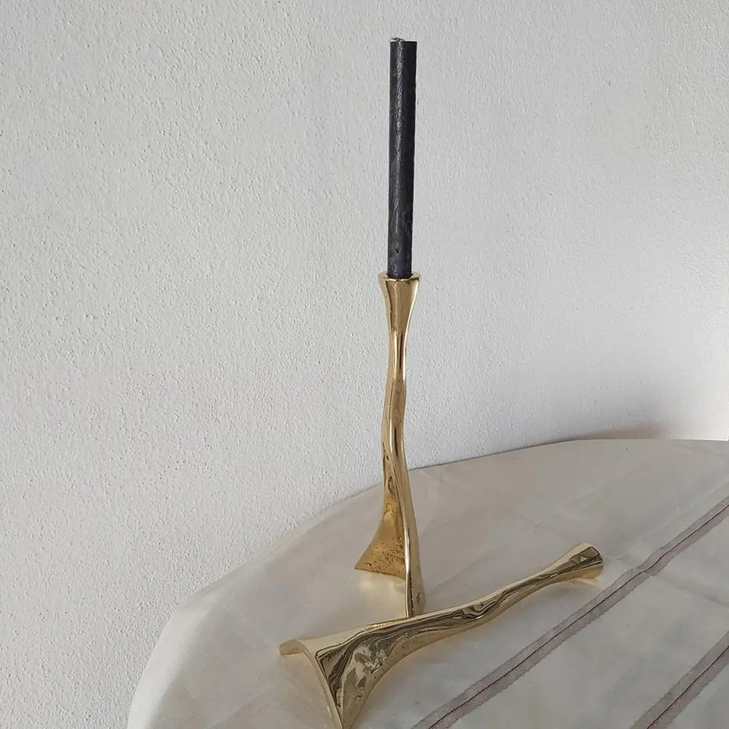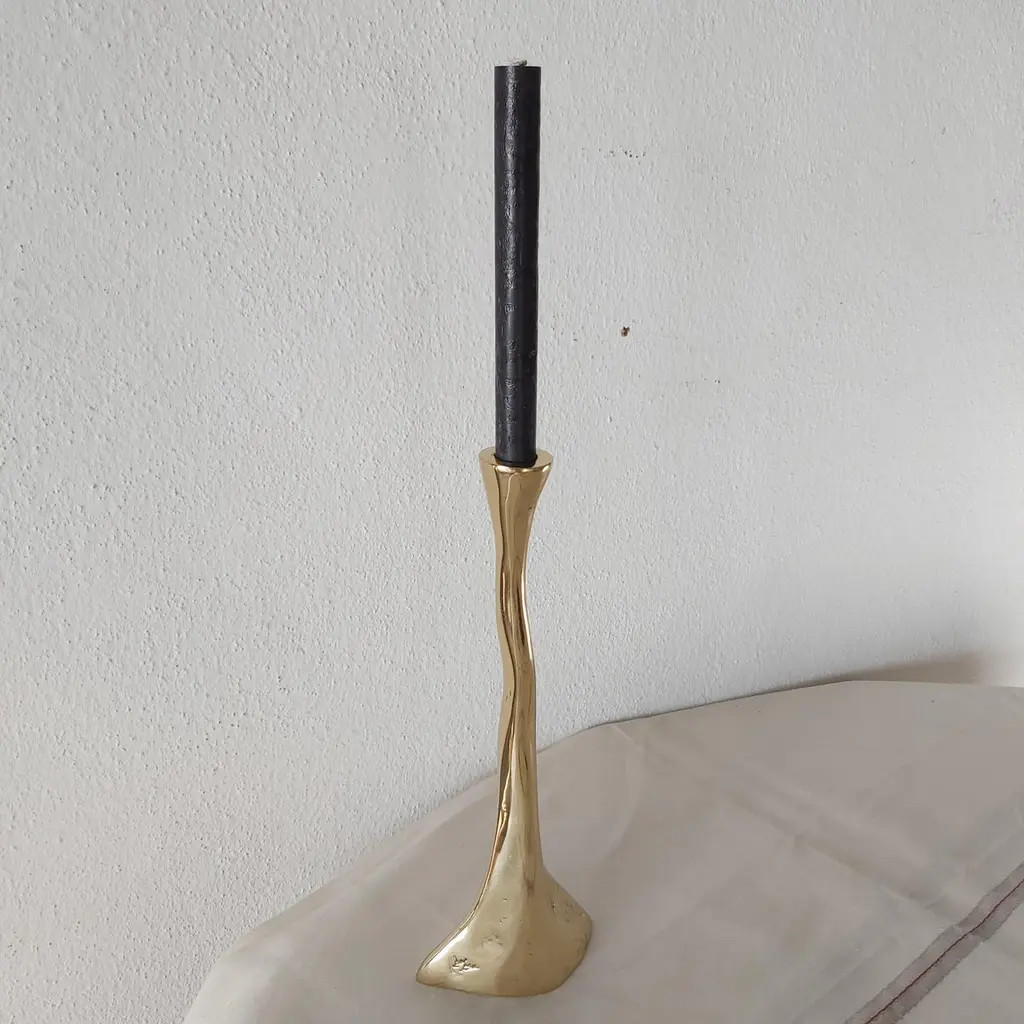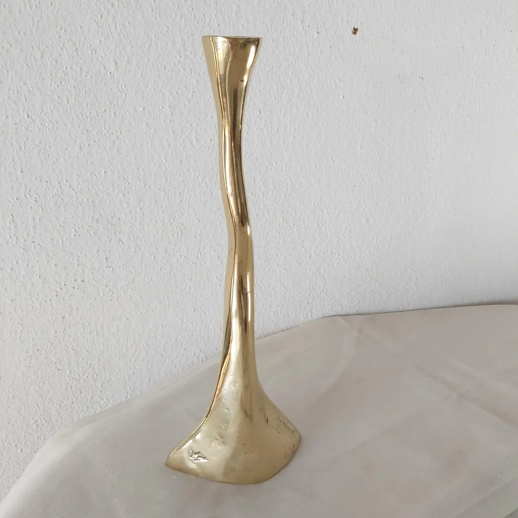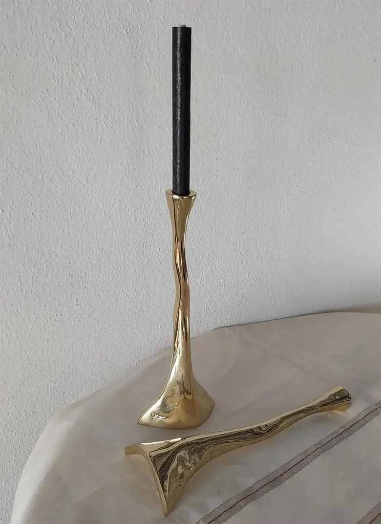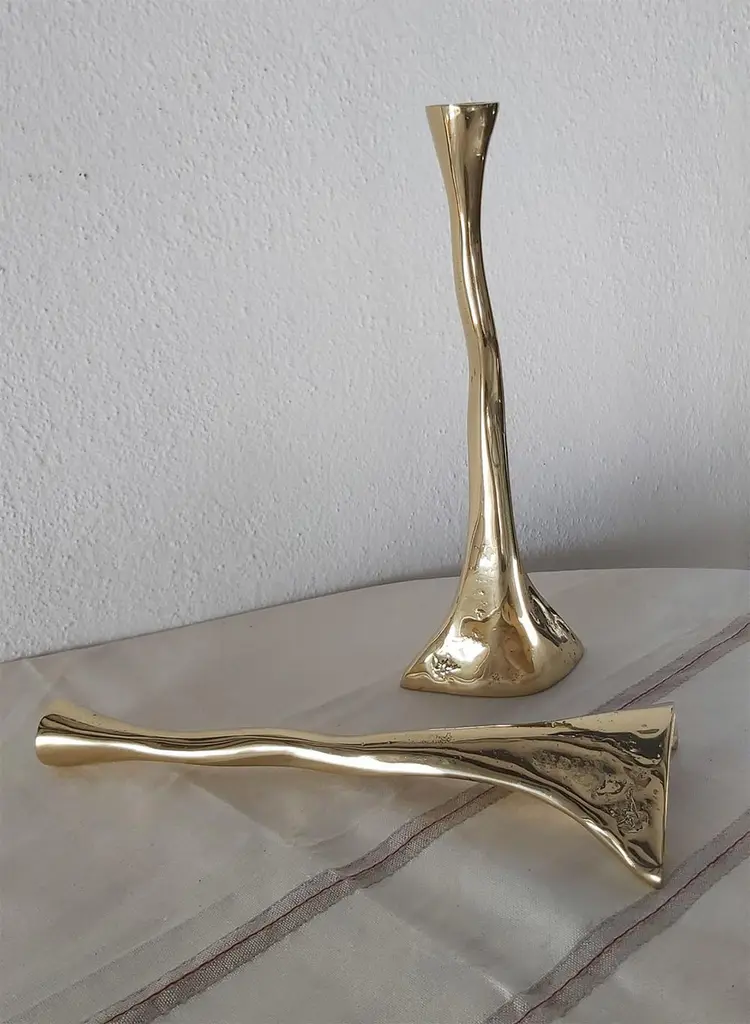 The decorative Candelabre was created by David Marshall, it is made of sand cast brass.Handmade, mounted and finished in our foundry and workshop in Spain from recycled materials.Certified authentic by the Artist David Marshall with his signature.We can engrave this piece with your Initials or Logo, makes a beautiful Wedding or Company Gift.The Artist is inspired by nature and land scape making functional art and sculptures out of recycled materials.We work with arquitects, interior designers and private clients to create specific designs, signage, staircases etc. for Homes, Hotels, Restaurants.Awards for Charity Foundations like Global Gift,Bespoke Awards for companies with engraved personal Logos, Golf Trophies for Golf Clubs like Finca Cortesin where the important Solheim Cup 2023 golf Tournament took place.One of the qualities of any sculpture and decorative design lies in the ability to bring its surrounding space into order.With more than 50 Years since his first exhibition in Spain, David Marshall has shown his highly individual work throughout Europe and United States.“ After all this years since my first show I am still fascinated by working in3 dimensions – maybe because I cant draw or more likely because sculpture holds some obtuse subconscious obligation. It is still addictive and highly satisfying despite the onus of molding, casting, welding, polishing, fitting in a tough work environment before the final satisfaction of seeing the piece come together as envisaged.Living in the mountains provides the creative impetus, being surrounded by rocks, rivers, the detritus of erosion, geomorphology and all natures destructive force has inspired an eclectic, very personal and organic bias to my work – an appreciation of random forms, diverse textures and all the unexpected creativity of the natural world where no line is perfect.”Abstract, Gold, Modern, Contemporary.