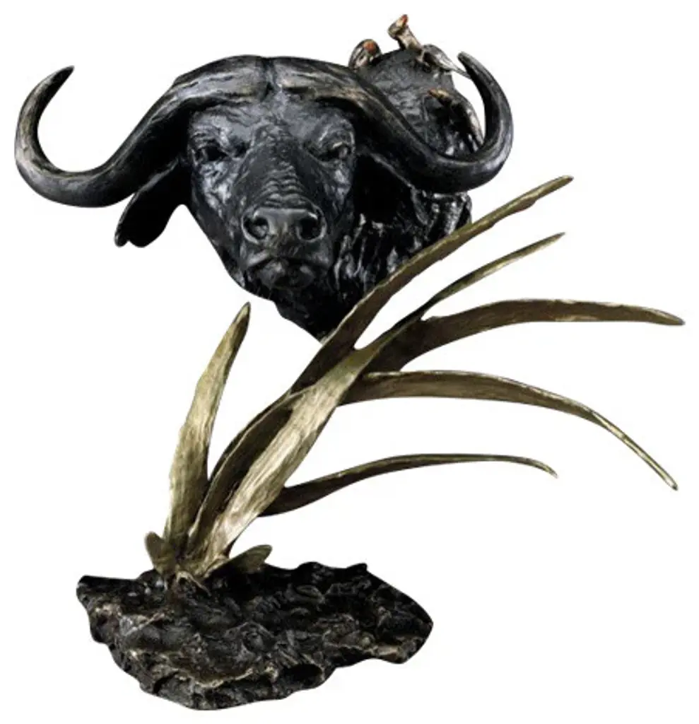 Limited Edition of 450 piecesMade by using "lost Wax" methodWeight: Approx. 23 lbs. Made in the USAAcclaimed artist Mark Hopkins'' evocative Bronze Cape Buffalo Sculpture pays powerful homage to an independent and eternally untamed denizen of the exotic wild. Part of the Serengeti Collection from the designer''s Nature Series, the Cape Buffalo Sculpture evokes the unique and unpredictable temperament of this unique creature, rendered in the finest bronze to produce a vision in amazing detail and lifelike blends of color. Give the Cape Buffalo as a very special gift for a friend or family member with a real passion for the animal kingdom, or showcase your own wild side. Crafted with pride in the USA, and limited to just 450 pieces. Internationally renowned American artist Mark Hopkins creates bronze sculptures that have thrilled collectors and casual art fans alike for more than two decades. Mark Hopkins'' unique balance of organic inspiration and singular contemporary design has been called "bronze in motion" for its fluid look, which often appears to display natural beauty in defiance of gravity. About Mark HopkinsMark Hopkins takes his inspiration for every facet of life on Earth, from the majesty of wildlife to mankind''s interaction with nature, and produces limited-edition pieces that evoke a sense of awe and respect for the mysteries and loveliness of the world around us. Collectors of his work include Barbara Mandrell, Clint Eastwood, Bill Clinton, Colin Powell, George and Barbara Bush and a host of other luminaries and corporations including the National League Association of Baseball Club Owners, the Atlanta National Golf Club, Humana, Coca-Cola and others. Each Mark Hopkins sculpture is crafted with pride in the USA. Captivated by form and design, Mark has personally created a signature style of vibrant vitality resulting from decades of study. Encouraged by parents and teachers from an early age, Mark''s unique talent developed alongside his technical skills of sculpting and casting. As an artist, Mark is constantly challenging himself to render the rich beauty of life and the deep emotion of the human soul into flowing sculptural form, noting "I strive to express beyond the image, to catch spirit, to reveal deeper emotions, and to share joy. "About the Production ProcessFrom the artist''s hand to the final polishing stages, many intricate steps go into the creation of a limited edition bronze sculpture. First the reproduction mold is made in which layers of silicone rubber and plaster are delicately applied to the original work. Then hot wax is poured into the reproduction mold to form an exact replica of the original sculpture. When the wax replica is removed from the mold, it is then inspected and refined or "chased" by hand to remove any imperfections that may have occurred in the reproduction process. Next, ceramic cup and wax sprues, or gates