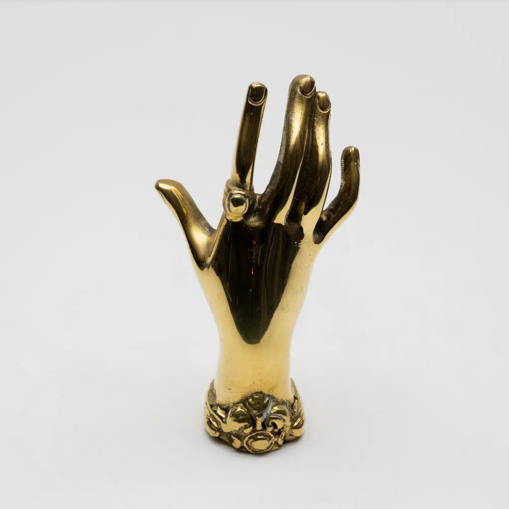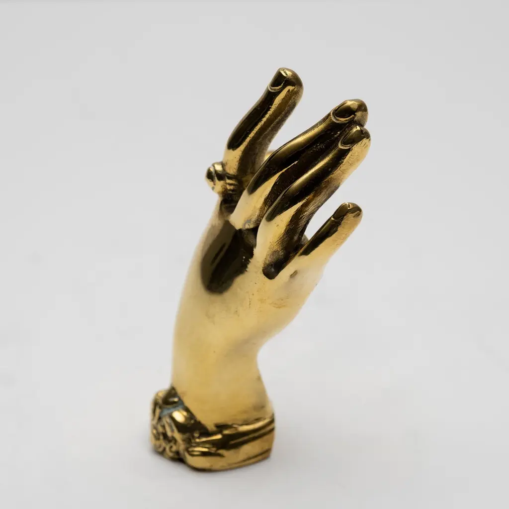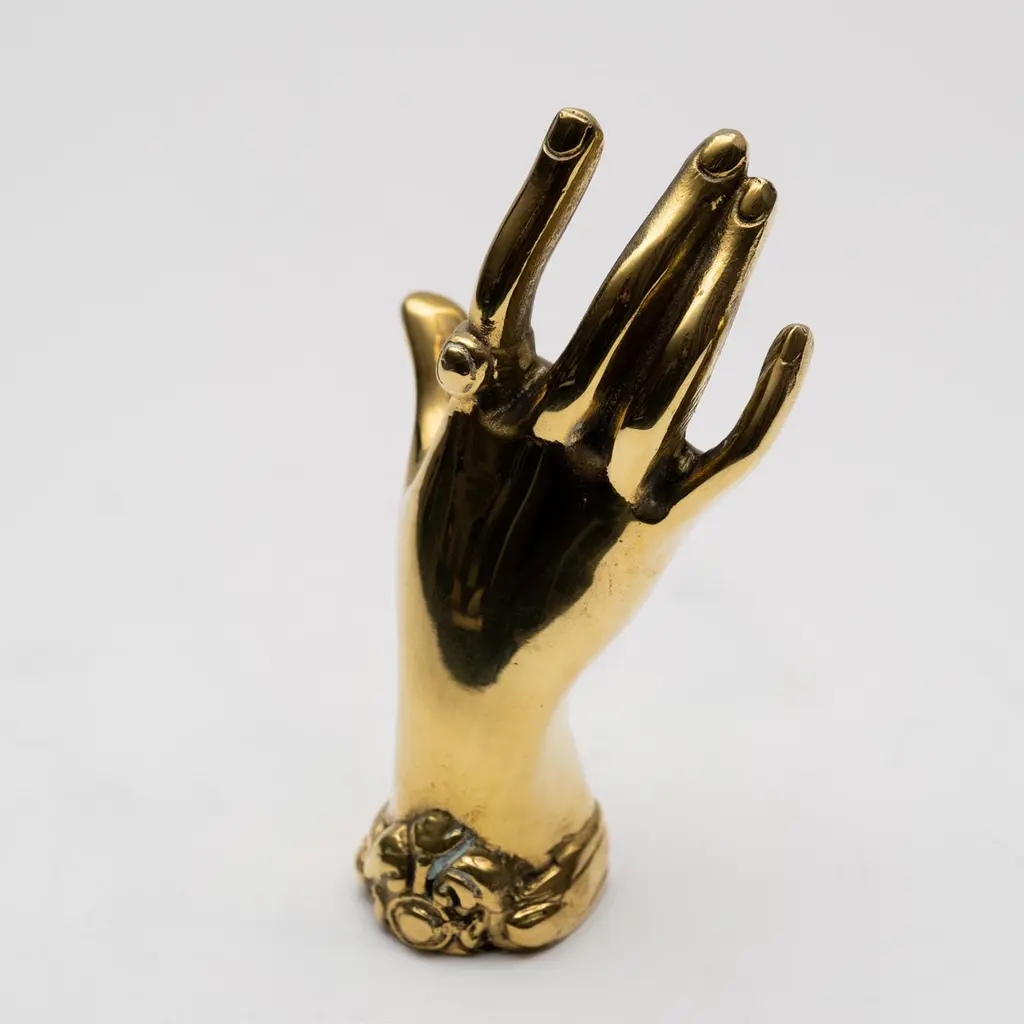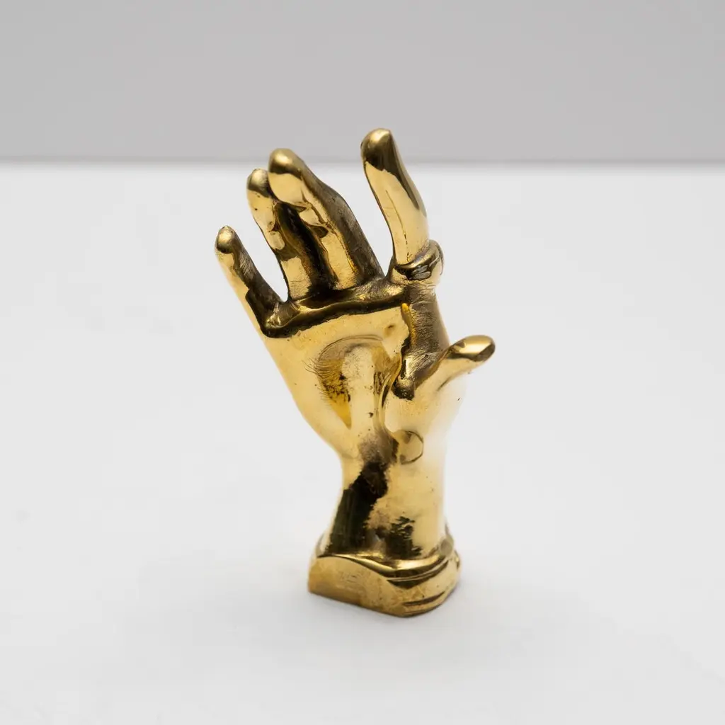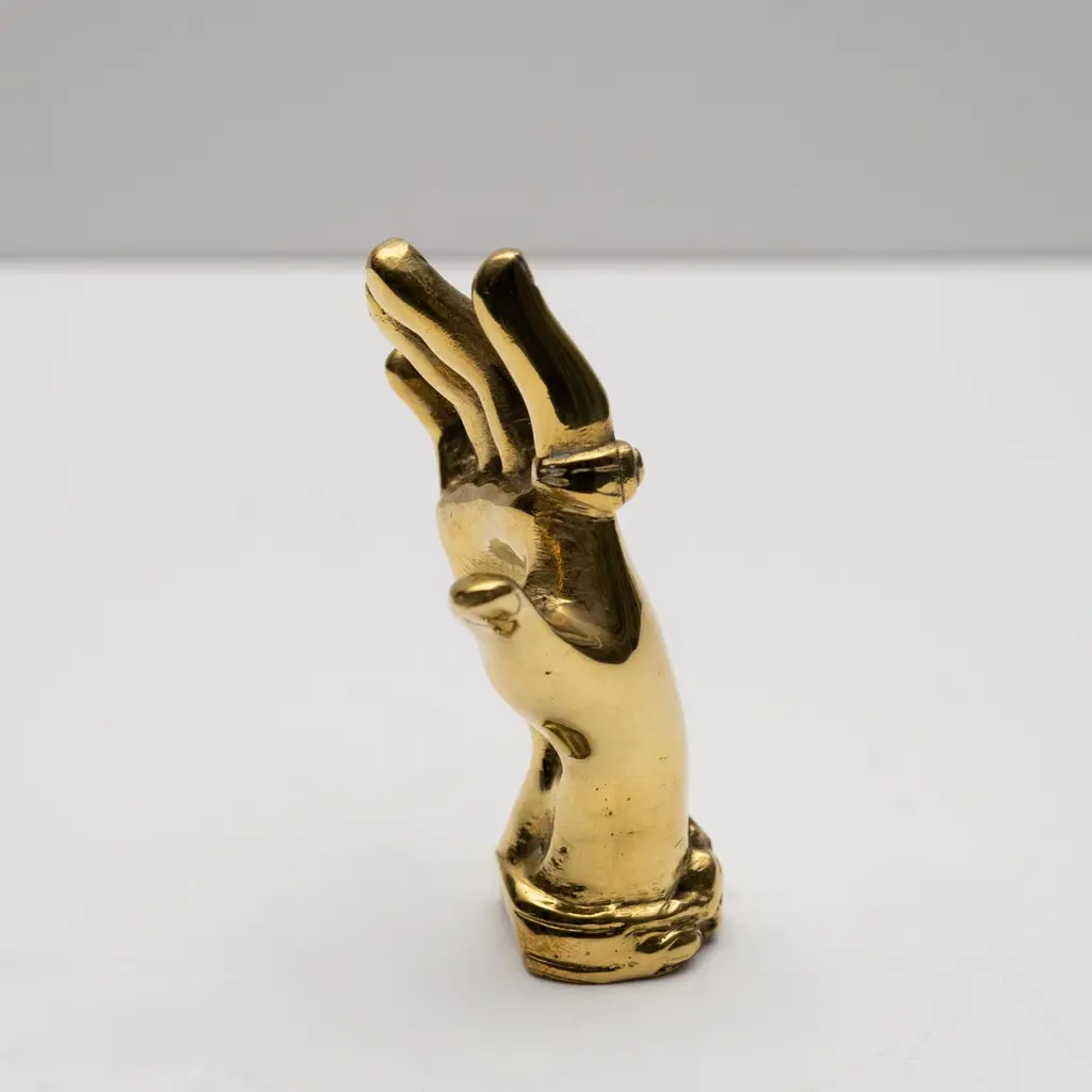 Carl Auböck Model #5275 'Zumbusch Hand' Brass SculptureDesigned in the 1950s, as an homage to German sculptor Kaspar von Zumbusch, this incredibly refined and sculptural bejeweled hand is executed in polished brass. This piece makes a beautiful gift for collectors or design lovers. The sculpture can stand up or rest on its side to serve as a catch-all.Price is per item. Available in unlimited quantities.One in stock and ready to ship. In-stock availability subject to change at any time. Allow additional 2-3 weeks or more for items not in stock. For time-sensitive orders, kindly inquire prior to purchasing.Produced by Carl Auböck IV in the original Auböck Werkstätte in the 7th district of Vienna using the same exacting standards, high-quality materials, original molds and techniques of his legendary grandfather. Auböck's design career was long and varied, reaching its pinnacle of prestige at the Triennale di Milano in 1954, where he received four gold medals in recognition of his iconic work.Please note that only one representative example of each item is shown in the images. Finish varies from item to item due to the handmade nature of their fabrication and due to the unique chemical patination process, which is meant to simulate 80-100 years of exposure of brass to sunlight.Made to order.