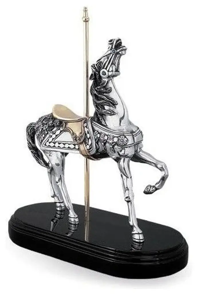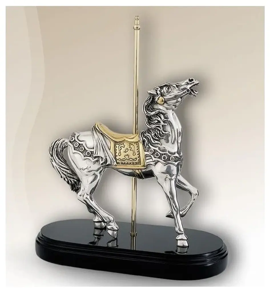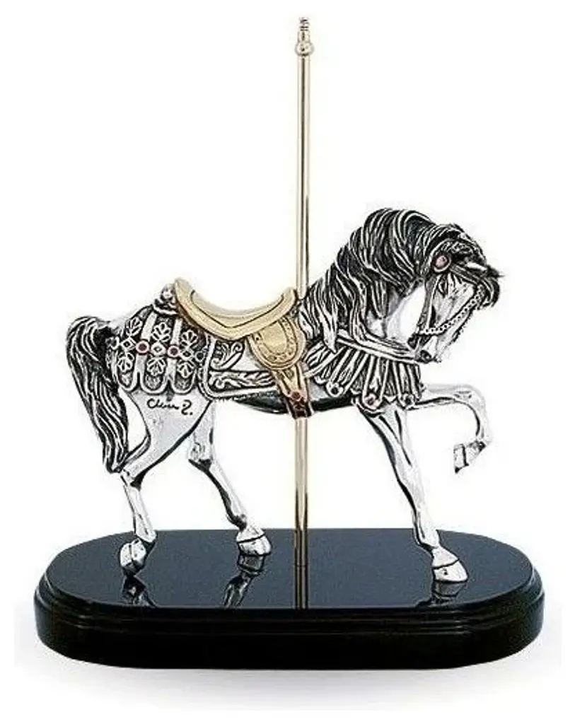 Silver plated carousel horse #7512 by D''Argentas acclaimed artist, Claudio Rodriguez. 1 of 4 in the collection of beautifully crafted sculptures that hearken back to the golden age of the carousel. This masterfully crafted collection pays homage to the master craftsmen, like Gustav Denzel, whose richly carved parade horses, steeds, and war chargers graced the ride that was the centerpiece amusement parks at the turn of the 20th century. Whether caught in the pose of prancing on parade, rearing up, or neighing in anxious anticipation of the charge, these sculptures are richly detailed. The saddles and carousel poles are accented in brass and 24K gold. The riding gears of the steeds are embellished with semi-precious stones. These stunning pieces are certain to be the prized focal point of collections for equine lovers. Acquire all four of these magnificent sculptures for your collection. Limited to an edition of only 500 pieces. Weight: approx. 12 lbs. About D''Argenta Silver EleganceOrnate in design, exquisite in detail, and beautifully elegant, the Sterling Silver Plated products created by the artists of D''Argenta Silver Elegance are the perfect heirloom quality pieces for any home. The distinctive sterling silver designs stand out against the black neillo inlay and the intricate detail is breathtakingly attractive. D''Argenta Silver Sculptures and objects d''art offer unparalleled excellence in quality and exquisite attention to detail, because they are the hallmarks that have established D''Argenta as a leader in the export of precious metal-finished art for over a quarter of a century. Each of the over 200 limited-edition sculptures, personally signed by the artist, is technically flawless yet competitively priced..the same master-craftsmanship received in pieces that have been gifted to royalty, heads of state and the Vatican. From the surface detail of the innumerable tumuli and broad swells that impart the hides of the elephant collection to the graceful lines that capture the motion of a stallion''s gallop, you will marvel at the beauty of your truly unique acquisition as it graces a special place in your home. Historically, sculptures composed of precious metals were crafted using the traditional hot casting process. 25 years ago, the artisans at renowned metal art company D''Argenta introduced an advanced new metalworking technique that changed the way precious metals are sculpted. D''Argenta''s new method combined cold casting and electroforming to create intricate, finely detailed sculptures. The pieces are initially plated with a . 015 inch (400 micro) thick layer of copper, then plated with silver or (24K) gold at a thickness of . 001 inch (24 micro). Each sculpture''s interior is composed of a polyester fiberglass core that strengthens sleek metal plating. After being formed, each piece is coated with a protective lacquer to prevents tarnishing and maintain luster. This final step ensures that all D''Argenta sculptures, though crafted with fine silver, do not require polish or any type of metal cleaner and can be simply dusted with a dry cloth as needed. Exported around the world and now available in over 25 countries, D''Aragenta''s products have won international acclaim because of their innovative construction and exquisite beauty. In 1981, D''Argenta was recognized with the Bulgarian Government Gold Medal award. In 1992, a D''Argenta sculpture was gifted to His Royal Highness Prince Naruhito of Japan on a visit to Mexico. A nod to the company''s exclusive prestige, D''Argenta sculptures have been gifted to an increasingly long list of dignitaries, including Pope John Paul II, Prince Phillip of England, and his Majesty King Harald of Norway. The gifted artists of D''Argenta include: Manuel Alvarado, Ricardo Del Rio, Enrique Jolly, Javier Arenas Perez, Claudio Rodr