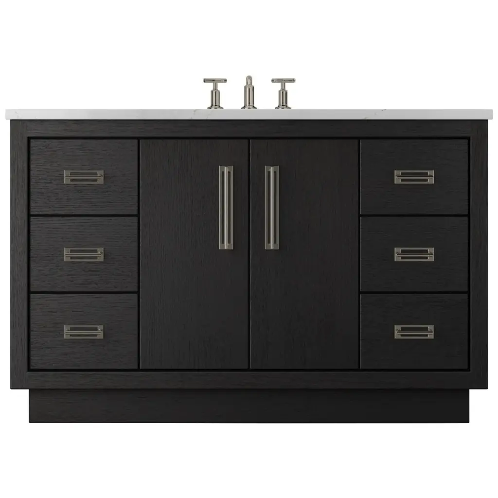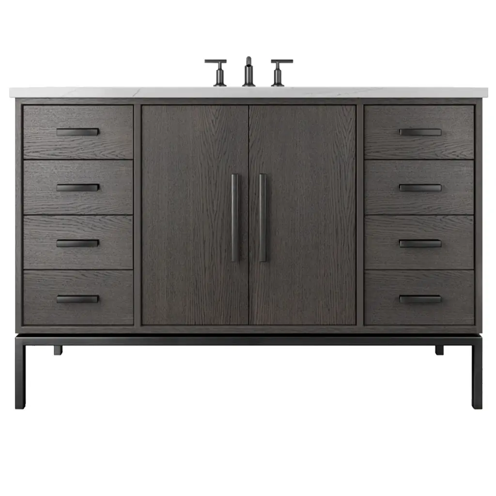 The Carrington Single Extra Wide Bathroom Vanity is a masterpiece that seamlessly blends contemporary design with the timeless elegance of handcrafted artistry. This freestanding vanity stands as a testament to exquisite craftsmanship, featuring a robust 2" frame that exudes strength and sophistication. The decorative hardware, complete with a backplate, adds a touch of refined elegance, making it a focal point in any bathroom setting. At the heart of this vanity lies a full-height door sink base, gracefully flanked by two wide drawer banks. Each drawer and door is equipped with soft-close glides, ensuring a whisper-quiet closure that speaks to the quality and attention to detail inherent in its design. Available in a variety of custom finishes and sizes, the Carrington Vanity offers versatility and style, allowing it to harmonize beautifully with any decor. Embrace the allure of the Carrington collection and transform your space into a sanctuary of beauty and functionality.