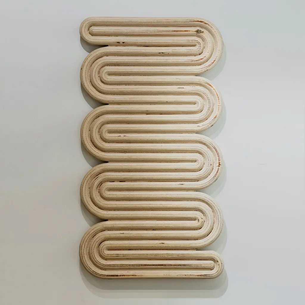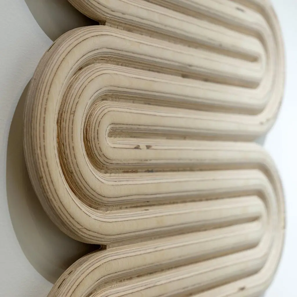 Carving 01 sculpture by John ViewegDimensions: D 107 x W 51 x H 4 cm.Materials: routed plywood. RELIEF refers to both a formal and psychological condition.Historically, reliefs have been made by carving away at natural materials. Thehighkey puts a contemporary spin on this technique by cutting into common industrial products such as plywood and foam. By softening the square edges of these items, their human qualities are revealed.The Glove Couch, was conceived in 3D software by thickening a curved line. The seat encourages you to sit in its various folds, creating a condition in which you feel held. The form of the item speaks to the industrial context in which it was made. This shape, reminiscent of throwie graffiti, became the basis for an entire graphic system.The three wall mounted items are a natural extension of the curving motif. The two Carvings continue the soft graphic treatment from the couch, while the Dome Mirror with its convex reflection reveals the entirety of the space around the viewer.These items provide relief from our complex world.Thehighkey is a design studio that creates rare objects and environments. The name refers to a condition in which people are elevated. It is from this vantage point that thehighkey operates, leveraging digital technology to produce concepts that go beyond the norm.Thehighkey’s work is an unlikely mix of forms and materials from the past, present and future. In a world saturated with fast fashion, thehighkey defies standards to create timeless designs that are made to last.
