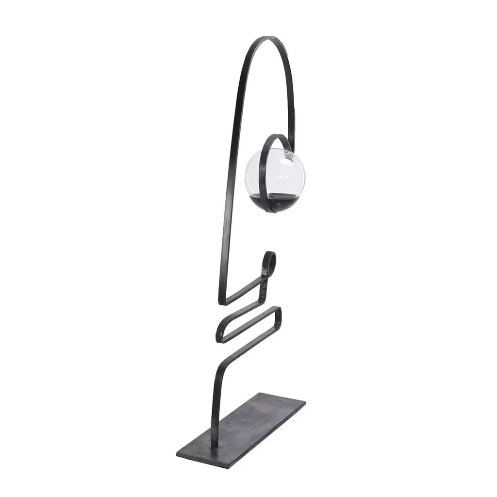 Handmade by Alessandro Bandiera from FDESTEEL. This carbon steel profile, heat-worked and bent by hand, recalls the face of the French comic character from the 50’s – 60’s. The hand blown sphere has a diameter of 21 cm. The finishing is heat-burnished with blowtorch to enhance the different natural shades of metal. It is not recommended to use outside, although it is possible.