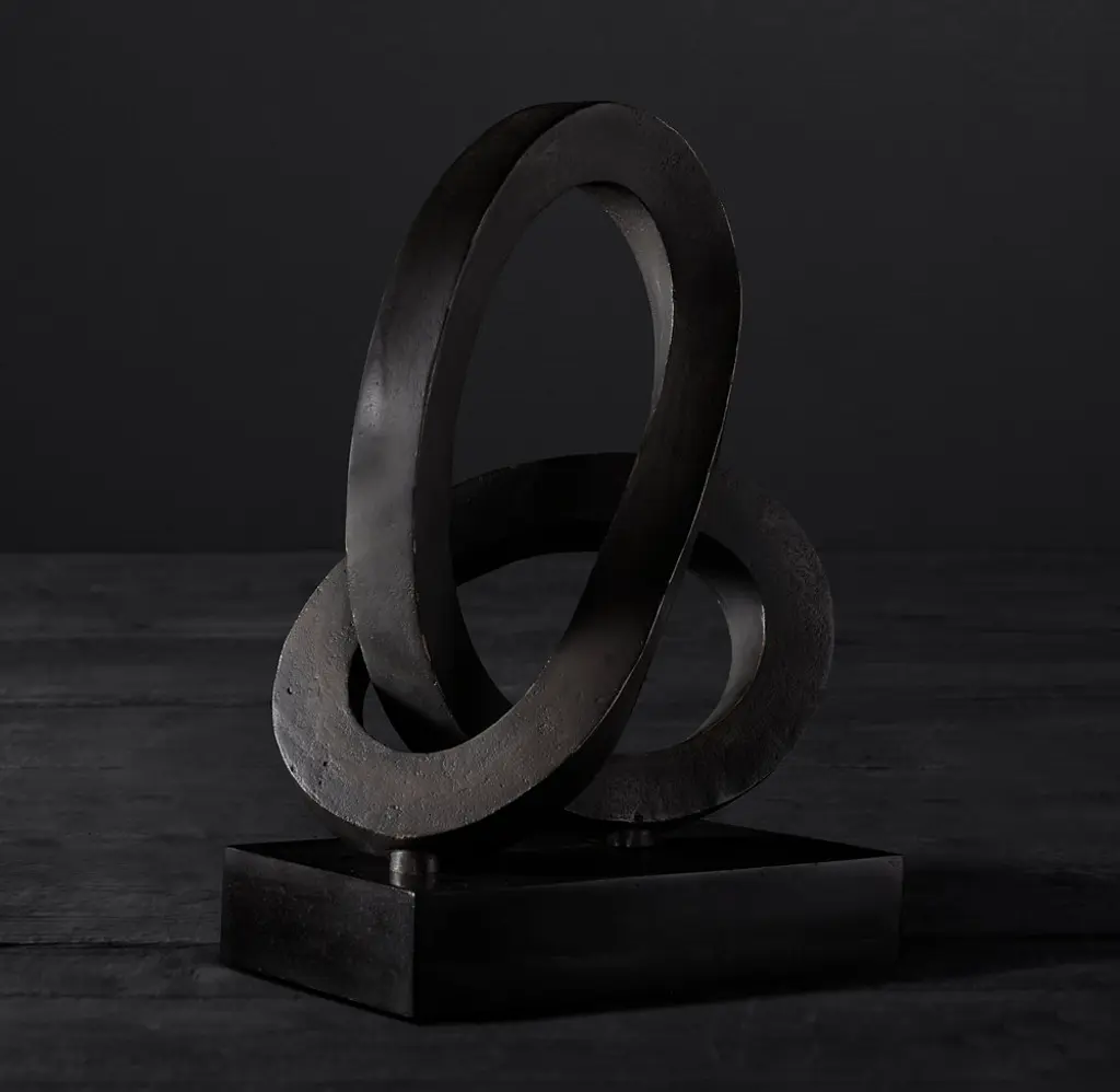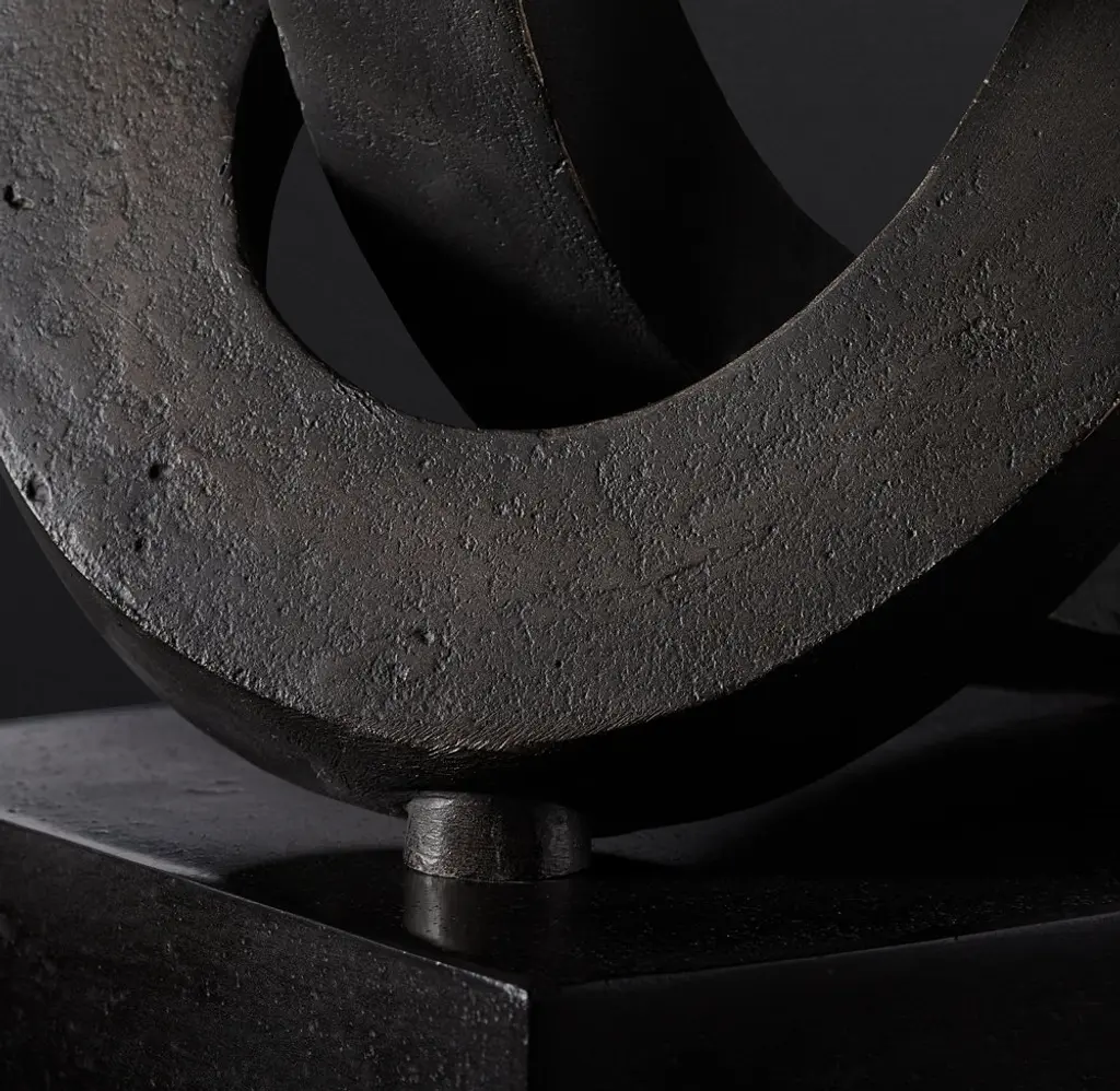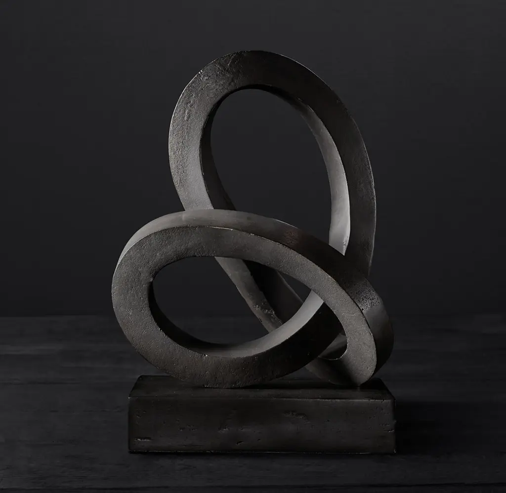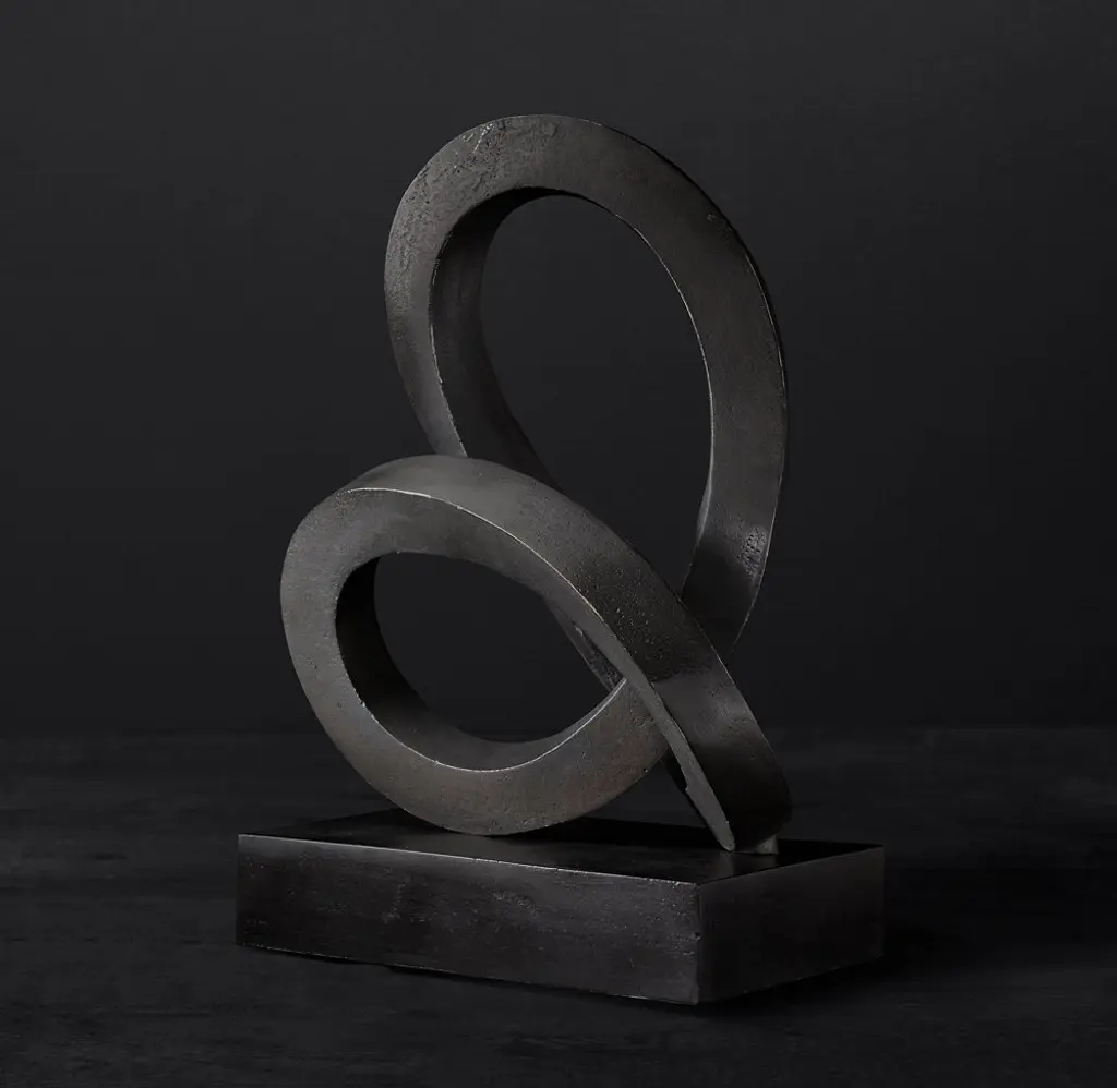 The timeless and contemplative infinity knot takes on a modern form in our abstract bronze sculpture. Crisp-edged, curving lines rise and turn around each other. The bronze finish is baked to achieve both highlights and deep hues, creating rich contrasts in the metallic surface.
