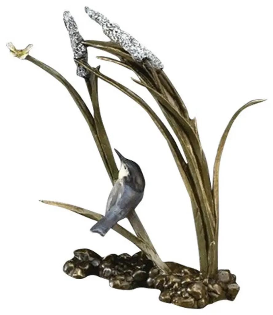 This playful and elegant Bronze Bird Sculpture Catch Ya Later by artist Mark Hopkins is part of the designer''s popular Garden Collection. The evocative image of a colorful song bird resting in the reeds and eyeing a tiny butterfly is captured in the finest bronze, and finished using a special hot patina process to produce its rich, lifelike shades. Give it as a very special gift for that friend or family member with a passion for the beauty of nature''s own forms. Only 250 will be produced right here in the USA, making this piece a unique collector''s item. Internationally renowned American artist Mark Hopkins creates bronze sculptures that have thrilled collectors and casual art fans alike for more than two decades. Mark Hopkins'' unique balance of organic inspiration and singular contemporary design has been called "bronze in motion" for its fluid look, which often appears to display natural beauty in defiance of gravity. About Mark HopkinsMark Hopkins takes his inspiration for every facet of life on Earth, from the majesty of wildlife to mankind''s interaction with nature, and produces limited-edition pieces that evoke a sense of awe and respect for the mysteries and loveliness of the world around us. Collectors of his work include Barbara Mandrell, Clint Eastwood, Bill Clinton, Colin Powell, George and Barbara Bush and a host of other luminaries and corporations including the National League Association of Baseball Club Owners, the Atlanta National Golf Club, Humana, Coca-Cola and others. Each Mark Hopkins sculpture is crafted with pride in the USA. Captivated by form and design, Mark has personally created a signature style of vibrant vitality resulting from decades of study. Encouraged by parents and teachers from an early age, Mark''s unique talent developed alongside his technical skills of sculpting and casting. As an artist, Mark is constantly challenging himself to render the rich beauty of life and the deep emotion of the human soul into flowing sculptural form, noting "I strive to express beyond the image, to catch spirit, to reveal deeper emotions, and to share joy. "About the Production ProcessFrom the artist''s hand to the final polishing stages, many intricate steps go into the creation of a limited edition bronze sculpture. First the reproduction mold is made in which layers of silicone rubber and plaster are delicately applied to the original work. Then hot wax is poured into the reproduction mold to form an exact replica of the original sculpture. When the wax replica is removed from the mold, it is then inspected and refined or "chased" by hand to remove any imperfections that may have occurred in the reproduction process. Next, ceramic cup and wax sprues, or gates, are added which later will help channel the molten bronze into the shell to create the sculpture. The next step is creating the ceramic shell by alternately dipping the wax replica over a period of several days into a vat of liquid slurry, then a vat of silica crystals. The shell is then set to dry, and the process repeats until the shell has reached the appropriate thickness and strength. The finished shell is placed in a high temperature oven that melts and removes the wax (the traditional "lost wax" method). The hardened or "fired" shell is secured, so the molten bronze can now be poured into the wax impression.