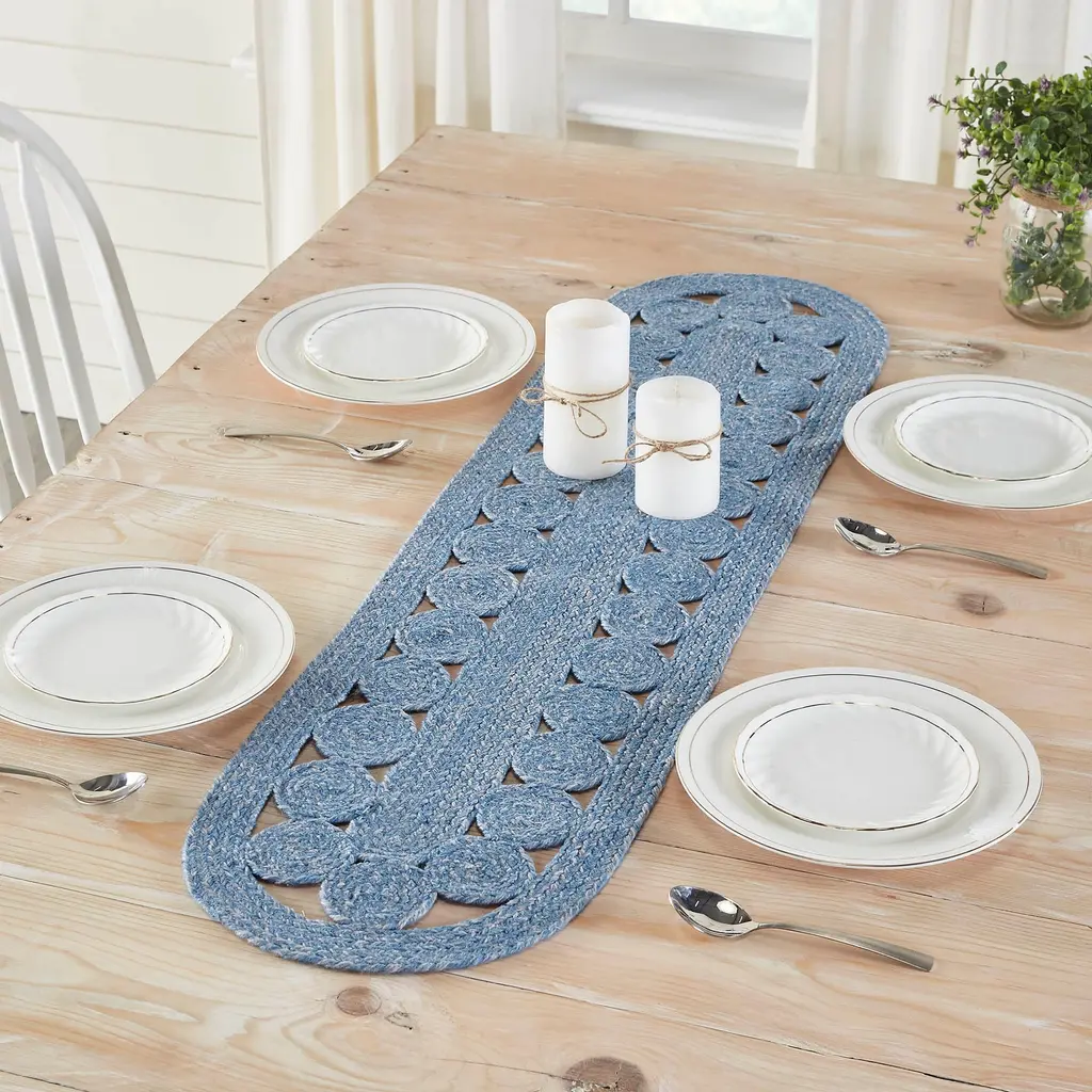 FARMHOUSE TABLE RUNNER: Includes one 12x36 inch table runner for a perfectly prepped table with classic country charm.,INDOOR/OUTDOOR: Crafted with 100 percent recycled polyester material (PET) that enables the table runner to be water resistant, perfect for both indoor and outdoor use. ',MODERN FARMHOUSE FLAIR: Versatile styling sure to match country chic, farmhouse, or cottage decor.,EASY CARE: Hand wash and lay flat to dry.,BLUE WEAVE: Alternating rows and circles of dusty blue braids create a charming coastal country feel.,COORDINATING ACCESSORIES: The Celeste Blue Collection by VHC features a robust collection of textured jute-inspired designs with alternating rows of solid braiding and circular designs in dusty blue. The natural look pairs well with the entire VHC catalogue of rich, rustic home decor in classic designs you'll cherish for years to come.,AUTHENTICITY: Sometimes copied, never duplicated. VHC products ALWAYS feature attached product tags.