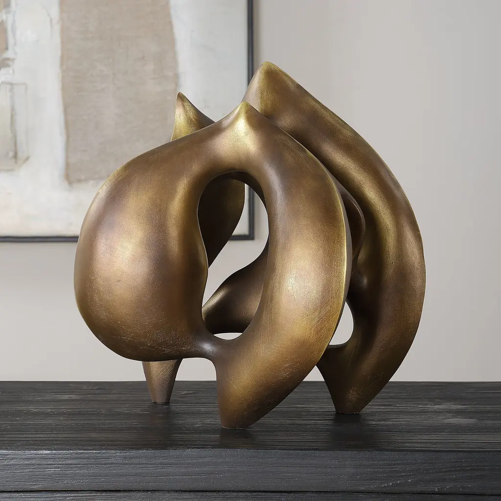 This Is A Visually Captivating Abstract Bronze Finished Sculpture Featuring Smooth Curves And Multiple Openings. Its Flowing, Organic Form And Polished Finish Give It A Dynamic And Modern Aesthetic, Making It An Ideal Centerpiece For Contemporary Spaces.