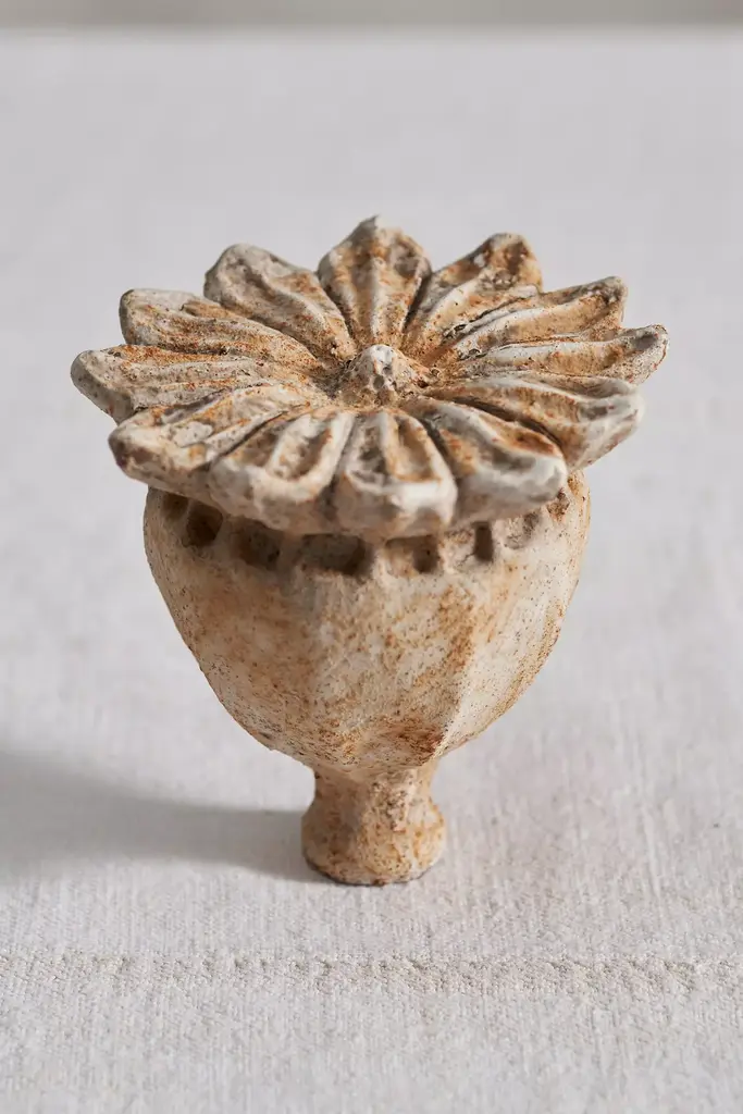 This hand-crafted cement poppy pod sculpture makes a charming addition to a garden bed, doorstep, or container planting.
