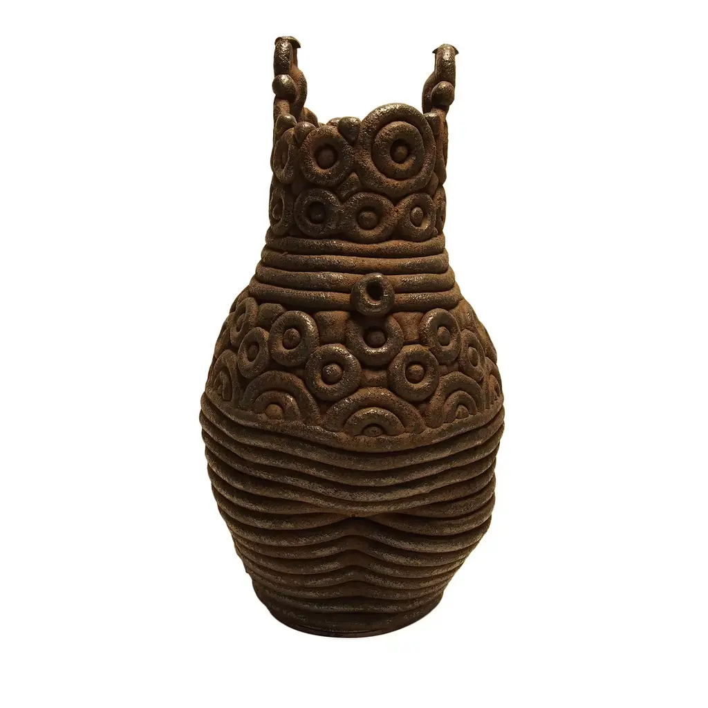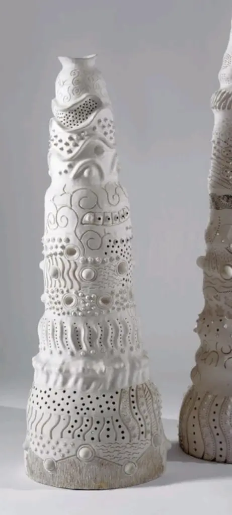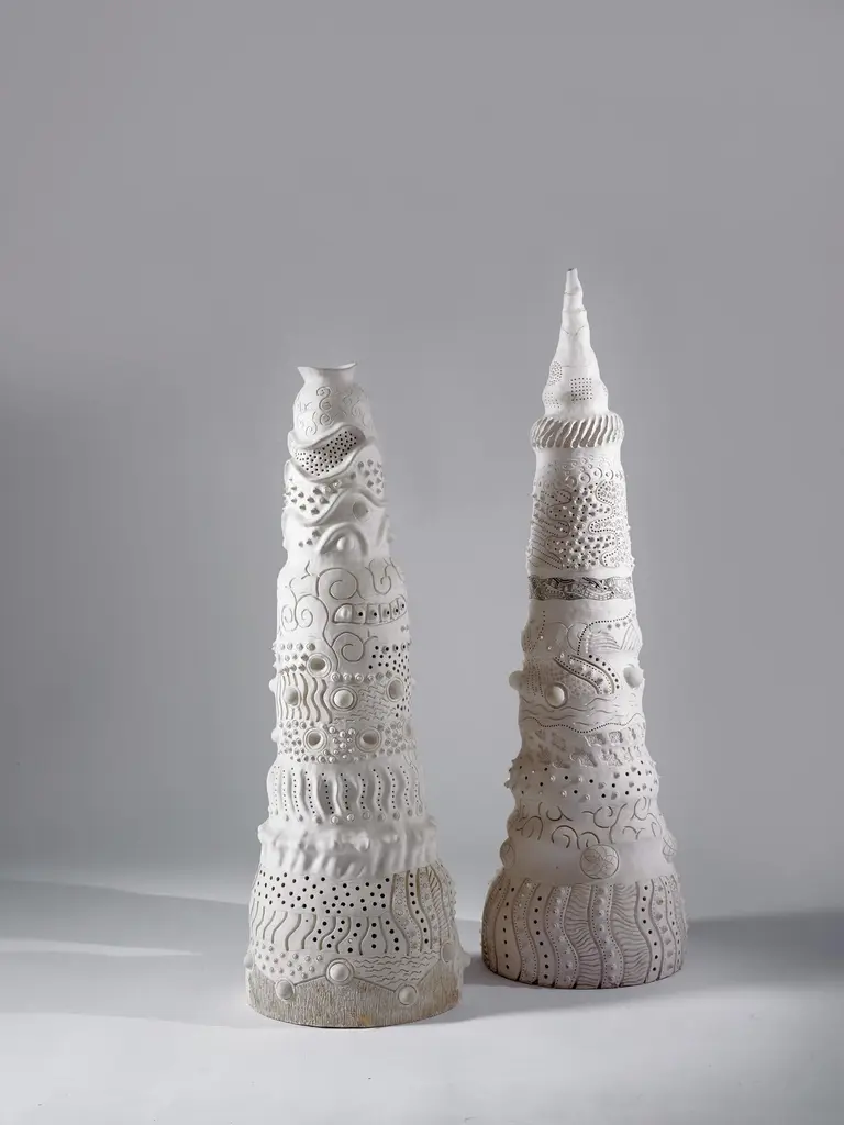 From Israel come these outstanding ceramic pieces, reminiscent of the Tower of Babel from the Bible.They are the last pieces produced by Dodi Eldar, a very sensitive and skillful ceramicist who retired a few years ago. His treatment of the material is so refined it comes very close to looking like porcelain.The Pointilliste technique is how he tells us of the difficulty we have understanding each other. These magnificent pieces are the last of a kind.