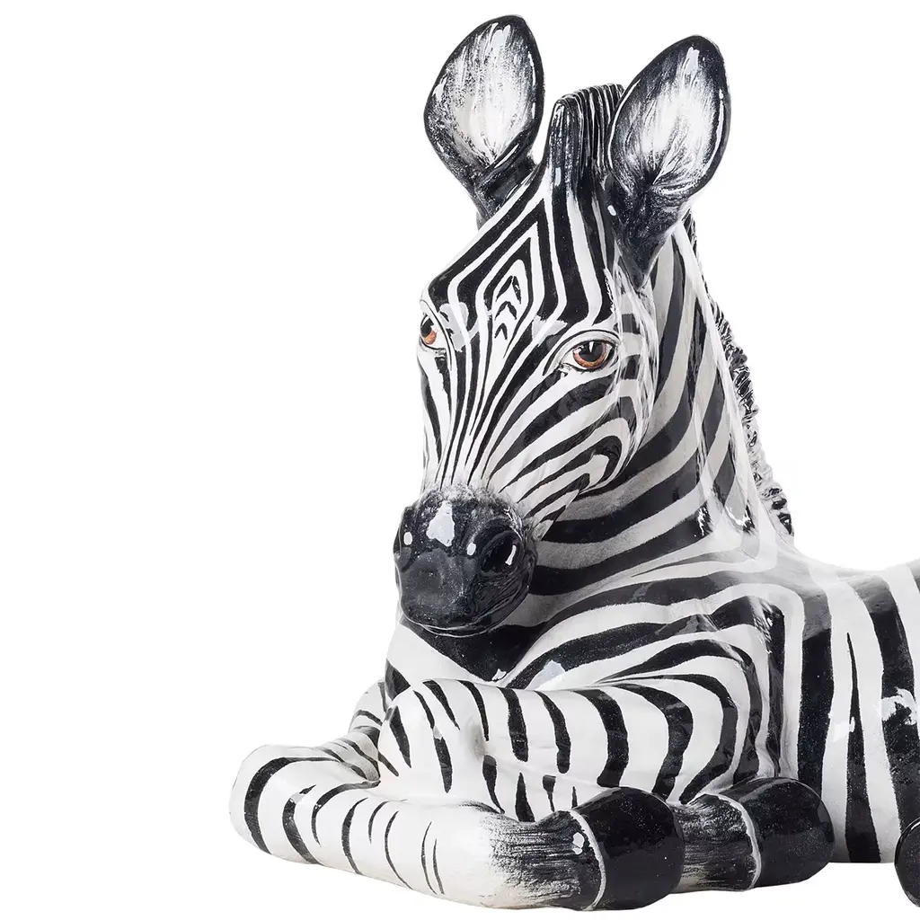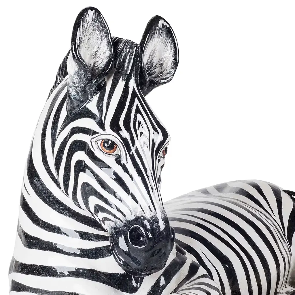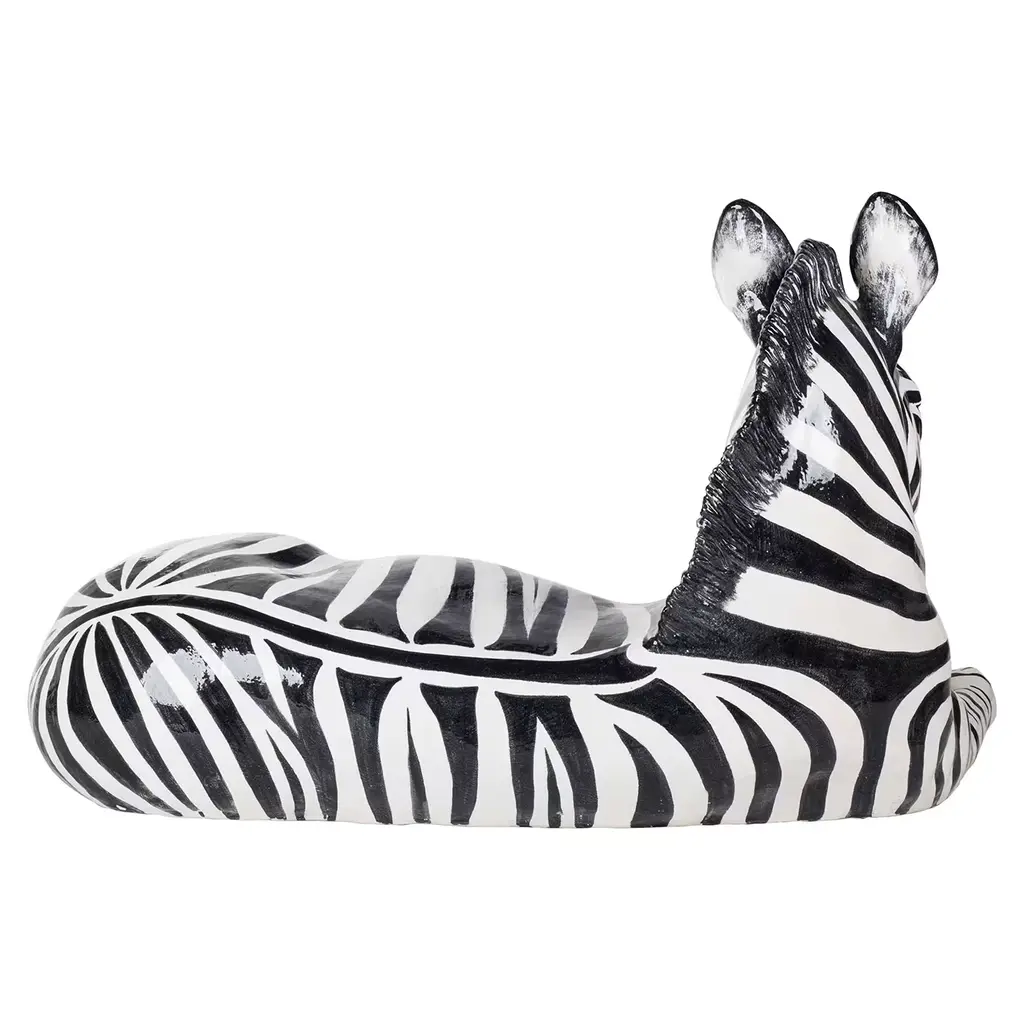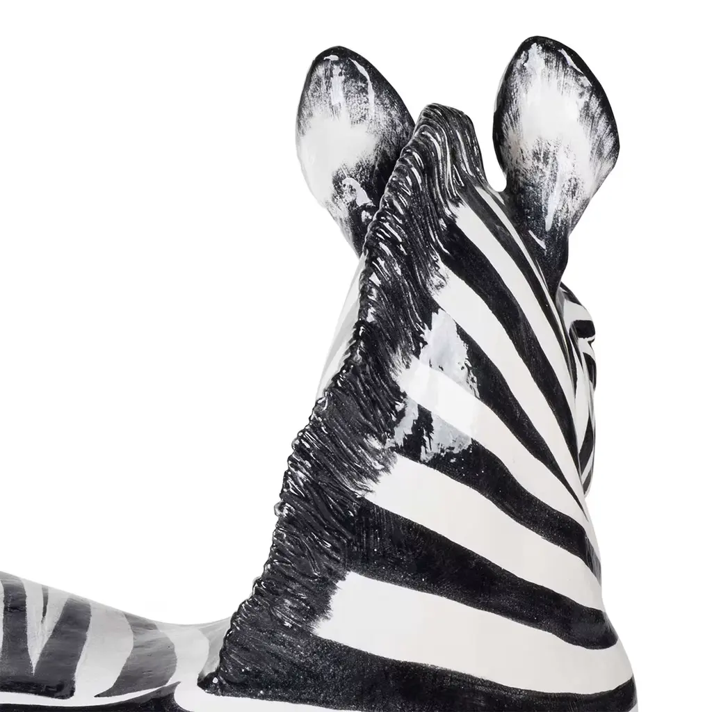 An African safari in the comfort of one’s home comes that much closer with this ceramic zebra statuette. The animal – at rest with its front legs crossed in a playful manner – is completely hand-decorated in black and white enamel and is an ideal piece for any contemporary, modern or Art Deco setting.