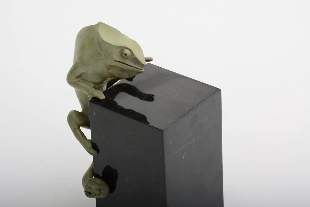 Chameleon Sculpture in Cast Bronze in Verdigris Finish by Elan AtelierCast bronze Chameleon sculpture in Verdigris finish on black marble base by Elan Atelier. Custom finishes are available.