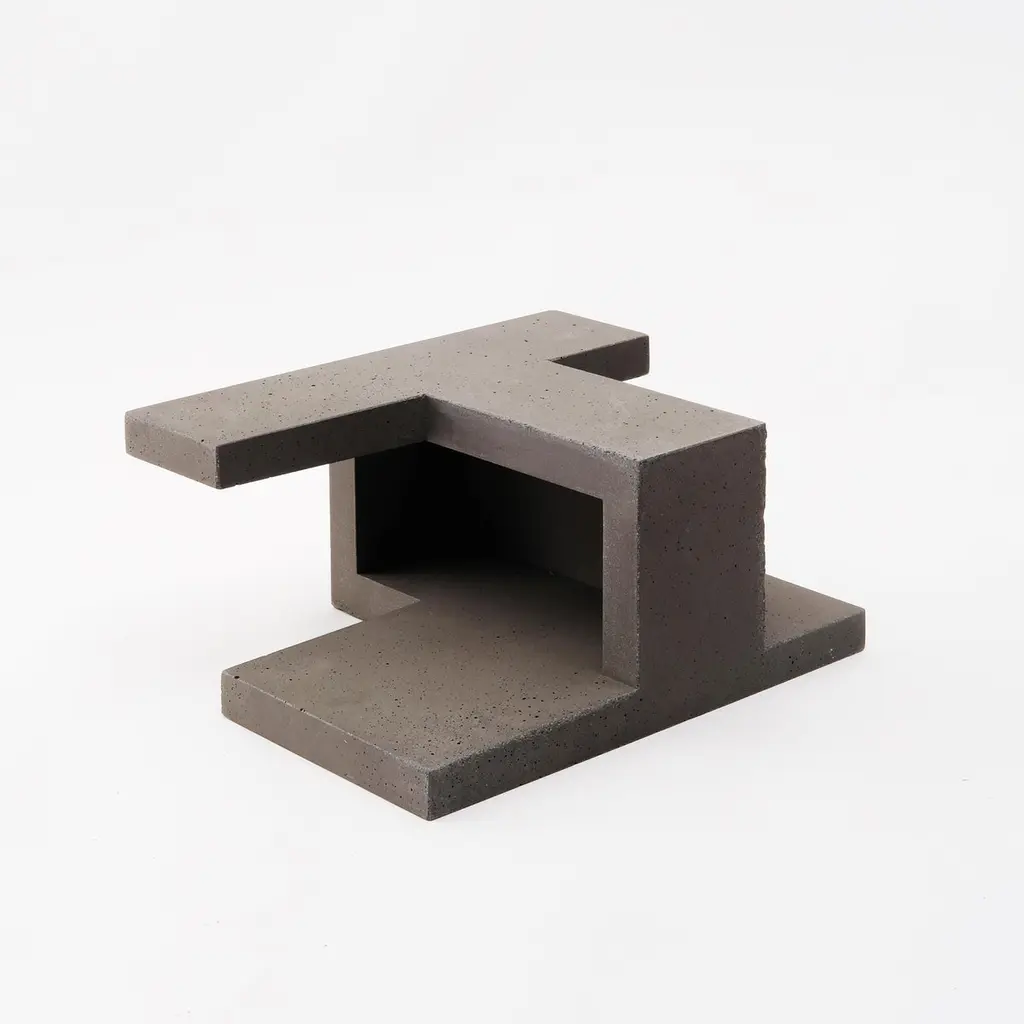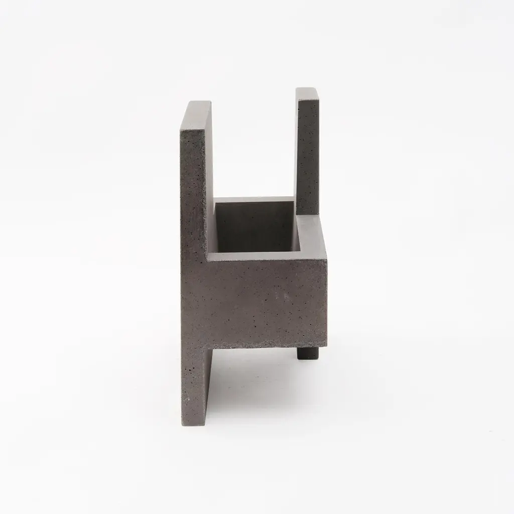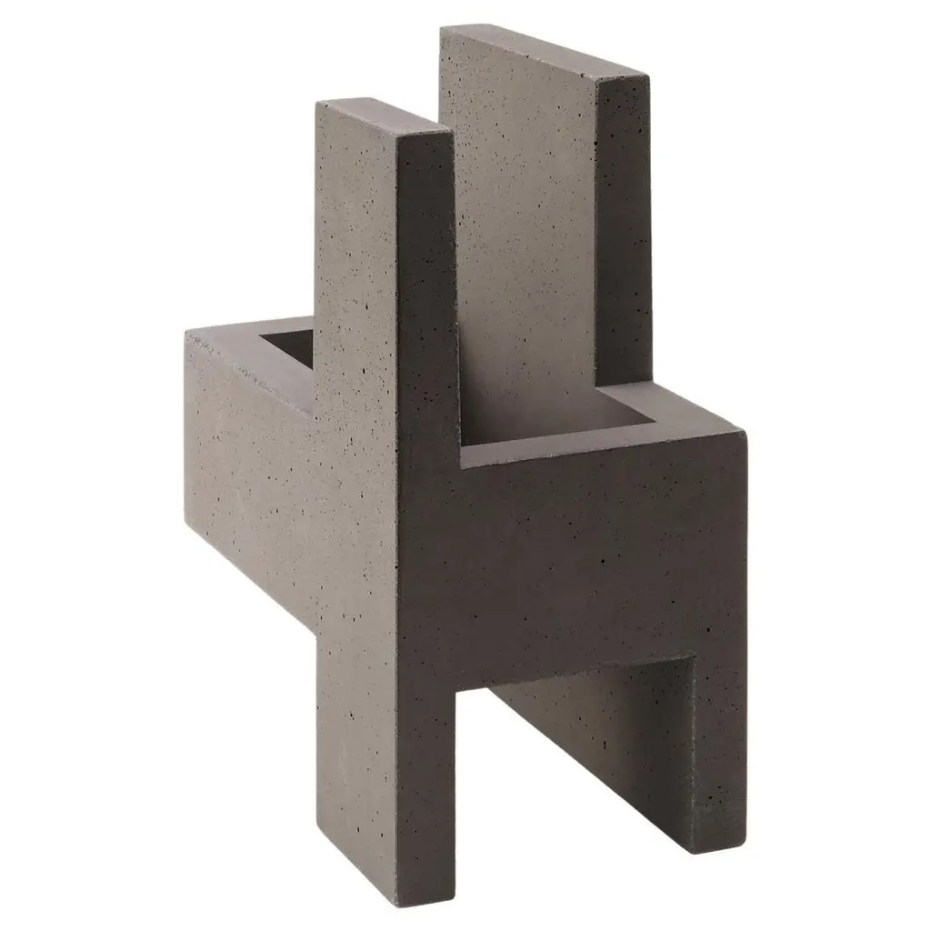 Chandigarh IV - Dark Grey - Design Sculpture Paolo Giordano Cement CastChandigarh is a collection of sculptures inspired by the homonym city designed by Le Corbusier, who imagined and created it from nothing in India. The sculptures are made of exposed concrete, coloured with oxides that give the material pastel and chalky tones, each shade can mark the thicknesses emphasizing the contours. These small architectures can be used as vases, but also left bare as they are. Simple signs like an imaginary alphabet. Evocative structures revealing a world of improbable geometries.Edition of 200 pieces x model numbered and signedDesigned by Paolo Giordano.Made in Italy.Abstract sculpture has a geometric shape and hard lines, handmade in concrete or cement in Italy, suitable for home, showrooms or hotels.