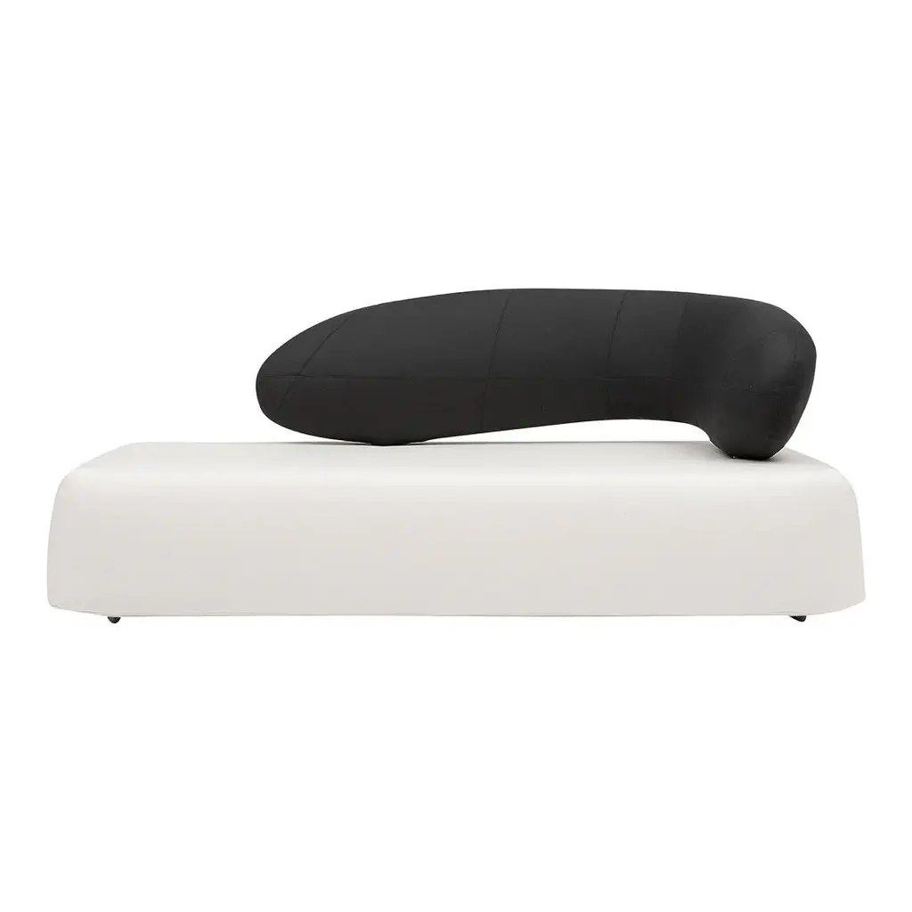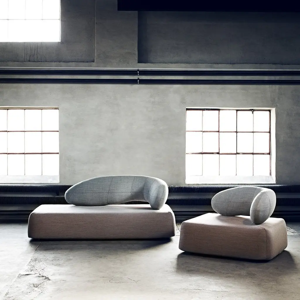 A RELAXING SCULPTURE. CHAT is designed to provide the perfect setting for people to sit and have a chat, but there are many more ways to use it. The design combines the elegant, organic round shape of the backrest with the cubic lines of the seating element for a sculptural look. The top quality materials make the comfort superb.