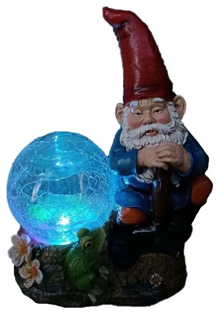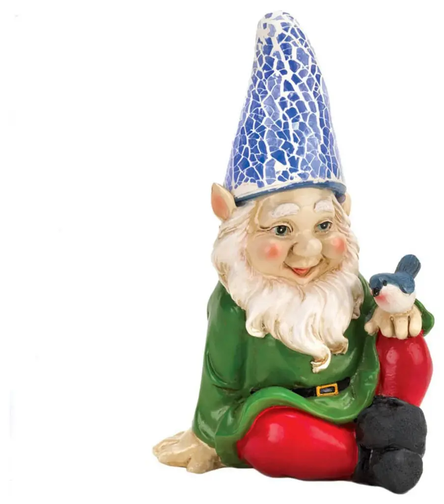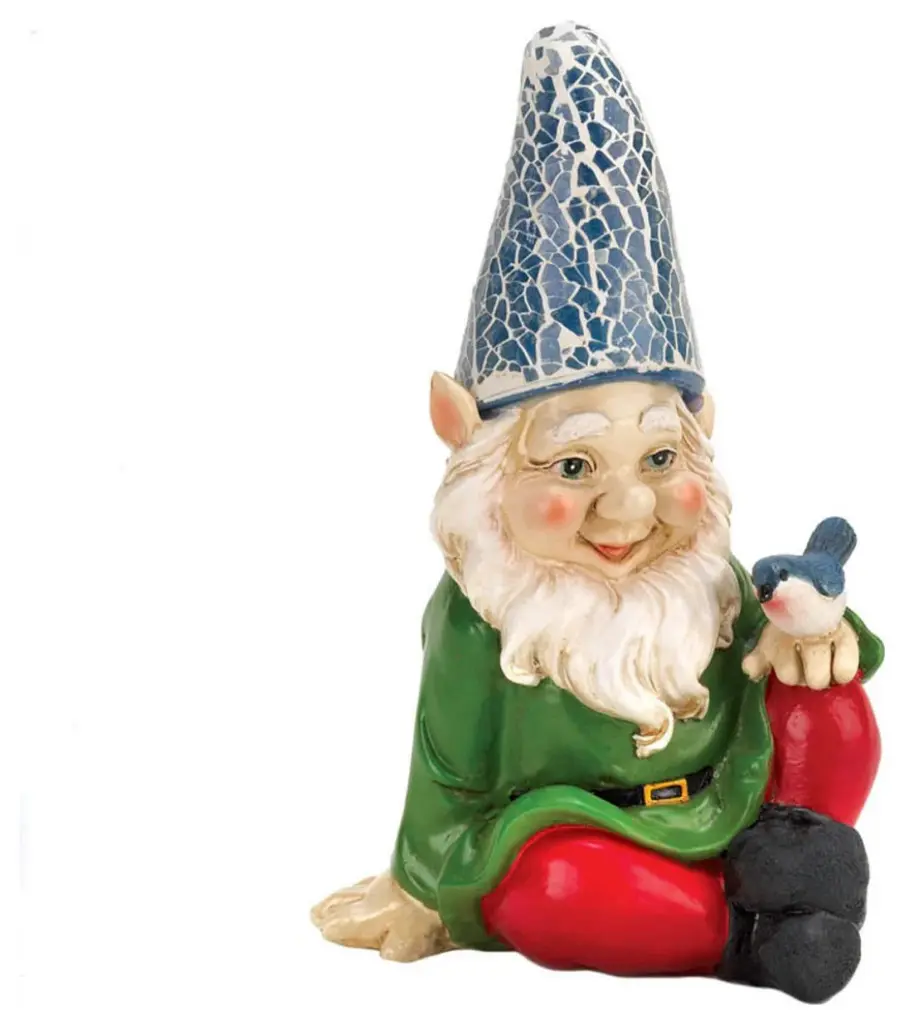 CHEERY GNOME SOLAR STATUEYou''d be happy, too, if a friendly little bluebird was perched on your knee! This charming garden gnome statue features a tall blue hat that lights up at night after soaking up the sun all day long.CHEERY GNOME SOLAR STATUEMaterial, PLASTIC, POLYRESIN, SOLAR PANELManufacturer -Summerfield TerraceProduct Category, PATIO, LAWN & GARDENItem Length, 4Item Width, 4Item Height, 7.25