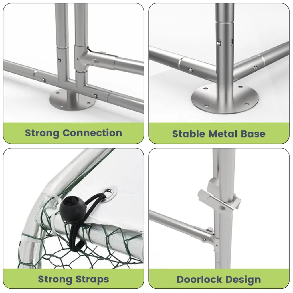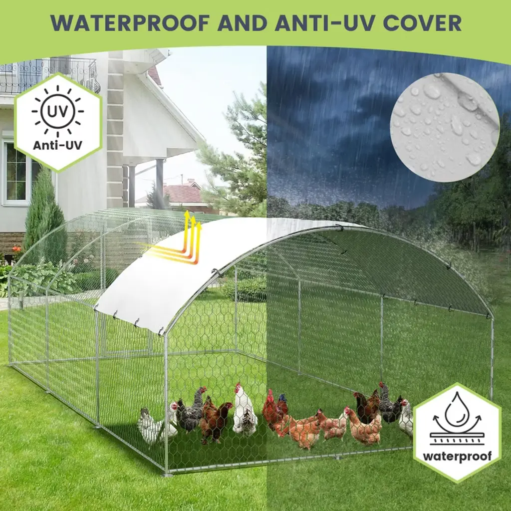 .User-Friendly Installation for Quick Setup Say goodbye to complicated assembly with this large chicken coop, which comes with clear, professional instructions designed to simplify the process. The enhanced pole attachment system¡ªupgraded for seamless fitting¡ªensures that even those with minimal DIY experience can put it together effortlessly. No need for specialized tools or endless frustration; the intuitive design and labeled components let you set up your poultry enclosure in no time, so you can focus on introducing your birds to their new home sooner. 2.All-Weather Protection with Durable CoverKeep your poultry safe and comfortable year-round with the coop¡¯s high-quality waterproof and UV-resistant cover. Crafted from robust polyethylene, this tarp shields chickens from harsh sunlight, heavy rain, snow, and fluctuating weather conditions, creating a cozy sanctuary regardless of the season. The UV protection prevents the cover from tearing, cracking, fading, or peeling over time, ensuring long-lasting performance. Whether it¡¯s a scorching summer day or a cold winter night, your birds stay protected in a stable, weatherproof environment. 3.Enhanced Security Features for Peace of MindYour poultry¡¯s safety is prioritized with a lockable galvanized door that secures the coop tightly, minimizing the risk of escapes or unwanted intrusions by predators. The thoughtfully designed access points ensure easy entry for feeding or checking on your birds while maintaining a secure barrier against threats. Rest easy knowing your chickens, ducks, or other small poultry are protected within their enclosed space, even when you¡¯re not around. 4.Multifunctional Design for Diverse PetsThis versatile chicken coop isn¡¯t limited to chickens¡ªit¡¯s spacious enough to accommodate a variety of small poultry and animals, including ducks, quails, rabbits, and more. Its adaptable layout lets you tailor the living space to meet the specific needs of different pets, providing ample room for movement, nesting, and feeding. Whether you¡¯re raising a small flock of chickens or housing multiple types of animals, this coop offers a safe, comfortable habitat that supports their well-being. 5.Spacious Layout for Natural BehaviorsWith its generous dimensions, this walk-in chicken coop gives your poultry plenty of room to move freely, scratch, peck, and engage in natural behaviors. The open design allows for ample fresh air and sunlight, promoting healthier, happier birds. Unlike cramped enclosures, this spacious setup reduces stress and encourages activity, contributing to better overall health and productivity. Your poultry will thrive in this inviting space, where they can enjoy the outdoors while staying protected.