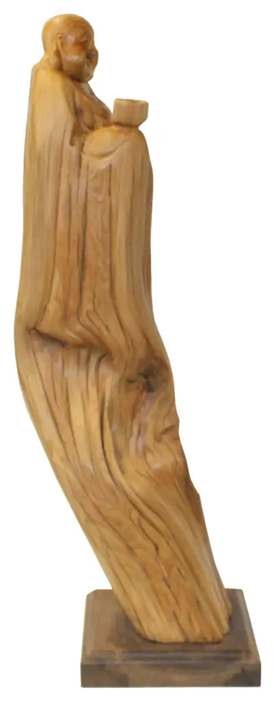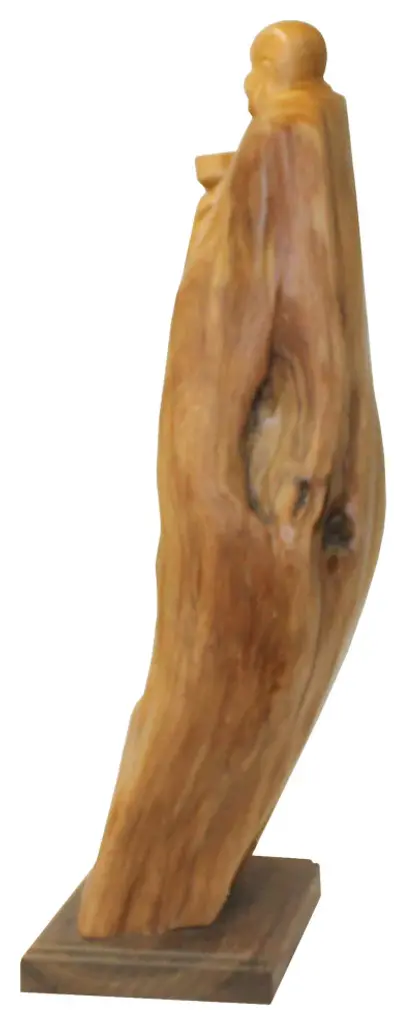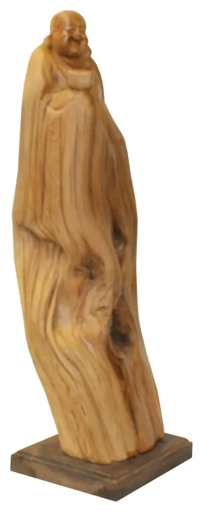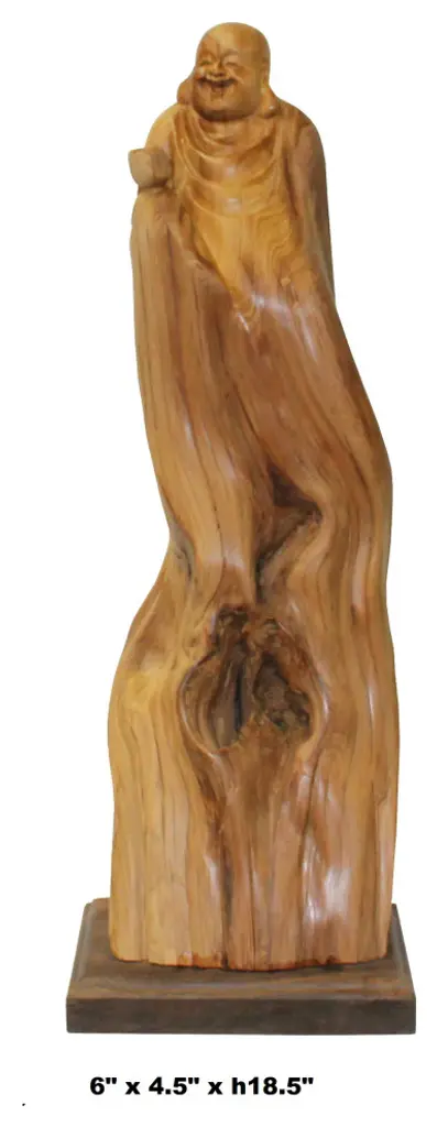 This is a handmade Chinese accent decorative statue of Happy Buddha from natural raw wood with an irregular shape.Dimensions: w6" x 4.5" x h18.5"Origin: ChinaMaterial: Cypress woodCondition: Handmade, natural wood imperfection and wood crack