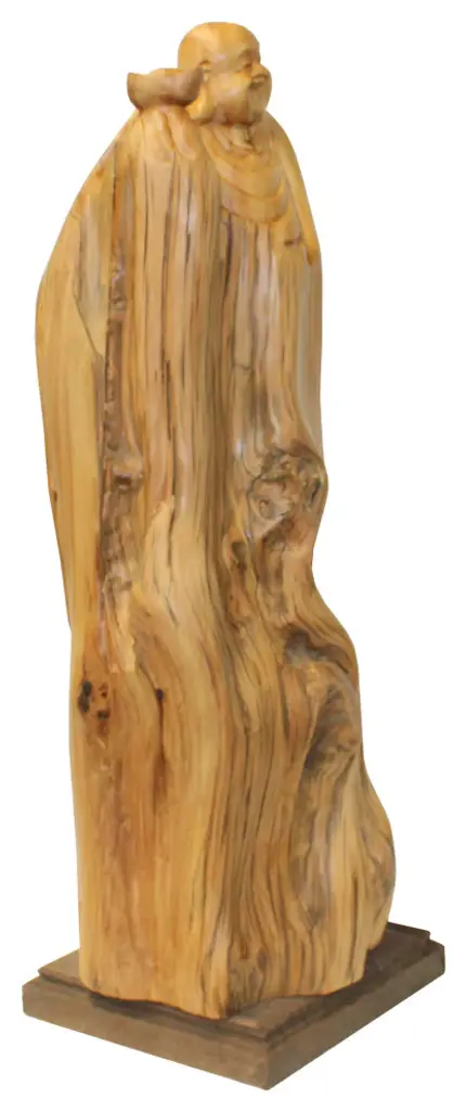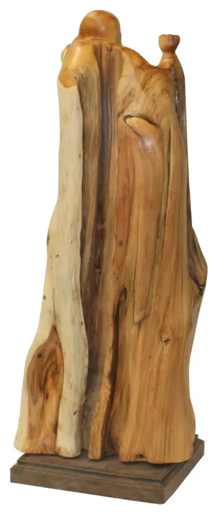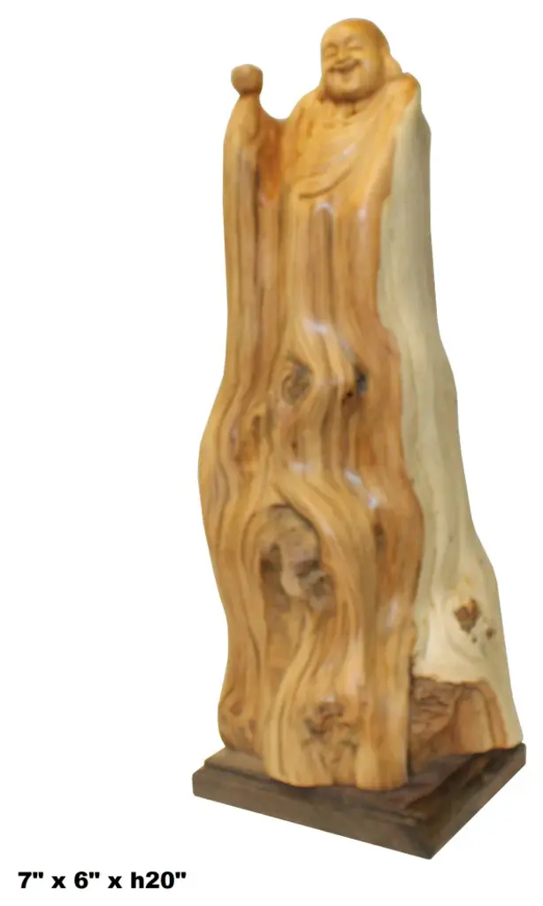 This is a handmade Chinese accent decorative statue of Happy Buddha from natural raw wood with an irregular shape.Dimensions: w7" x 6" x h20"Origin: ChinaMaterial: Cypress woodCondition: Handmade, natural wood imperfection and wood crack