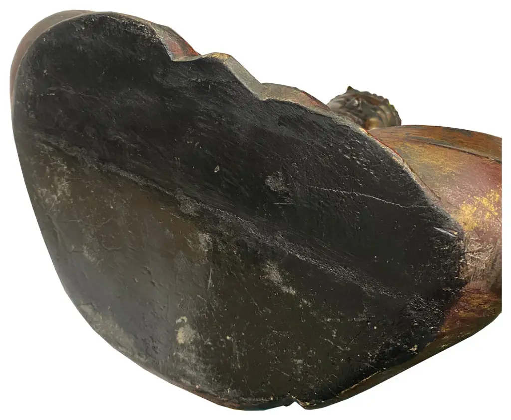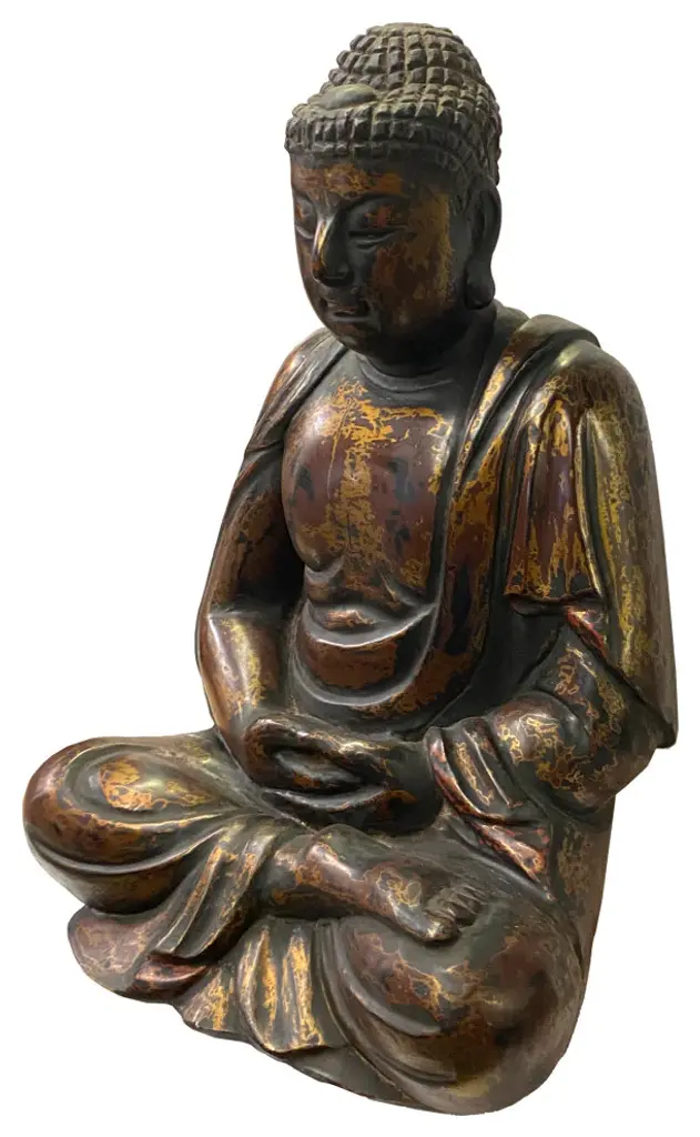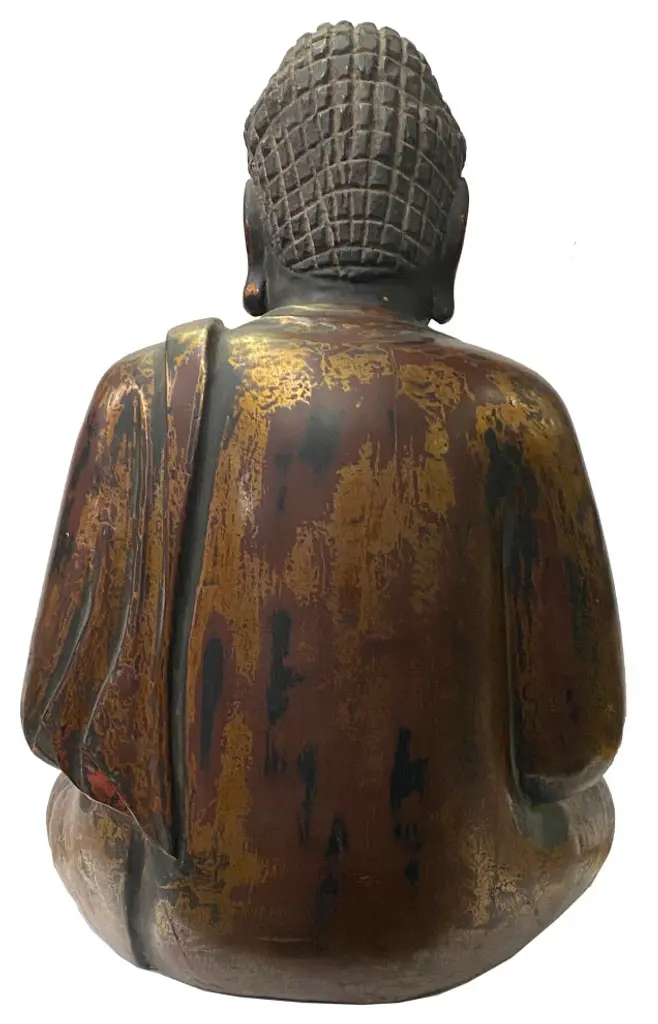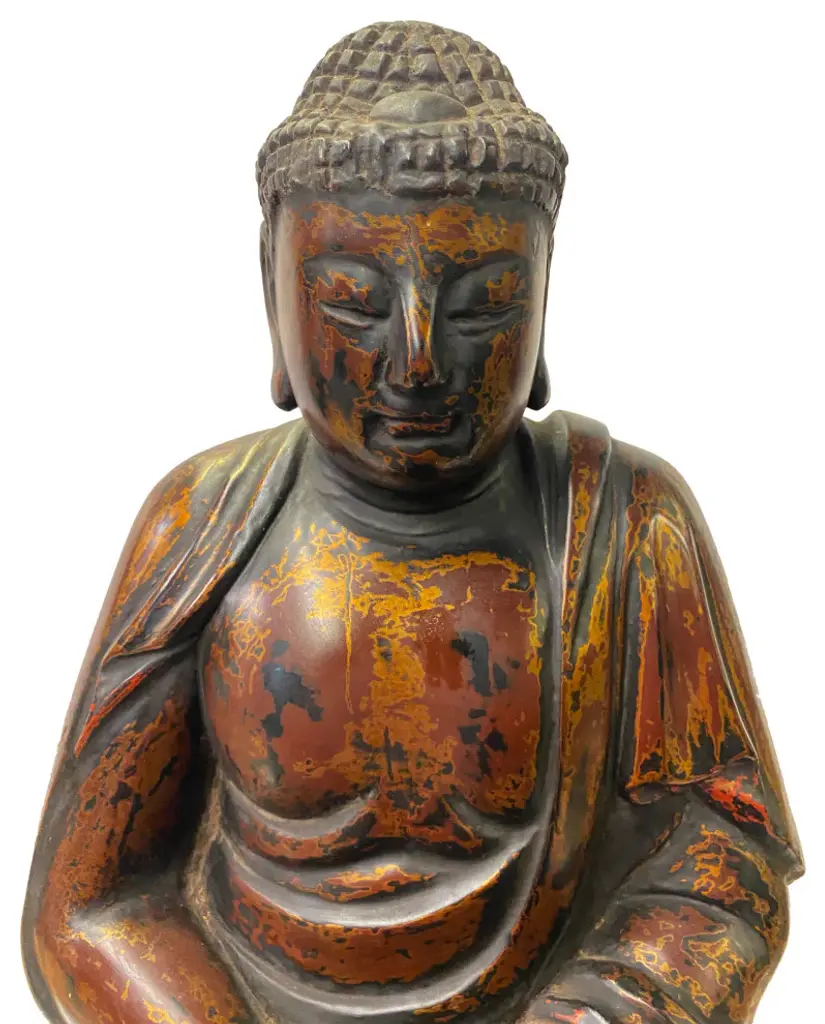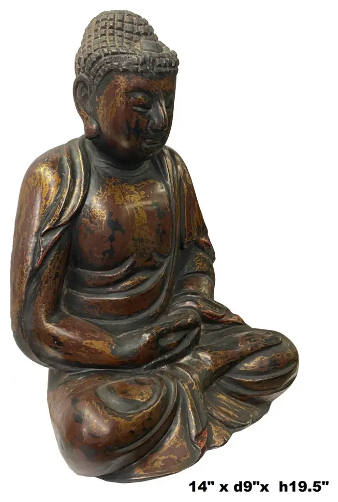 This wooden Buddha is in a meditation position. The surface is restored with matt golden brown lacquer mixed with rustic black. It is a decent subtle room decoration piece or personal meditation worship display.Dimensions: w14" x d9" x h19.5"Origin: ChinaMaterial: WoodCondition: Vintage Restored, handmade, distressed finish.
