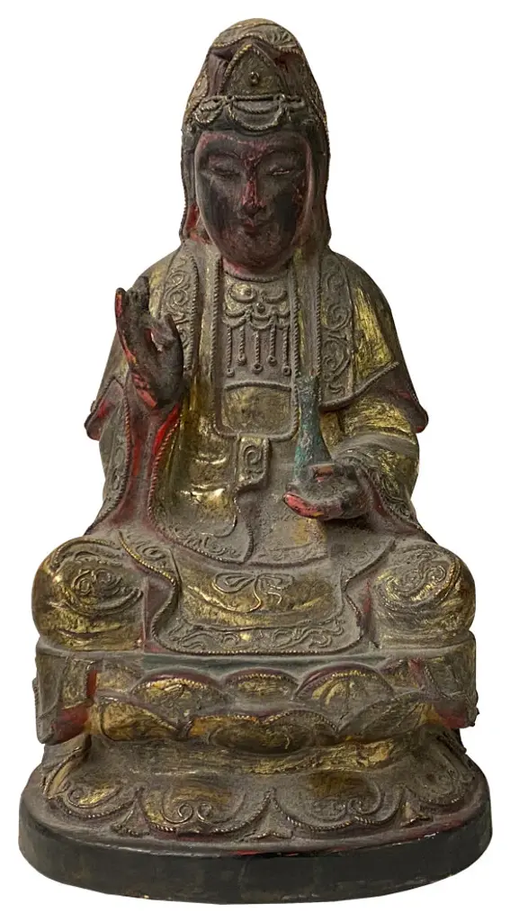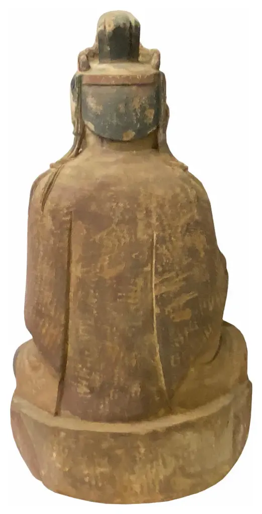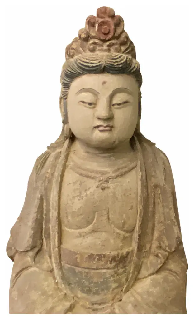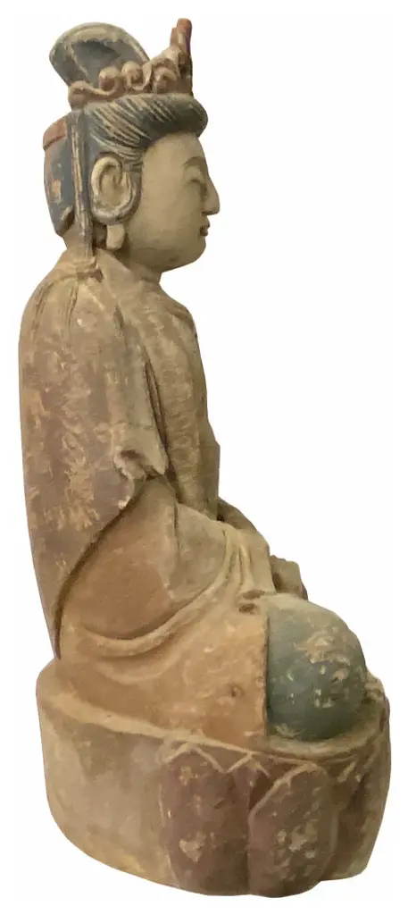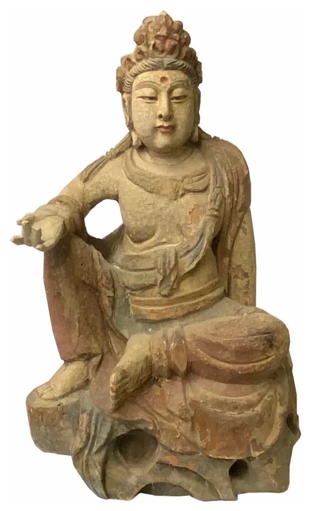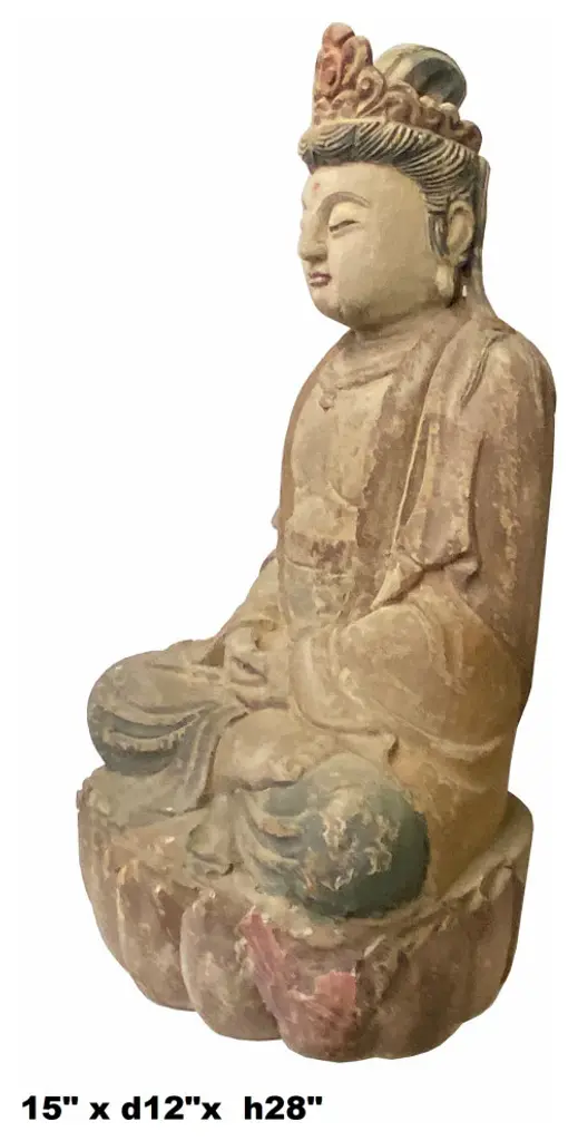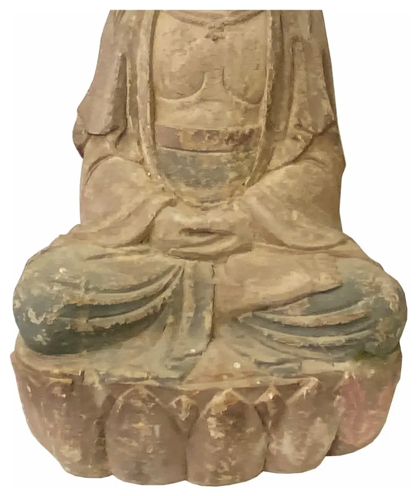This is a Chinese rustic wooden Guan Yin Kwan Yin Bodhisattva cross leg Sitting Buddha statue. It is finished with a vintage rustic look. Wear-out crack marks on the body.Dimensions: 15" x 12"x h28"Origin: ChinaMaterial: WoodCondition: hand made, rustic finish, wood crack, chip off
