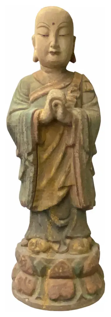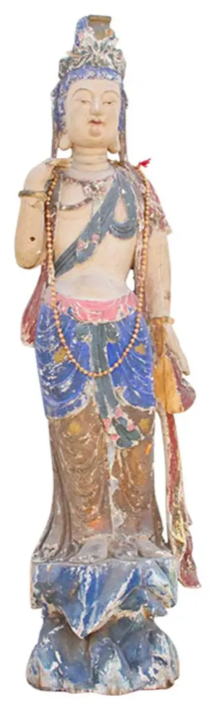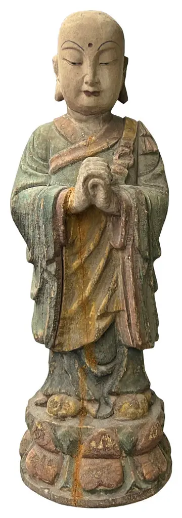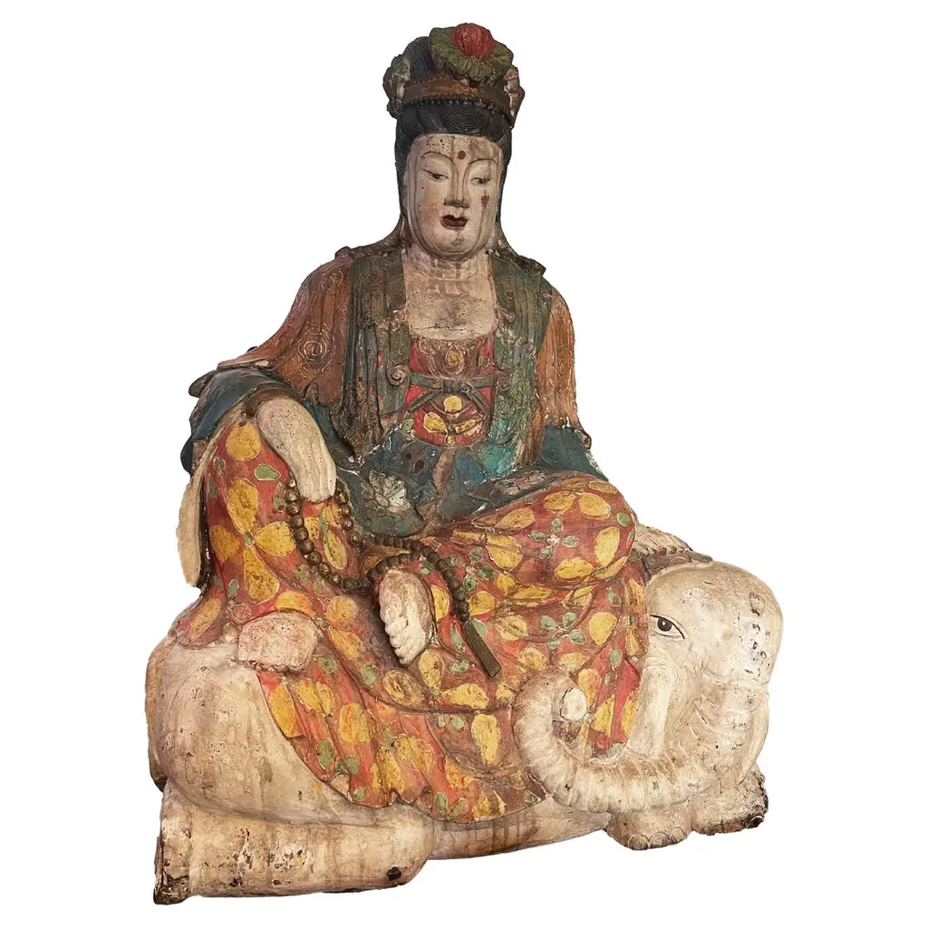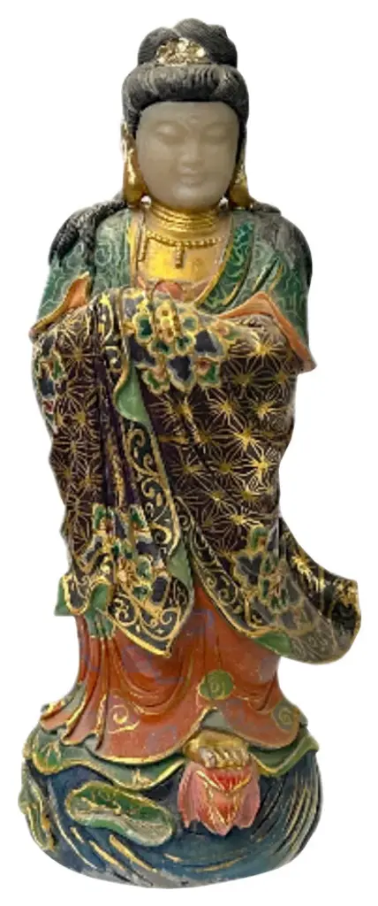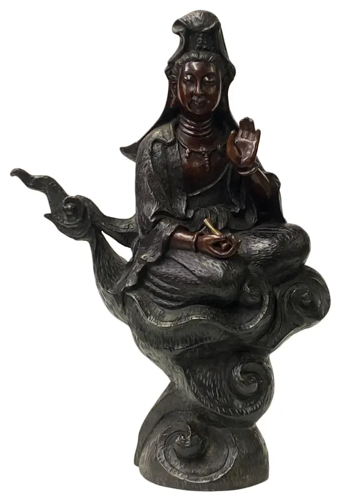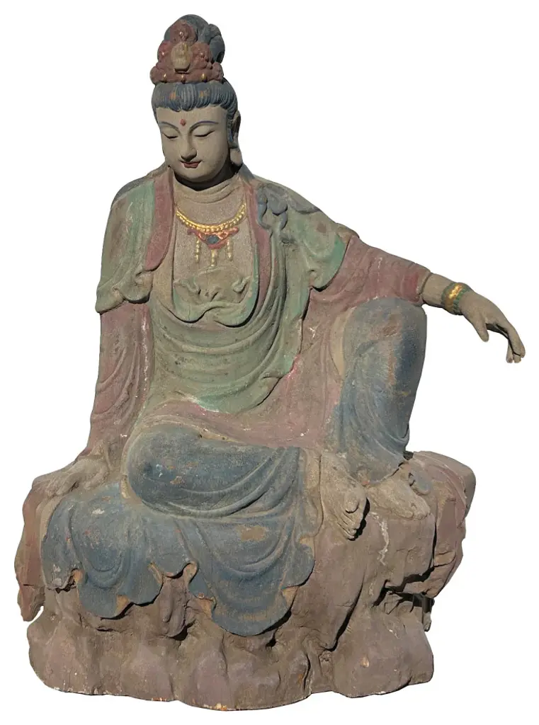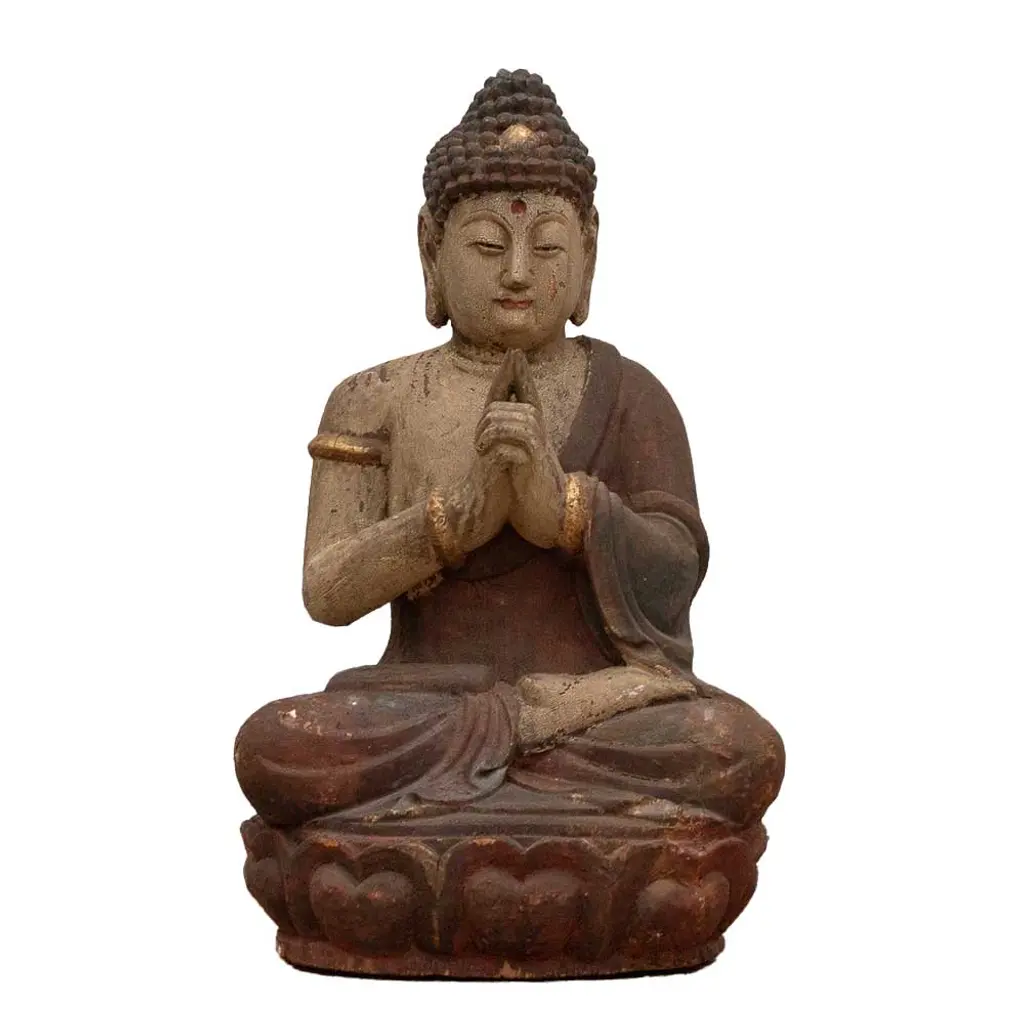 This is a Chinese rustic wooden Guan Yin Kwan Yin Bodhisattva cross leg Sitting Buddha statue. It is finished with a vintage rustic look. Wear-out crack marks on the body.Dimensions: 15" x 12"x h28"Origin: ChinaMaterial: WoodCondition: hand made, rustic finish, wood crack, chip off