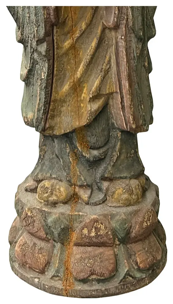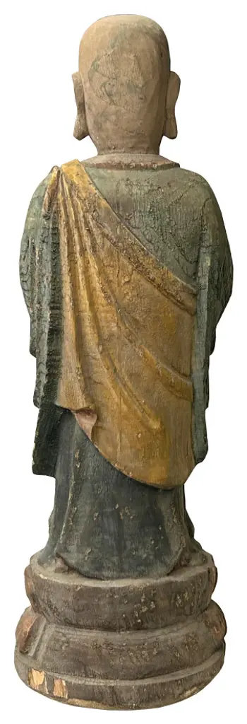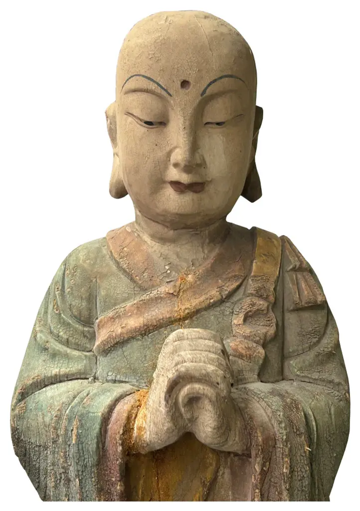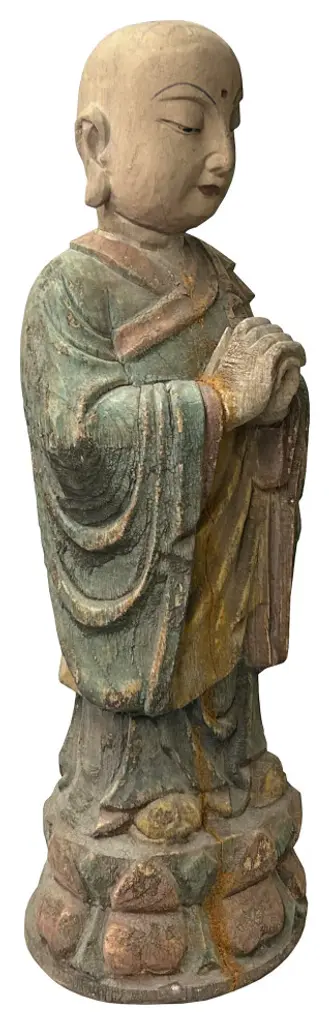 This Chinese rustic wooden statue, featuring a standing Lohon monk with prayer hands, exudes a serene and meditative presence. Carved from rich, natural wood, the statue highlights the raw beauty and organic texture of the material, showcasing intricate craftsmanship that brings out the monks tranquil and contemplative demeanor.The Lohon monk is depicted with hands elegantly positioned in a prayerful gesture, embodying a sense of peace and spiritual devotion. The detailed carving captures the subtle folds and contours of the monks robe, as well as the gentle expression of reverence on his face, creating a profound sense of calm and introspection.The rustic finish of the wood adds character and warmth, enhancing the statue''s natural and earthy charm. Ideal for meditation spaces, living rooms, or as a meaningful decorative piece, this statue serves as a reminder of spiritual mindfulness and the enduring essence of traditional Chinese artistry. Its timeless design and peaceful aura make it a compelling addition to any collection or interior space.Dimensions: dia 10"x h31.5"Origin: ChinaMaterial: WoodCondition: Handmade, rustic finish, wood crack, chip off
