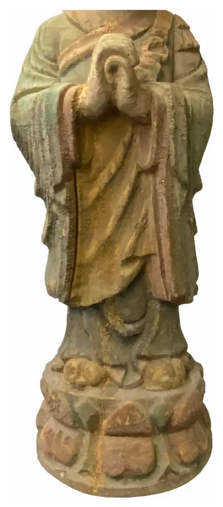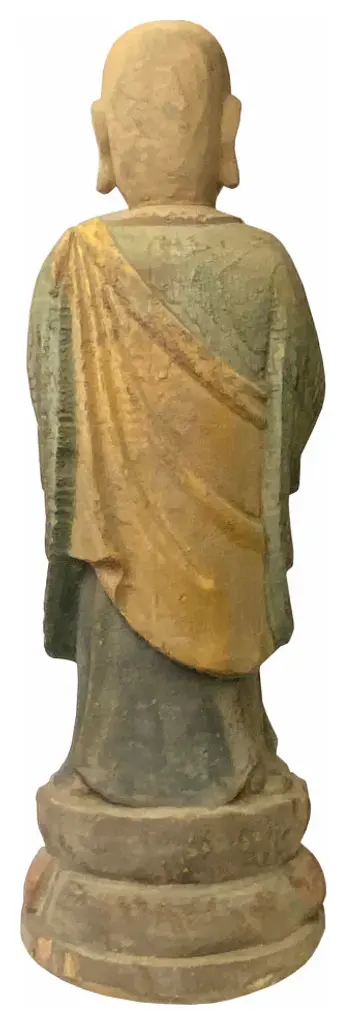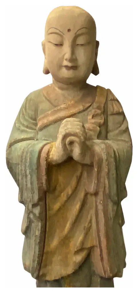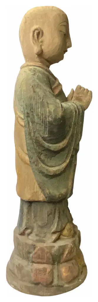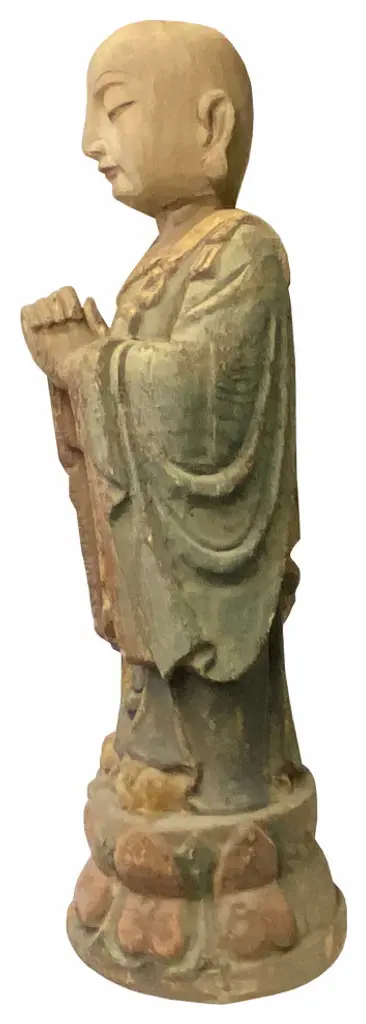 This is a Chinese decorative wooden standing praying Lohon monk statue. It is finished in a vintage rustic look.Dimensions: dia 10"x h31.5"Origin: ChinaMaterial: WoodCondition: Handmade, rustic finish, wood crack, chip off