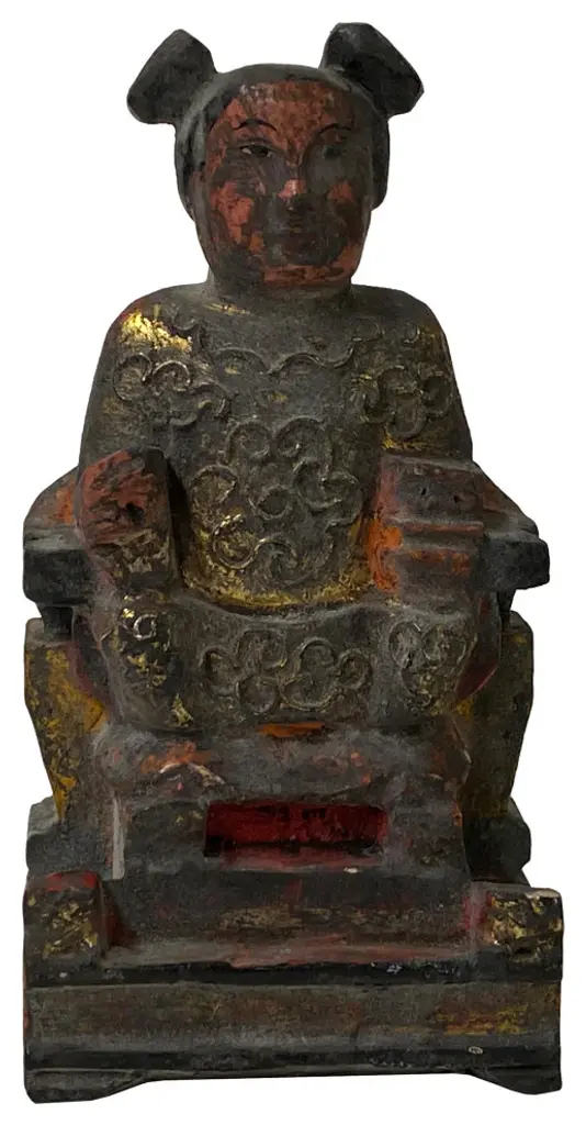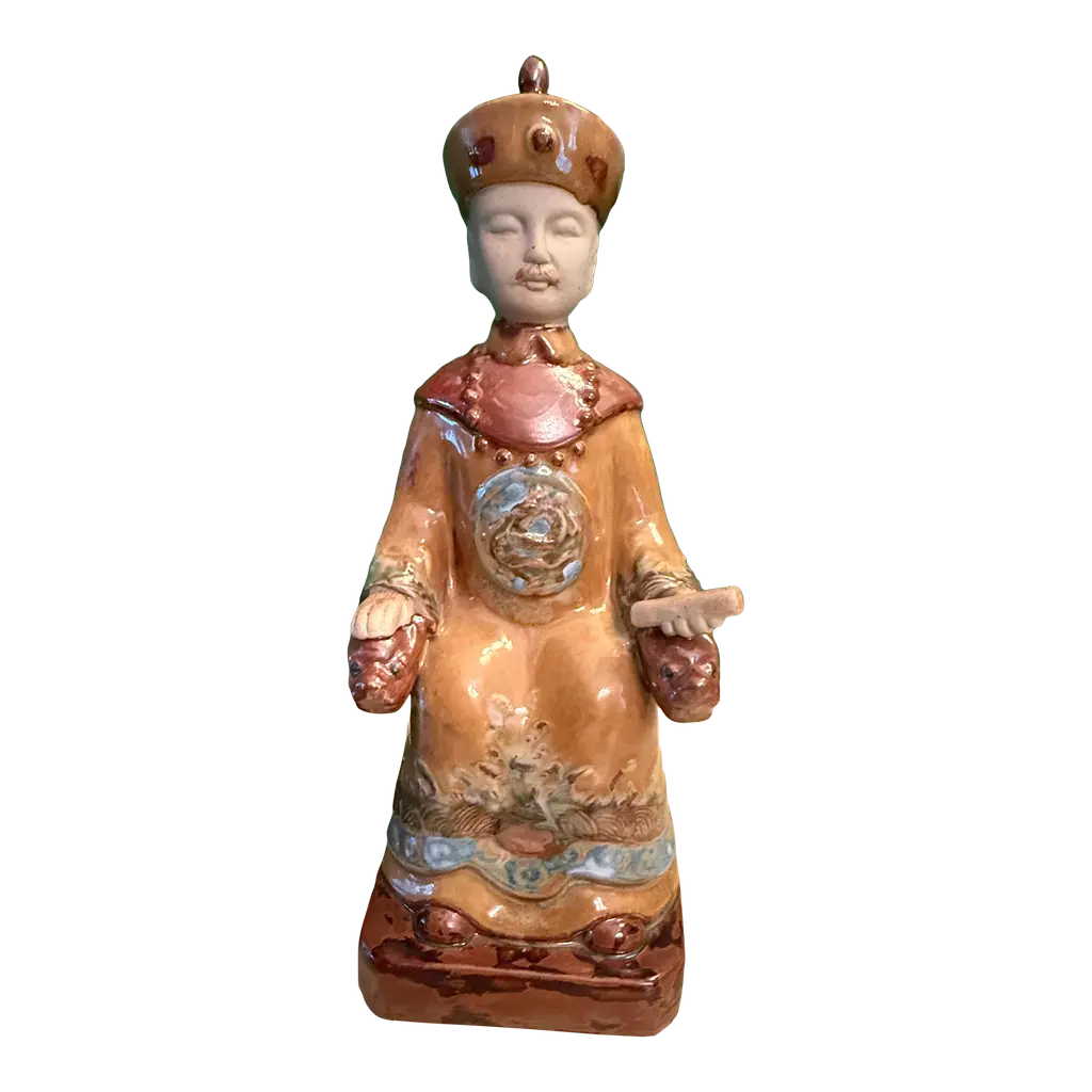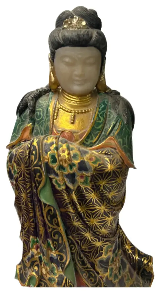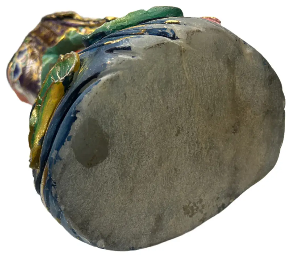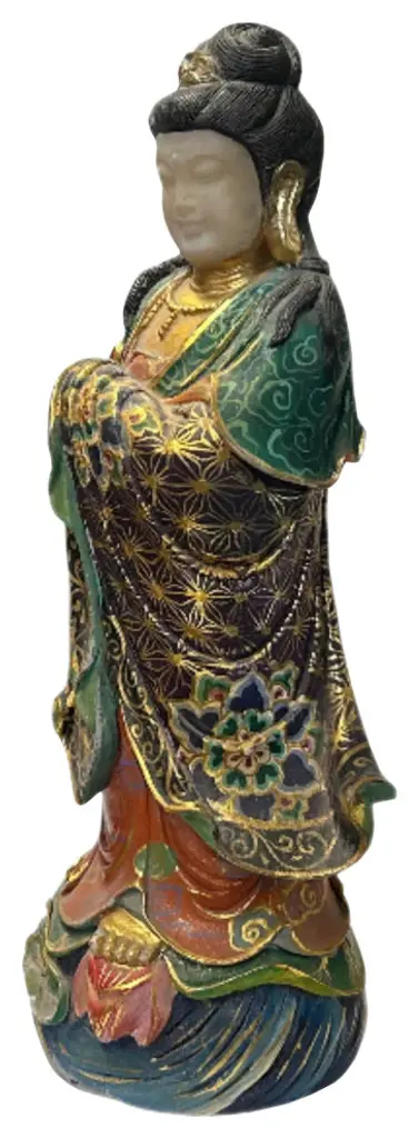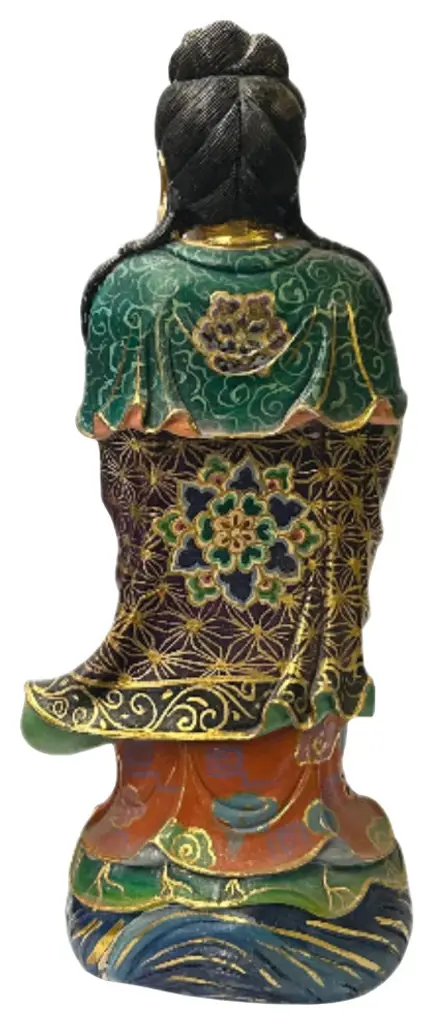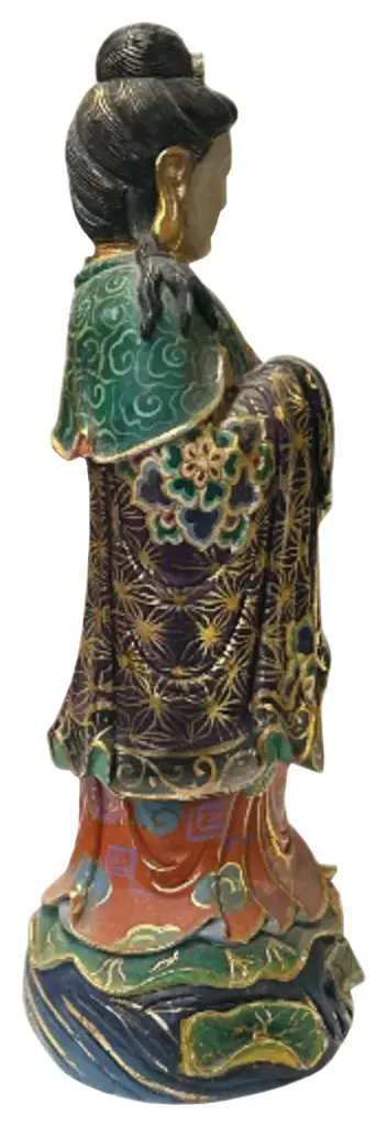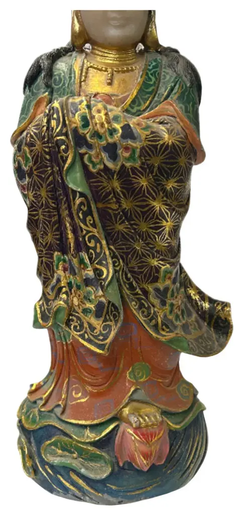 This intricately crafted figurine depicts a regal, standing figure, likely a deity or revered personage from East Asian culture, possibly Guanyin, the Buddhist bodhisattva of compassion. The statue is adorned in flowing, ornate robes that cascade elegantly around the body, painted in a rich palette of deep greens, vibrant reds, and shimmering golds, with delicate patterns of floral and geometric designs adding to its opulence. The base features a stylized lotus pedestal, a common symbol of purity and enlightenment, surrounded by swirling blue and green waves, enhancing the figure"™s serene and divine presence. The figure"™s hair is meticulously sculpted into an elaborate updo, crowned with a small decorative element, while the overall craftsmanship suggests a blend of traditional artistry and spiritual symbolism, making this piece a striking representation of cultural and religious heritage. Dimensions: Dia 8" x h18.5"Origin: ChinaMaterial: StoneCondition: hand made, minor color off, vintage style finish, Work: ship in one pieceUSA domestic continental buyers of 48 states pay $55 shipping (buyers of Hawaii, Alaska, US Islands, Florida Keywest, and Canada pays the extra shipping cost). Insurance and handling charges are already included in the shipping cost. In store pick up is highly welcomed if you are in San Francisco Bay Area. (No charge)