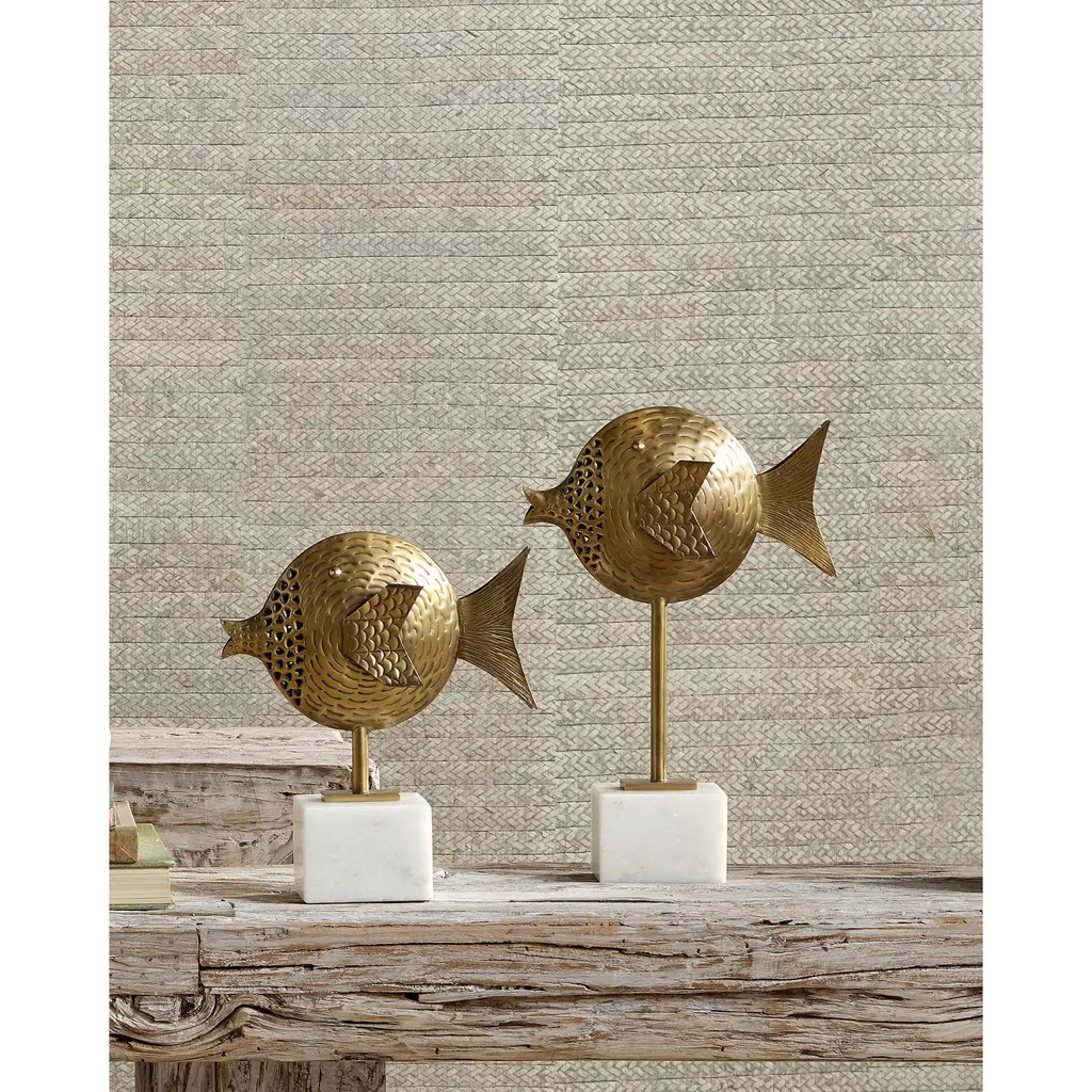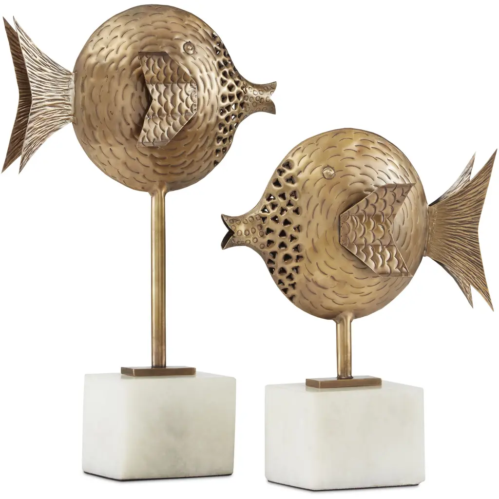 Handmade from brass to look like found objects unearthed in an exotic bazaar, the Cici Brass Fish Set includes one tall and one short fish in antique brass finishes. The artful creations extend from white marble bases that contrast the warmth of the brass fish sculptures.
