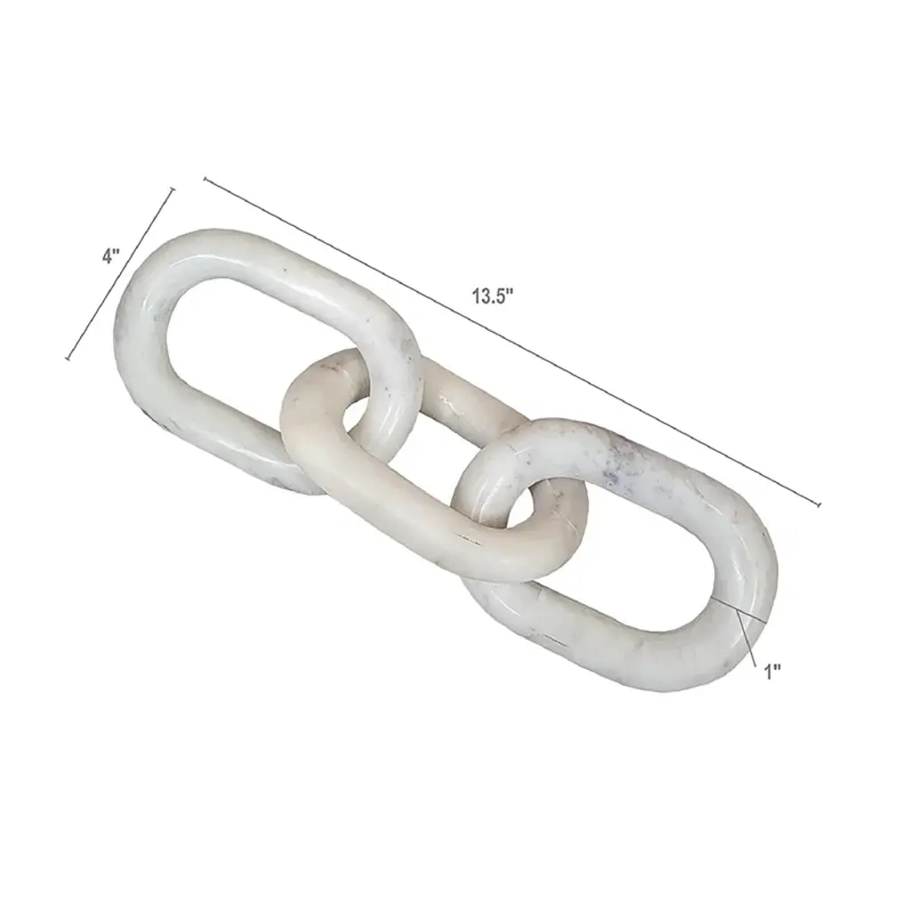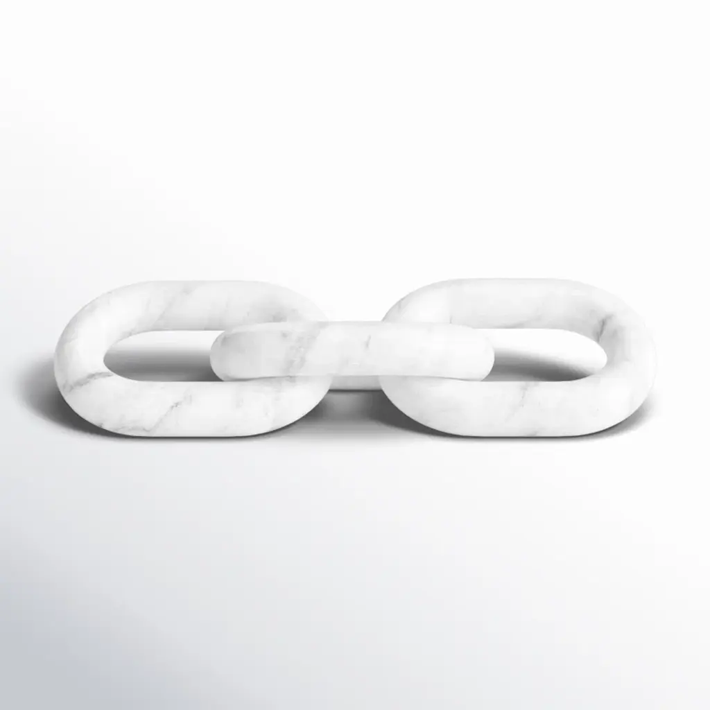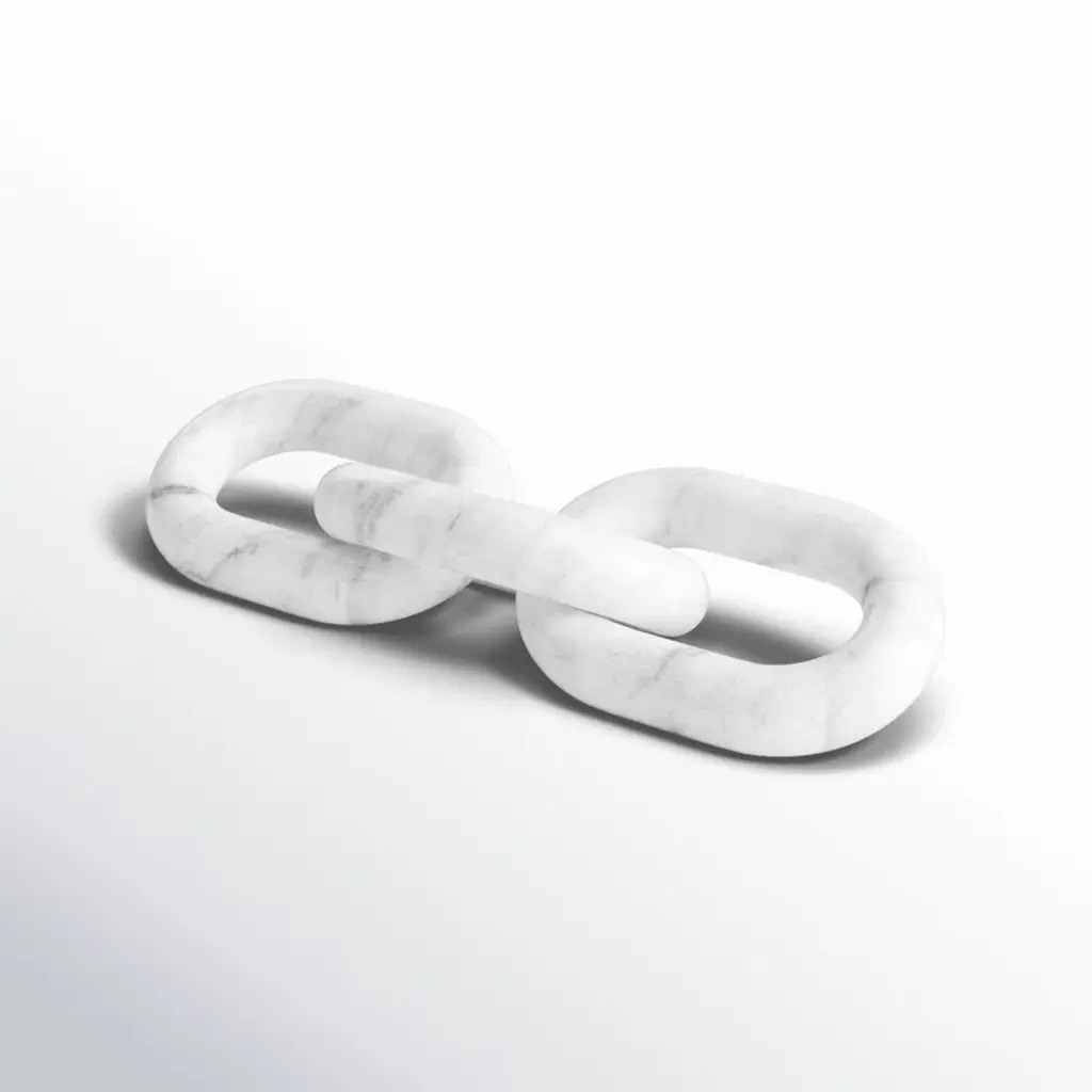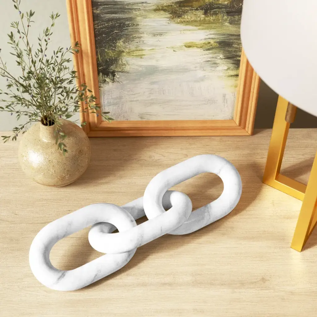 Add eye-catching style and a subtle industrial feel to your office, living room, or entryway with this unique sculpture. Crafted from marble, this piece features three carved oval shapes interlocking to create three chain links. The marble shows off a solid white hue scattered with delicate gray veins, the refined material contrasting with the streamlined and contemporary chain construction. Arrange the chains on your end table, mantelpiece, or desk for a touch of visual dimension. This piece measures 1'' high and 14'' long, and it weighs a sturdy 3 lbs., so it works as a paperweight.