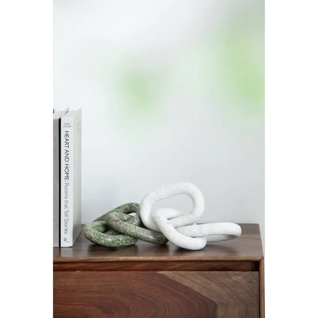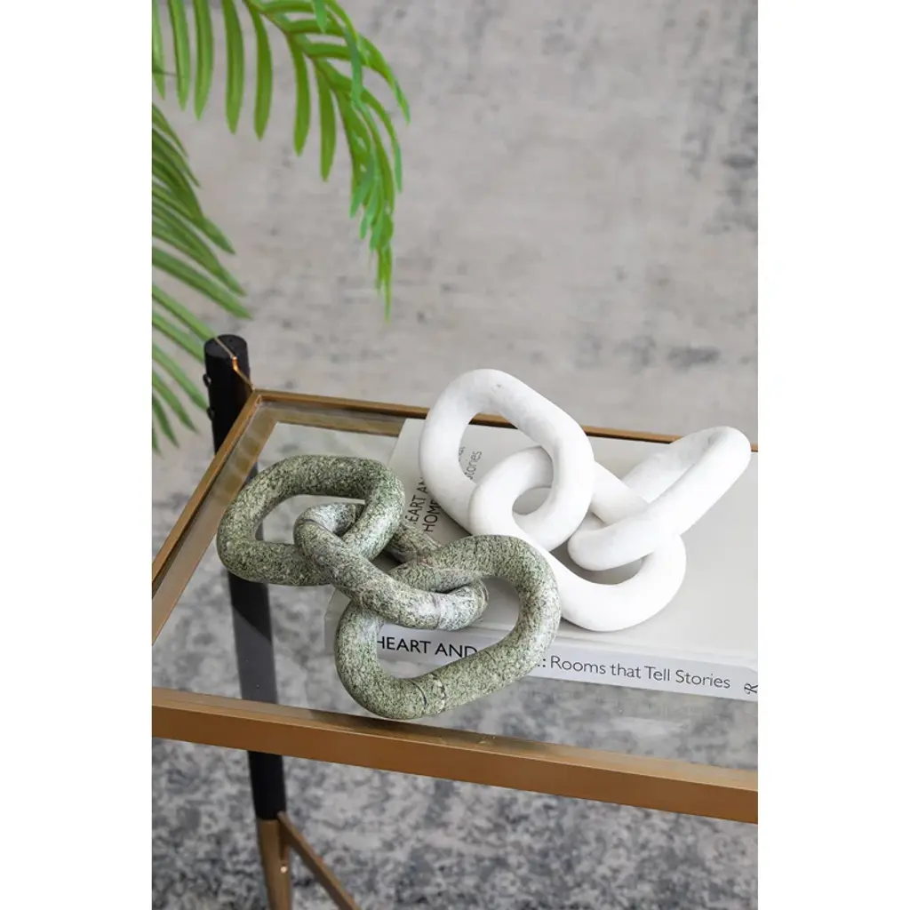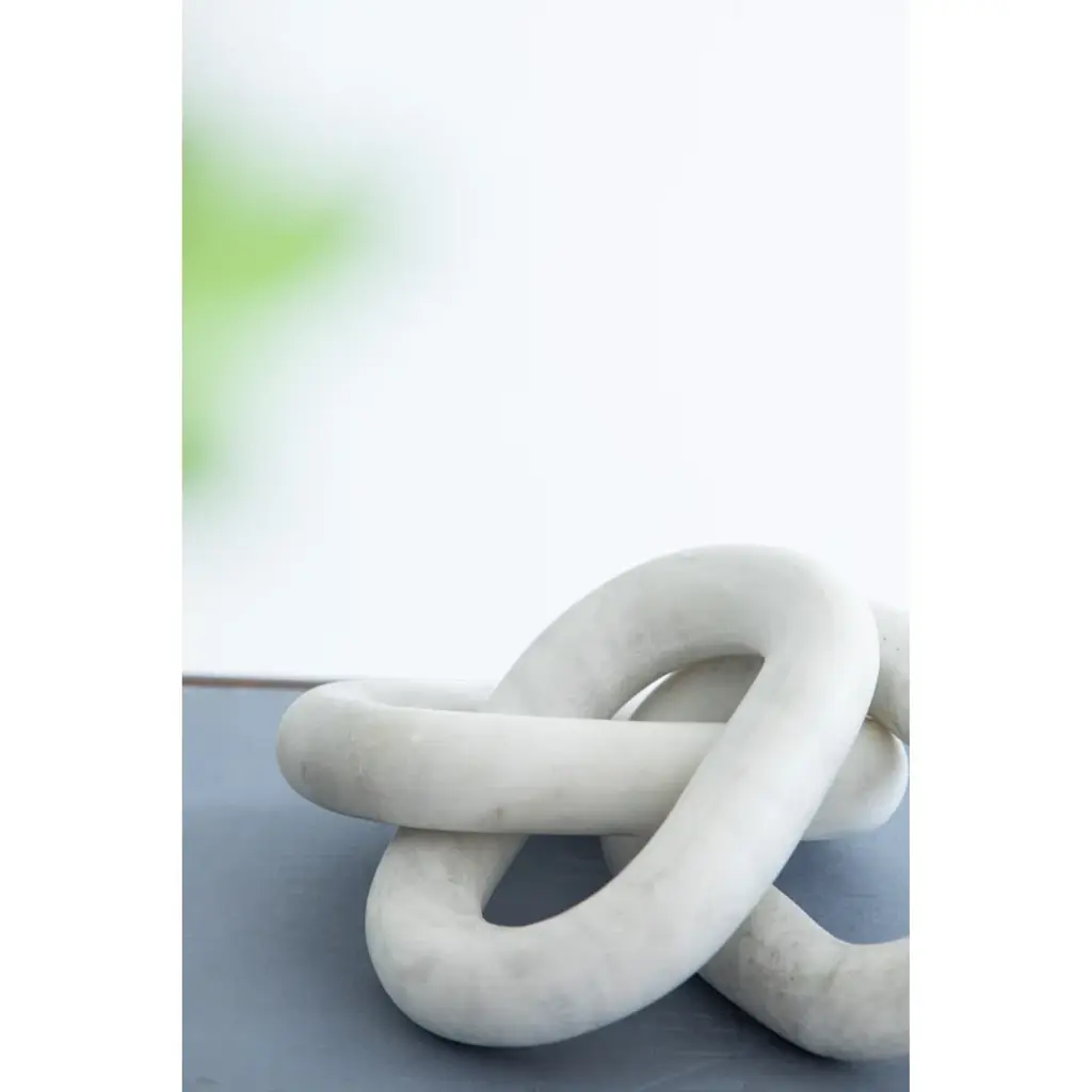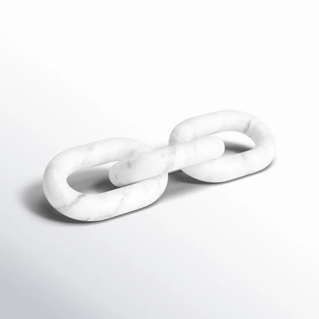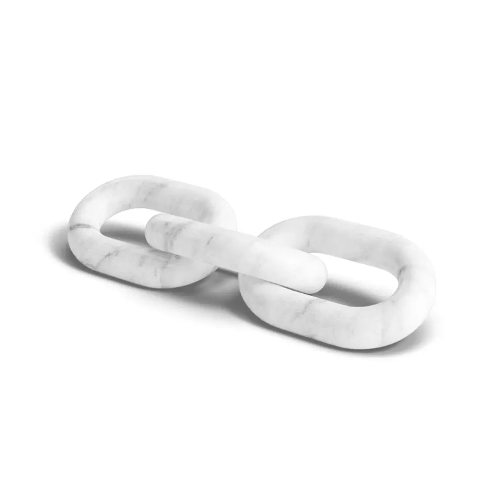 Add eye-catching style and a subtle industrial feel to your office, living room, or entryway with this unique sculpture. Crafted from marble, this piece features three carved oval shapes interlocking to create three chain links. The marble shows off a solid white hue scattered with delicate gray veins, the refined material contrasting with the streamlined and contemporary chain construction. Arrange the chains on your end table, mantelpiece, or desk for a touch of visual dimension. This piece measures 1'' high and 14'' long, and it weighs a sturdy 3 lbs., so it works as a paperweight.