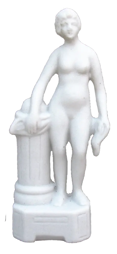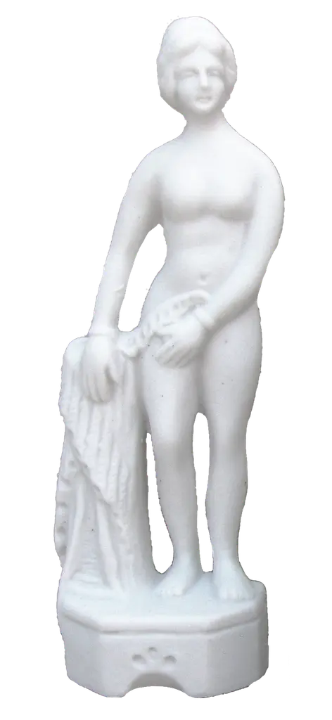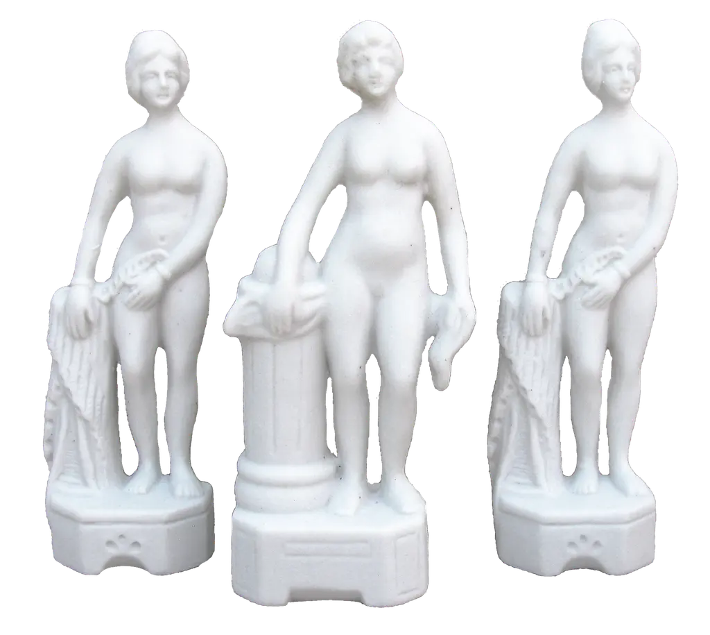 Trio of petite bisque porcelain female maquettes in the classical manner. Two of one pose and one of another. We have several sets listed, all acquired from a high-end estate. Incised mark on plinth base "Made in Japan". Dimensions: single, 2"W x 1.25"D x 4.4"H; pair (each)' 1.4"W x 1"D x 4.4"H. Excellent vintage condition. We have multiple sets and are happy to combine shipments. Free local pickup; otherwise shipped via economical USPS parcel post.