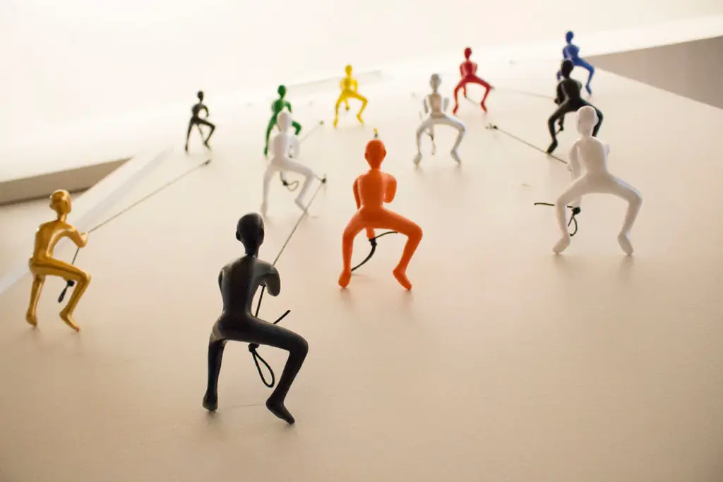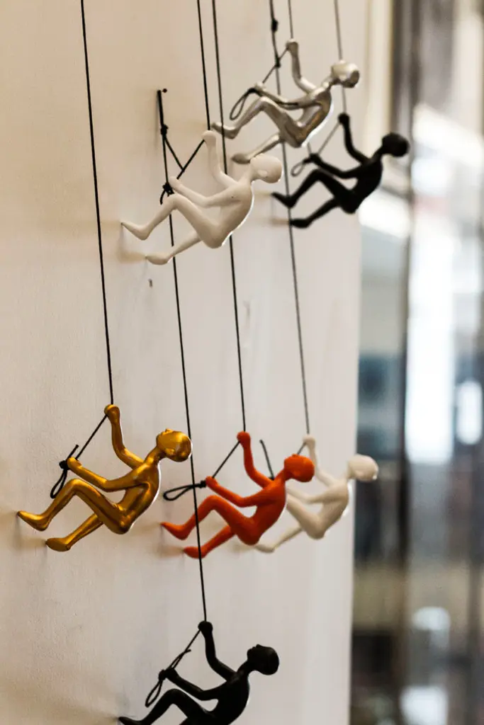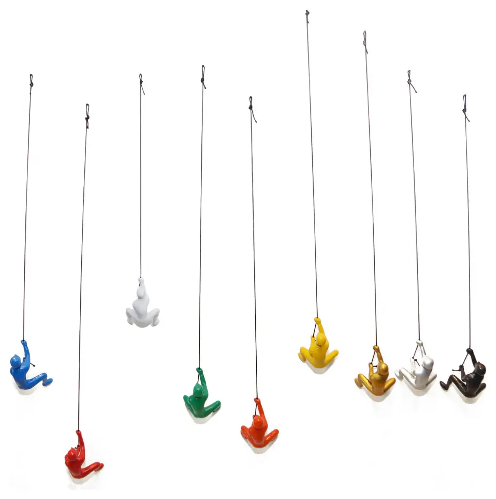 Wall-mount sculpture of a man climbing a leathered rope for distinctive decor accent. Crafted from Resin. Comes with a twisted loop knot for easy installation.