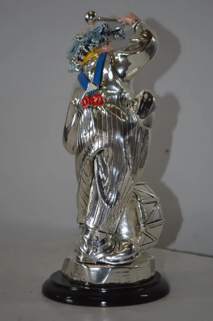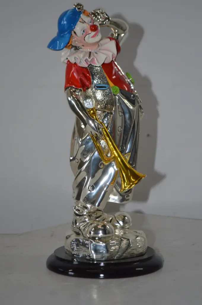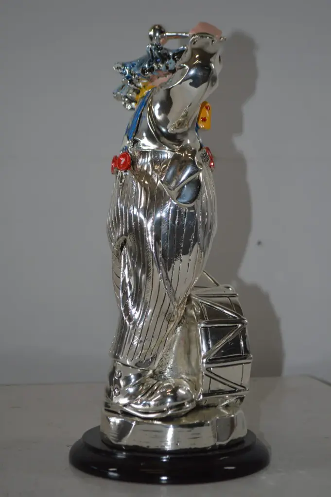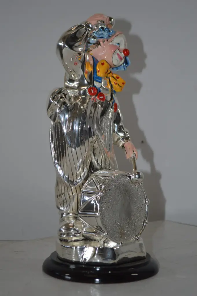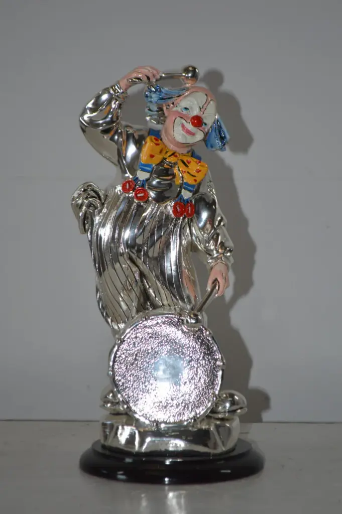 Clown Plays The Drams Resin Statue Silver Finish - Size: 6"l X 6"w X 16"h.