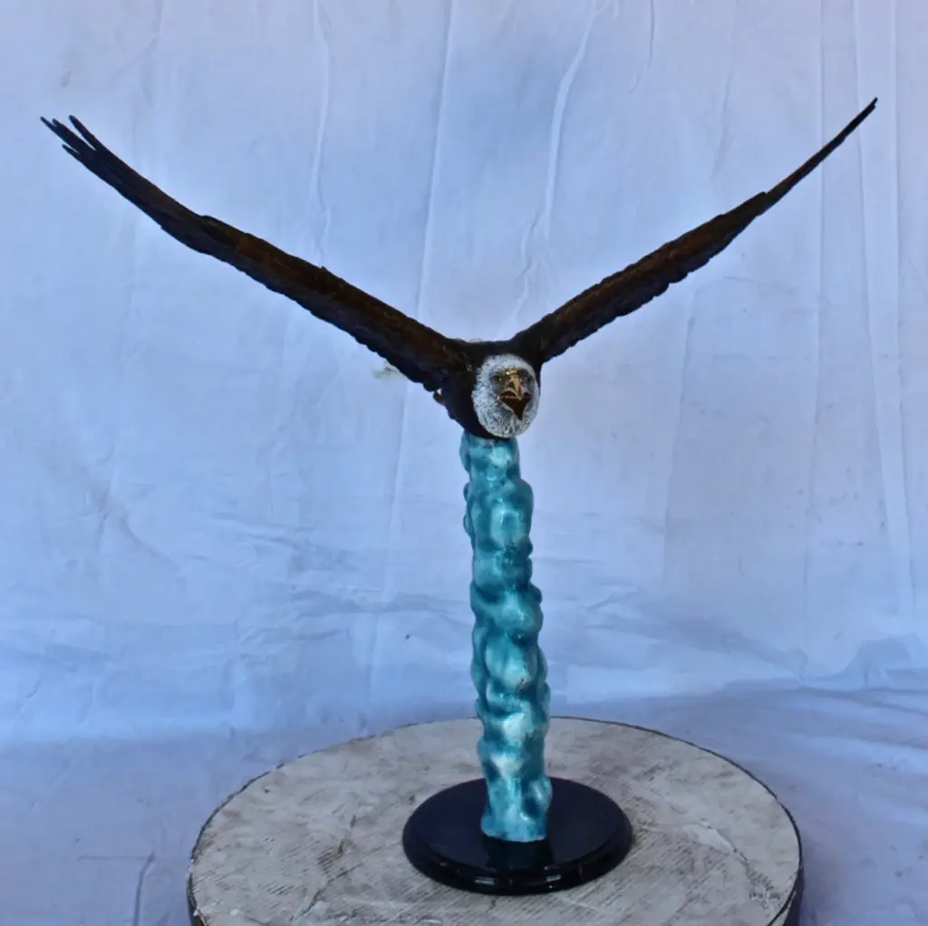 Purchase this beautiful bronze statue to make a bold statement in any room of your choosing. The soaring eagle is a symbol of confidence and pride, soaring above the rest in this statue, with a patina chosen through a mix of hand finishing with different colors and Polychrome techniques also referred to as enameling over bronze. Sitting on a sturdy marble base, this piece does not lack any detail. Size: 32"L x 18"W x 29"H. Weight is: 29Lb