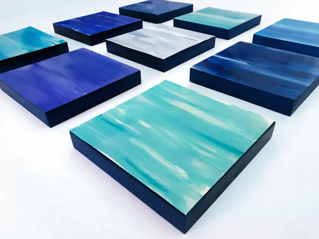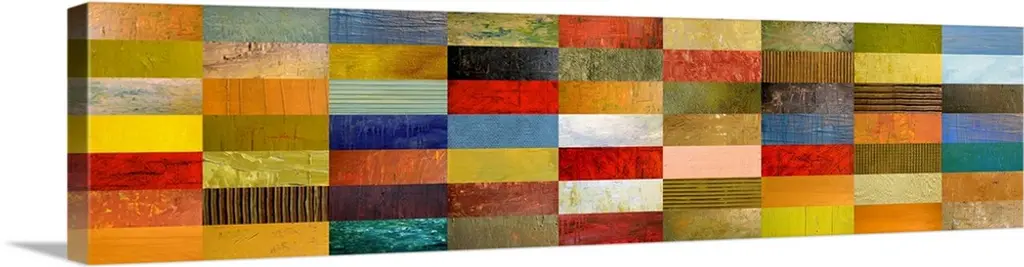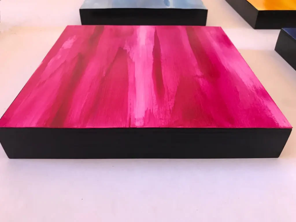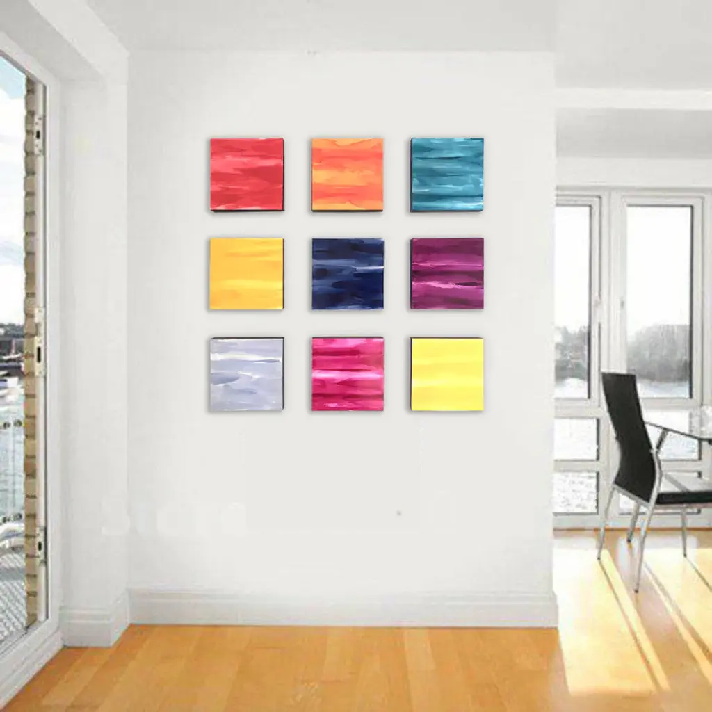 Add wow factor home, office lobby or medical office waiting room with this super colorful Wall of Color customizable wall sculpture. This artwork will brighten up any space, with its happy color. The painted black sides really make the colors pop.This particular design consists of nine 10"� x 10"� x 1.5"� wood panels each painted with a bright abstract monochromatic landscape in layers of paint hand painted by me. A super durable glossy finish is added to seal them.The black painted sides act as a contrast between the wall and the color and really do make the installation an eye-catcher. The wood panels are open in the back for easy hanging.•Size for this design: 38" x 38" x 1.5 with 4"œ spacing•Nine panels in this installation •Sturdy wood panels are 10"� x 10"� x 1.5"� •Wood panels sides are painted black•Ready to hang, comes with hanging layout for nail placement•Orientation: horizontal or vertical