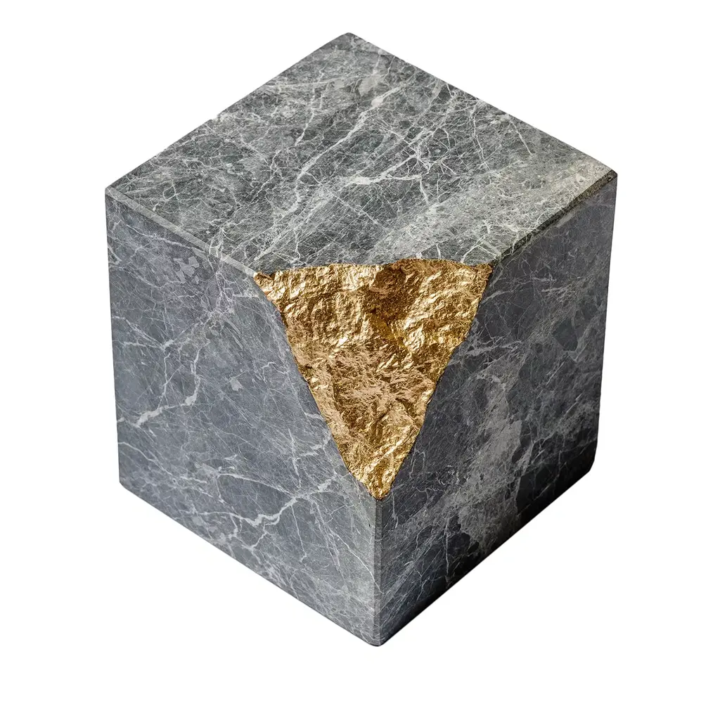 A decorative piece offered in a deliberately dismantled design, this cubic sculpture belongs to the Colpo Da Maestro Collection of objects that are an invitation to reflect on the singularity of gestures made in the sculpting process. The single moment that led to the break of its corner is ennobled through the presence of its metallic complementary element.