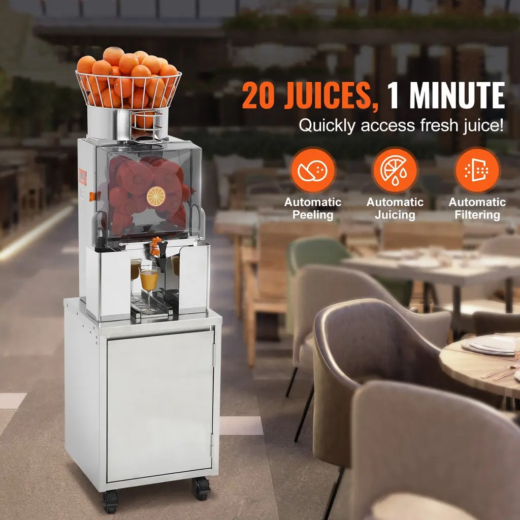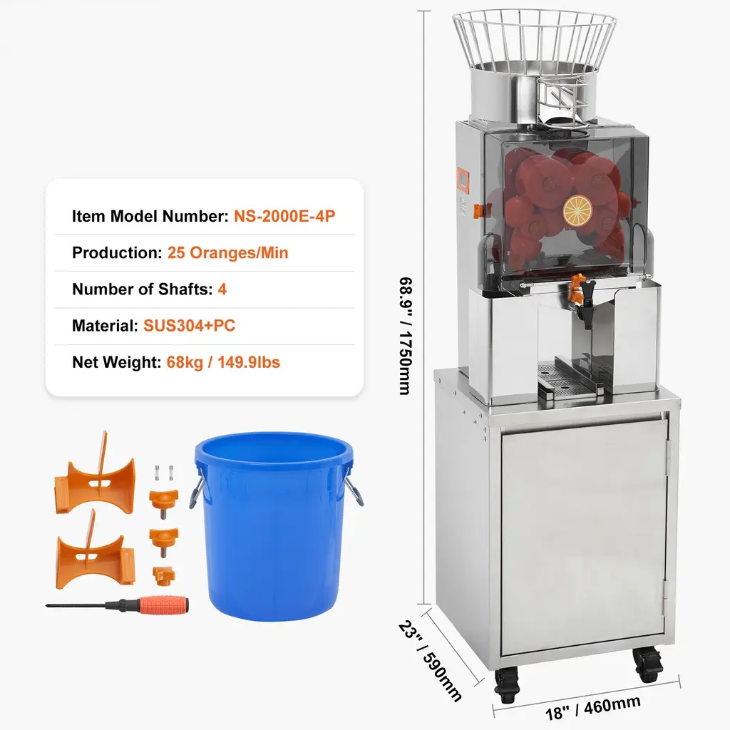 Efficient Squeezing: Our commercial orange juice machine combines automatic peeling, juicing, and filtering. Equipped with a robust 120W motor, the commercial orange juicer can effortlessly extract juice from up to 25 oranges per minute. The upgraded concave-convex balls further enhance juice production. Large Feed Chute: With a spacious feed chute that accommodates oranges ranging from 55-80mm (2.2"-3.2"), this orange juicer machine simplifies the juicing process. Additionally, the top storage basket allows you to store a substantial quantity of pre-washed oranges, reducing the need for frequent preparation. The water tap design provides precise flow control, preventing any unnecessary juice wastage. Easy to Clean: Crafted from food-grade SUS304 stainless steel and high-quality PC, our commercial juicer machine ensures the utmost hygiene. Most components are detachable and easy to clean, and the pull-out filter design facilitates thorough cleaning, preserving the pure taste of your juice. Safety Features: The transparent protective cover of the automatic feeding juice machine not only adds aesthetic appeal but also houses a pressure sensor that halts operation when the cover is removed, providing comprehensive protection. Versatile Usage: This commercial juice maker machine includes a set of replacement parts for your convenience. It finds applications in a wide range of settings, including grocery stores, restaurants, fruit shops, cantinas, gym clubs, beverage outlets, bars, offices, and more. Package Content 1 x Commercial Orange Juicer 2 x Peeler 2 x Tightening Screws 1 x Four-Point Star Screw 1 x Instruction Manual 1 x Phillips Screwdriver 2 x Fuses
