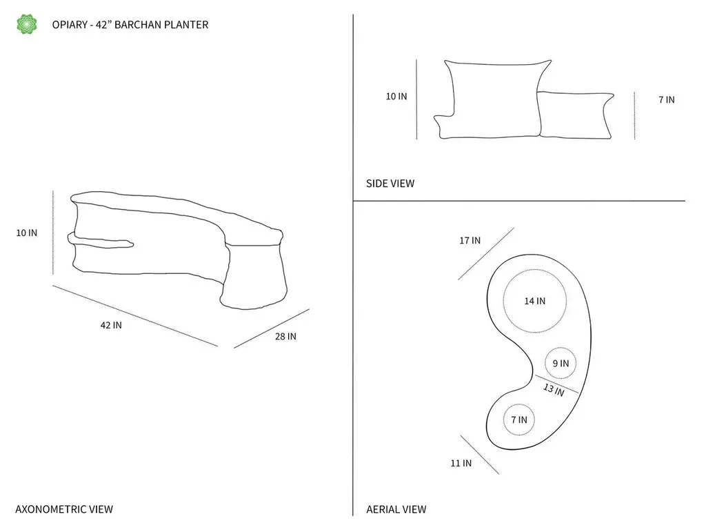 Opiary is a Brooklyn-based biophilic design and production studio. We integrate nature in each of our designs, incorporating live greenery and organic shapes into bespoke furniture, planters, and sculpture. Through the ethos of biophilia, our work reflects the shifting, yet timeless relationship between humans and nature.This modern, lightweight concrete planter features an organic silhouette and earthy aesthetic that compliments the live plants inside it. The Barchan is handmade in our Brooklyn studio and can be produced in the color or finish of your choice. Opiary planters come in various forms-- some fill more vertical space while others are horizontal. We recommend pairing the Echelon with Barchan and Jabbah planters for maximum design impact. All planters can float on hidden casters to make rearranging your space easy.DETAILSMeasures L42", W28", H10".Indoor/outdoor use and extremely weather-resistant.Option to be watertight or include drainage holesFINISHESAvailable in earth, white, light grey, grey, dark grey, and black GFRC Pricing varies based on finish. Please message before purchasingPrice listed is for our standard light grey optionPictured here in our grey cement optionAll Opiary pieces are handcrafted and made-to-order, and dimensions/finishes are approximations. Clients are welcome to visit our Brooklyn studio during the fabrication of pieces.MODIFICATIONSIntegrated casters available for an additional cost. Live or silk plants included for an additional cost.Custom sizes available upon request.
