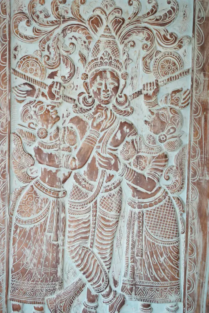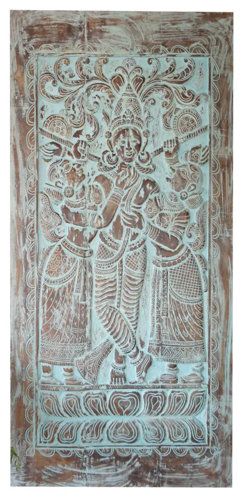 Bring in wellness to your home or spa with Krishna carved wood wall sculpture. Your house is an extension of your personality, always changing, never staying still, the bohemian wanderlust spirit reaches deep within the soul. Be it a stunning wall carving, intricately carved by artisans, beautiful patinas, and worn with time Carved with beautiful floral designs and patinas of the desert the vintage doors add character to your home. You are looking at beautiful handmade and exceptional design, as unique as the artisan who carved it.Handcarved by artisans in reclaimed vintage woods, the carving has bracing woods in the back. The joints and crevices add to the uniqueness of each carving.The carved door is pieced together from old vintage woods and has 3 supporting slats in the back, the back is rustic and not carvedEra - 2000, handmade from Vintage woodsCountry of Origin- IndiaWe are happy to provide any extra pictures need so as to make the transaction seemless, our items are unique , handmade and one of a kind, please do reach out to us for your custom needs as well. Item is blanket wrapped and delivery is doorstep so please do check before signing off.84x42x1.5 incheswood-3551
