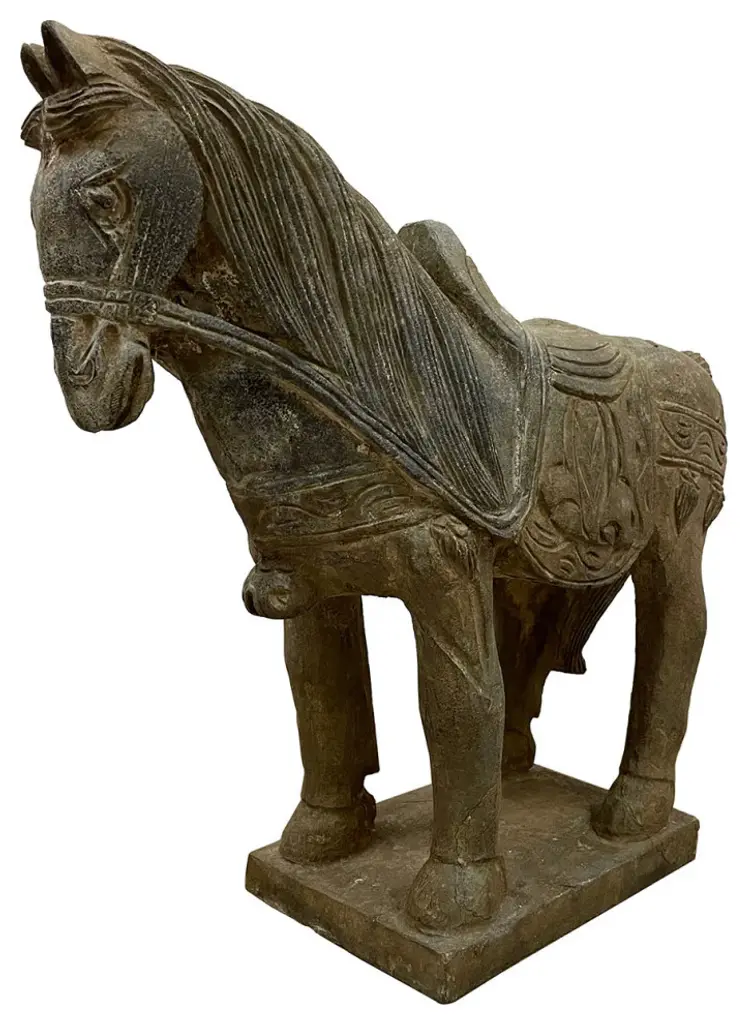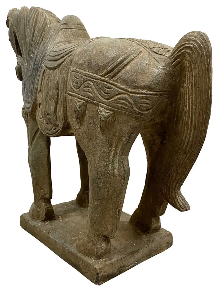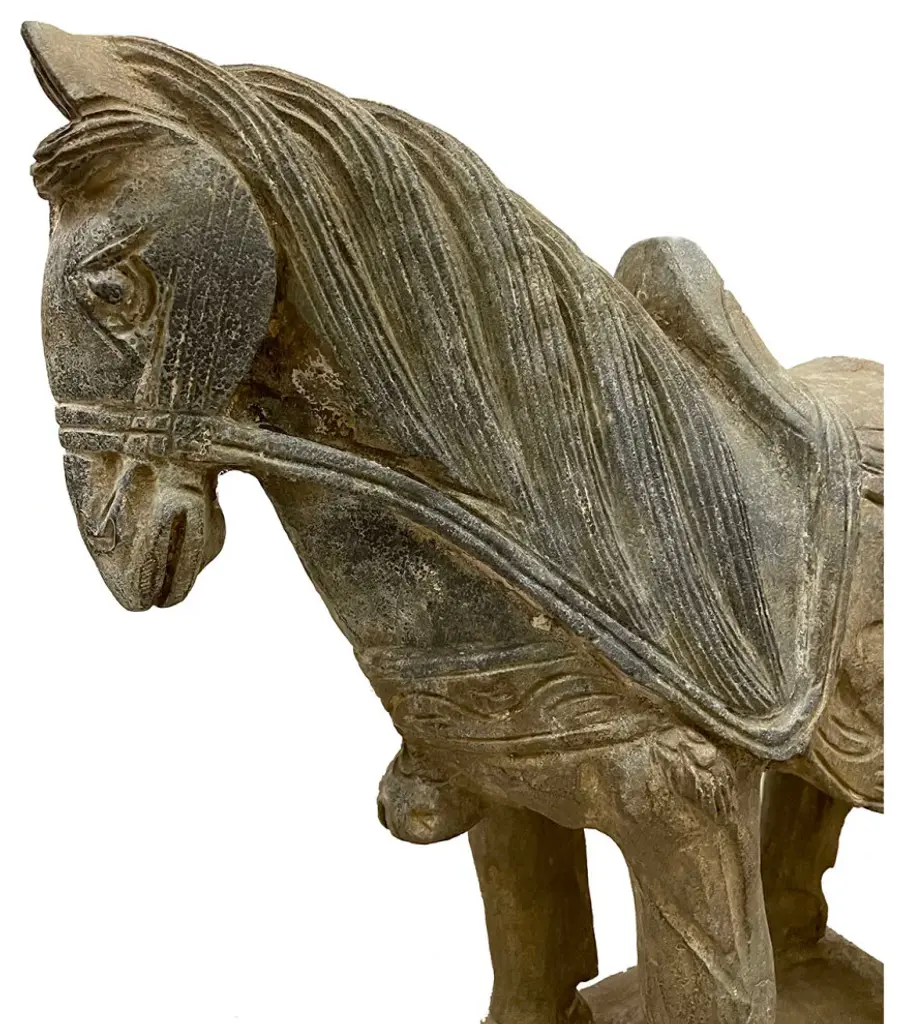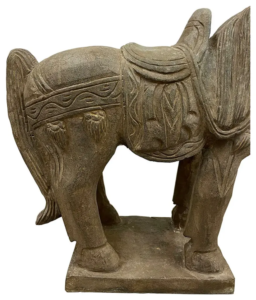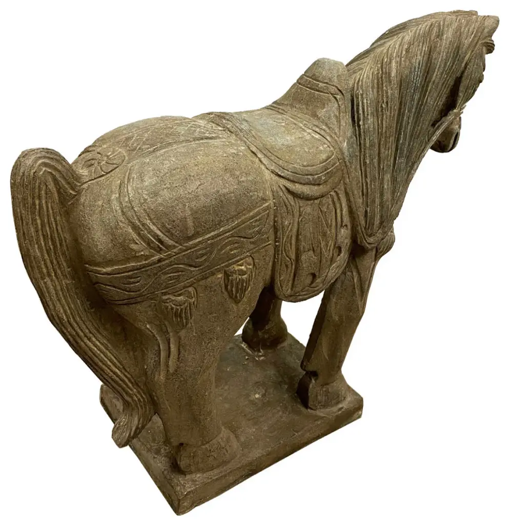 This vintage Chinese noble steed horse sculpture is hand craft with exquisite detail which was very common in horse sculptures crafted during the Tang Dynasty. Especially for imperial family use. This sculpture is replica from early 20th Century using solid stone with very detailed hand craft works which reflects the great respective of the Chinese people have for the horses. It is a perfect decoration piece for indoor or outdoor garden use.Size: 20in H x 22.5in W x 7.5in DOrigin: ChinaCirca: 1900 - 1940Material: StoneWeight: 84 LBsCondition: Original finished, hand carved, heavy, normal age wear.Disclaimer: Due to differences in monitor/screen settings, product colors may differ slightly between product photos and the physical product.