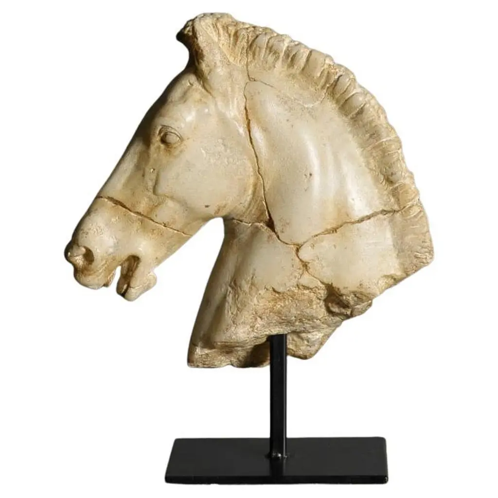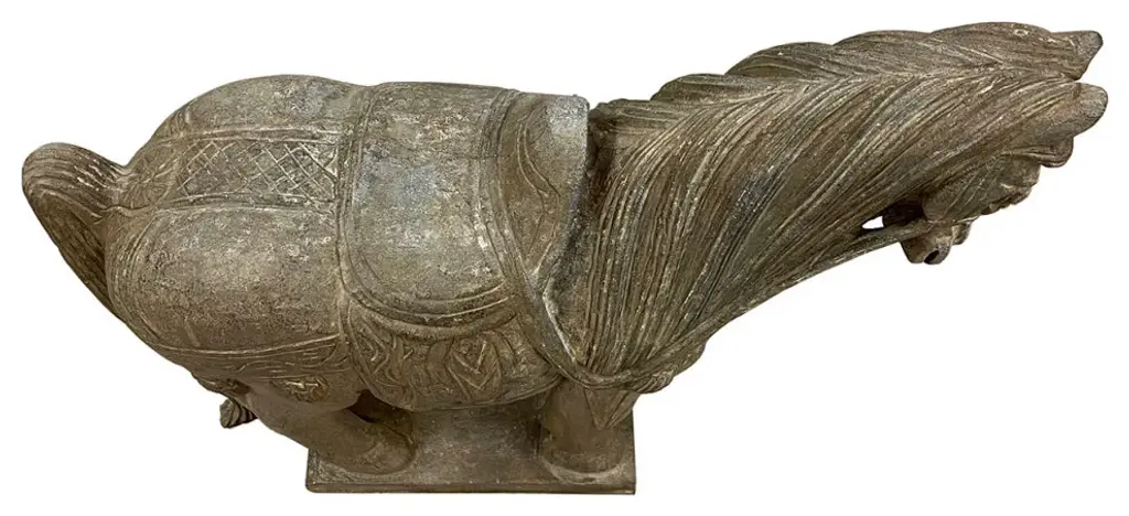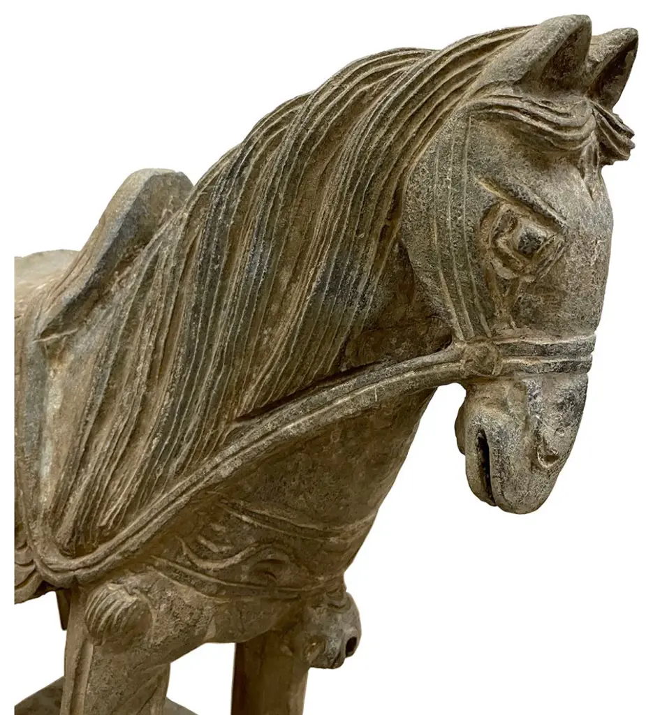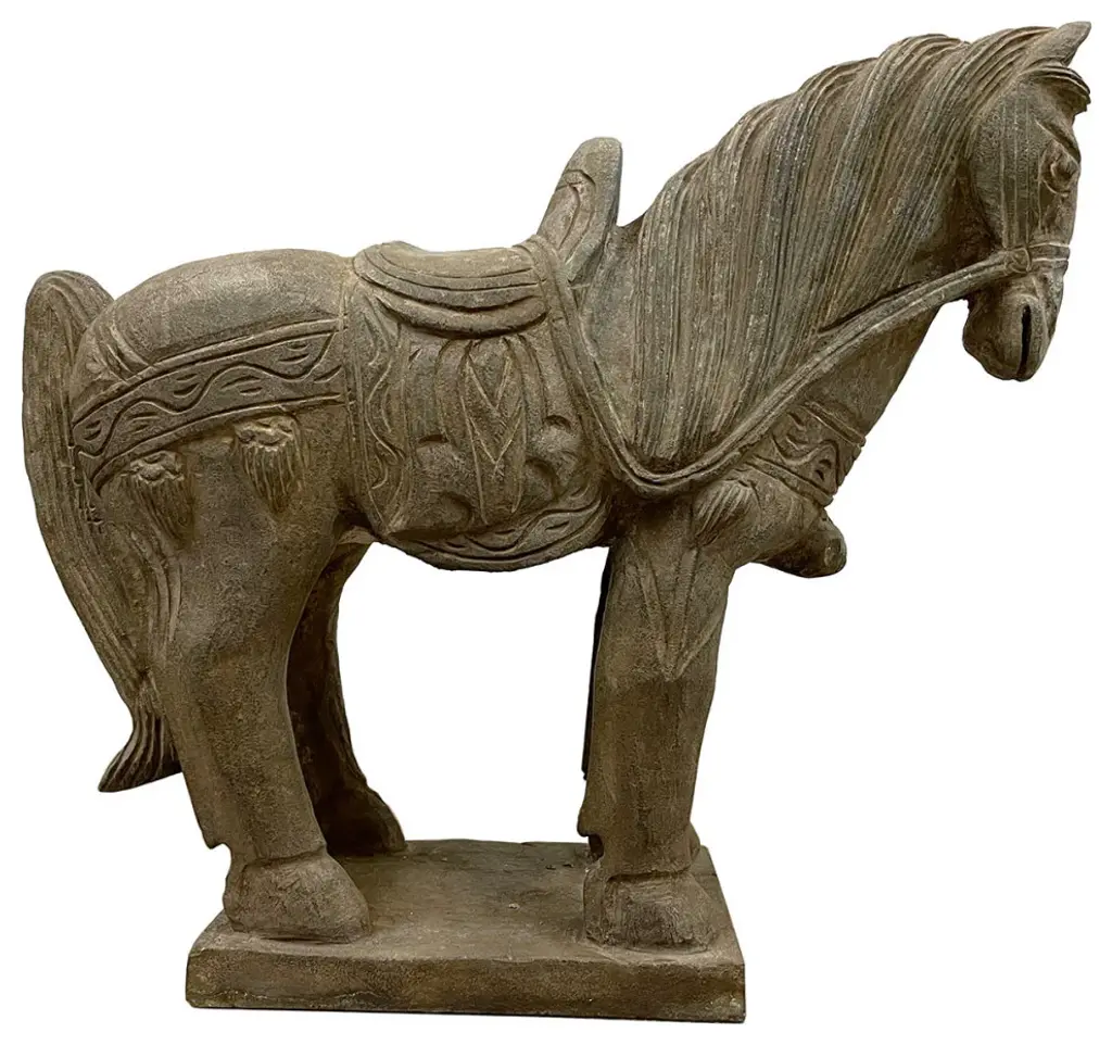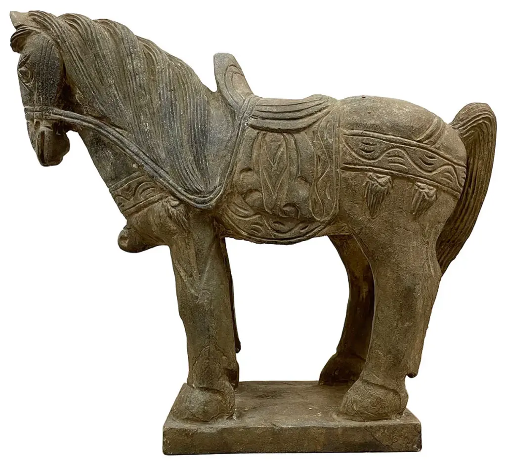This vintage Chinese noble steed horse sculpture is hand craft with exquisite detail which was very common in horse sculptures crafted during the Tang Dynasty. Especially for imperial family use. This sculpture is replica from early 20th Century using solid stone with very detailed hand craft works which reflects the great respective of the Chinese people have for the horses. It is a perfect decoration piece for indoor or outdoor garden use.Size: 20in H x 22.5in W x 7.5in DOrigin: ChinaCirca: 1900 - 1940Material: StoneWeight: 84 LBsCondition: Original finished, hand carved, heavy, normal age wear.Disclaimer: Due to differences in monitor/screen settings, product colors may differ slightly between product photos and the physical product.
