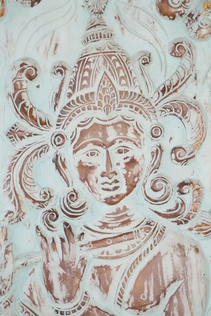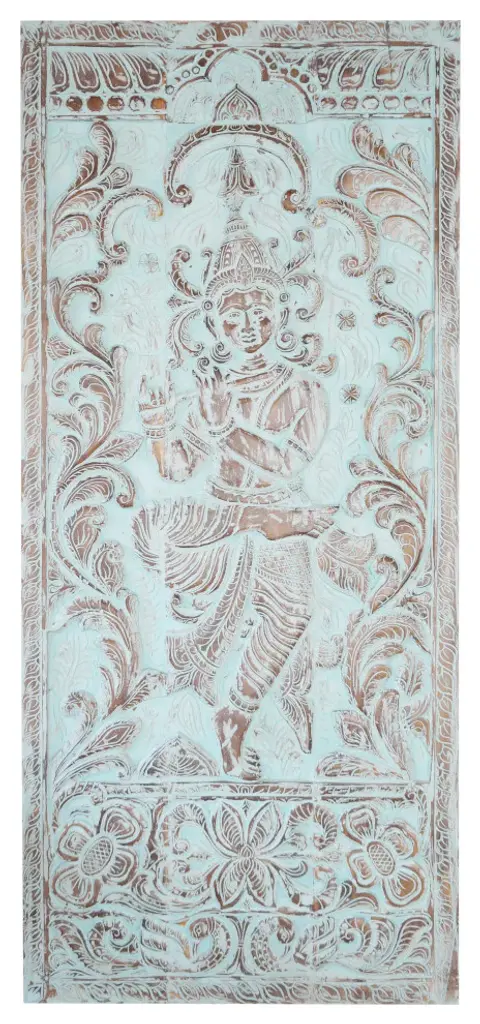 Consigned Fluting Krishna Wall Carving Turquoise Vintage Wood Sliding Barn Door