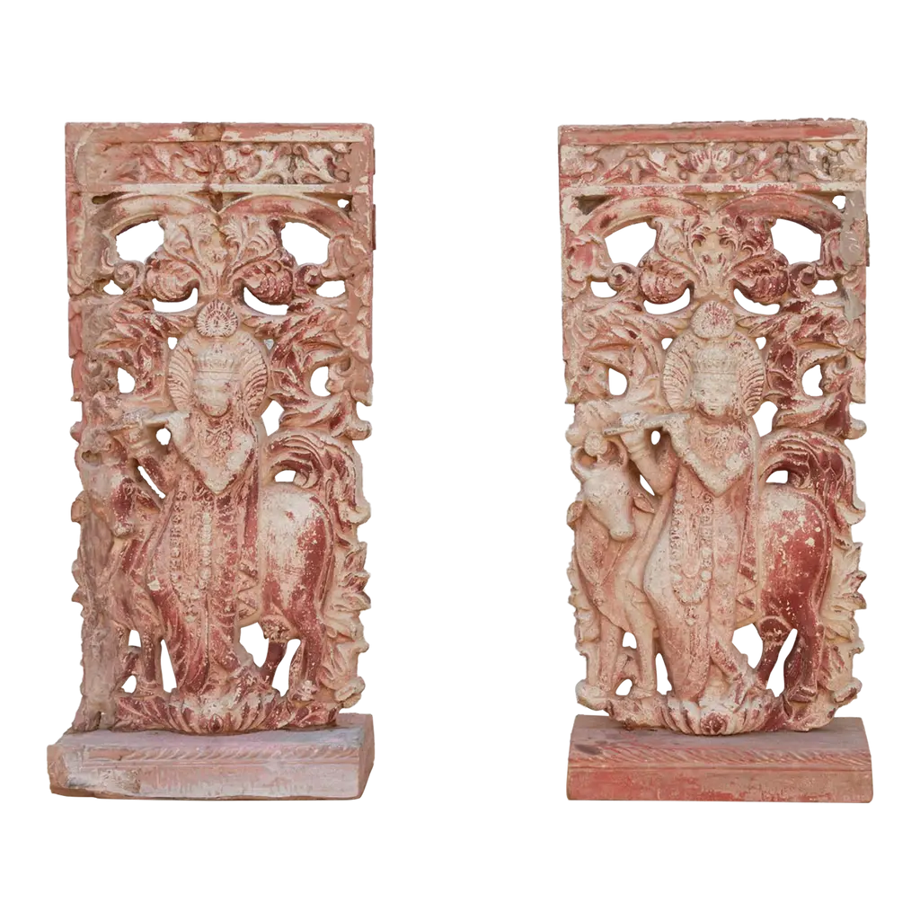 Handcarved Fluting Krishna carving captures the essence of zen and serenity. Imagine entering a room adorned with this Vintage Hand Carved Wall Sculpture, where every glance at the statement Art transports you to a world of clmness. The intricate details of Krishna playing his flute , surrounded by nature and flowering blooms, evoke a sense of peace and tranquility"”a reminder of the beauty that lies within us all.The old world carved doors make your space look roomy and unique, and optimizes the utilization of space in a practical way for the bathroom and bedroom. The custom made reclaimed wood doors slide directly on to the wall and give you plenty of space on either side as well as the artistic design element. You are looking at beautiful handmade and exceptional design, as unique as the artisan who carved it.Exterior Dimensions : 83x36x1.5inchesHARDWARE NOT INCLUDEDThe carved door is pieced together from old vintage woods.Era - 2000, handmade from Vintage woods country of Origin- Indiawood-3505