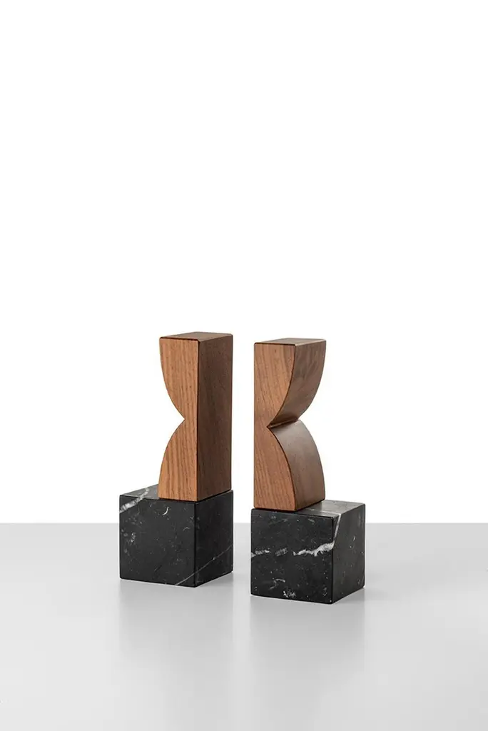 Constantin 1 is a simple but charming bookend couple with a geometric shape. The body is in Marquina black marble. The top in solid Canaletto walnut. A perfect present, closed in an elegant gift box.Constantin collection owes its name to its inspirer. It is in fact the modern art of Constantin Brancusi that has guided the designer’s hand to conceive candelabra, bookends, containers and centre pieces in wood, marble and brass. Taking up Brancusi ability to represent the essence of things with a high degree of abstraction, designer Agustina Bottoni has shaped the candlesticks and bookends thinking of the columns and bases of Brancusi famous sculptures. For the container and centerpiece she has been inspired instead by the works in which almost raw solid wood is contrasted with polished and mirrored metal.